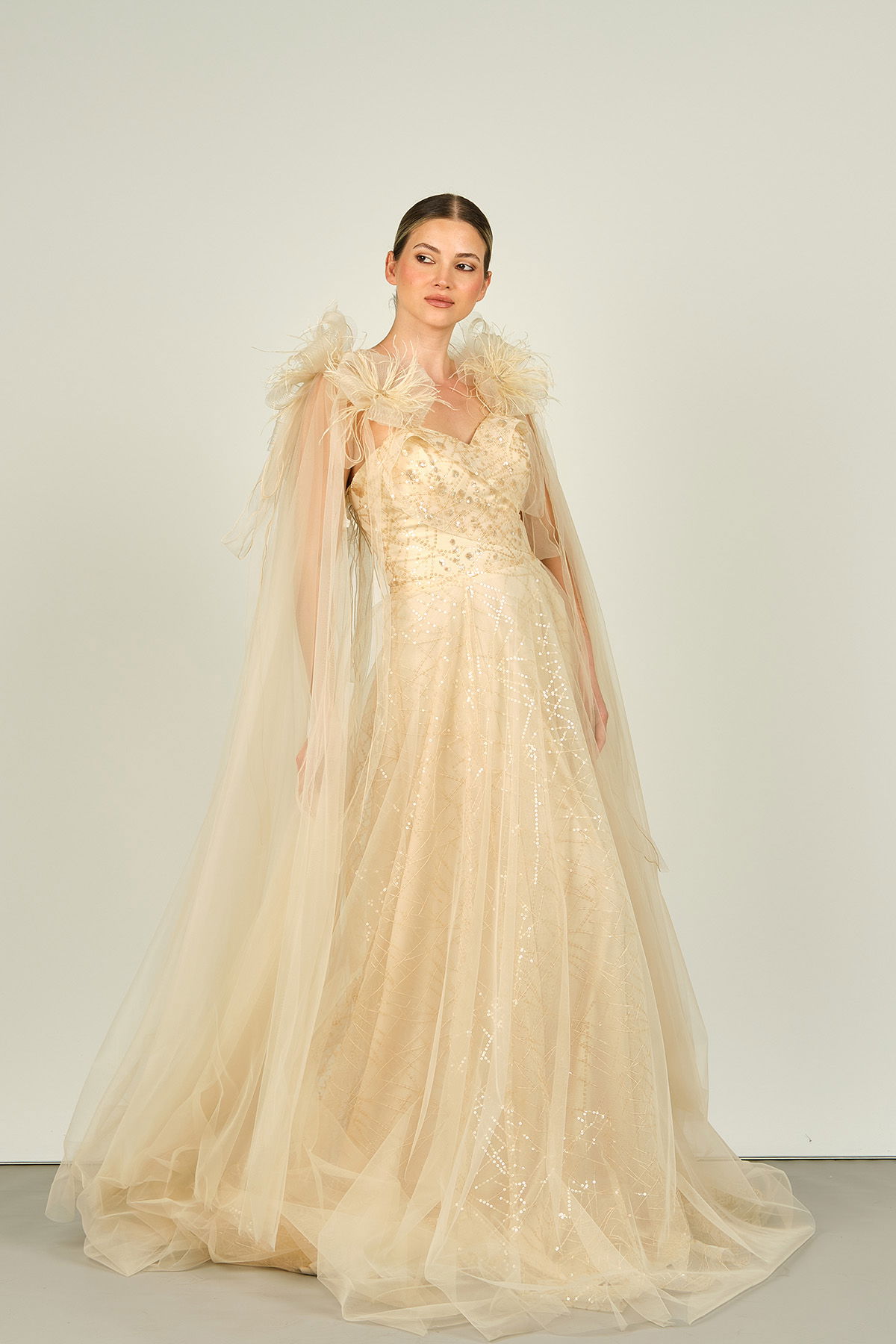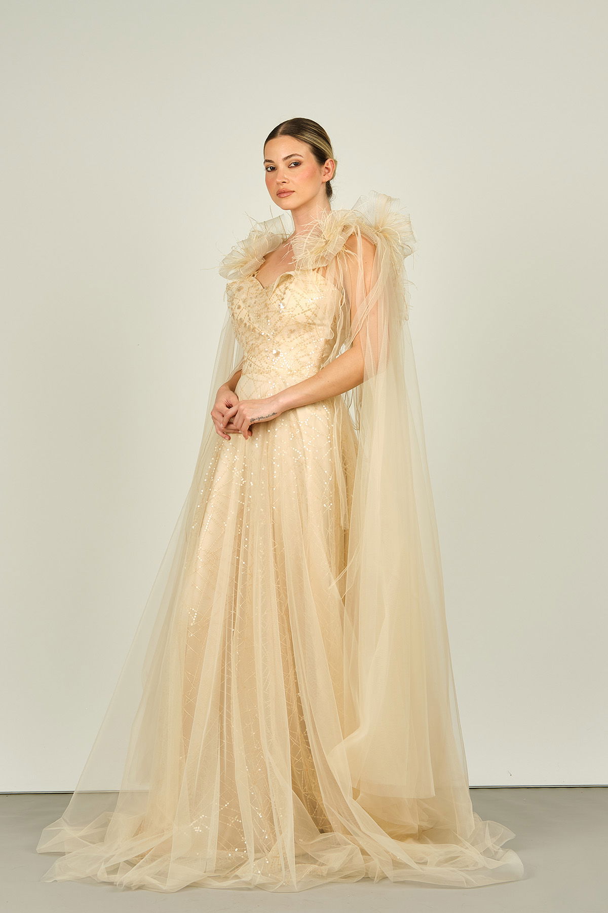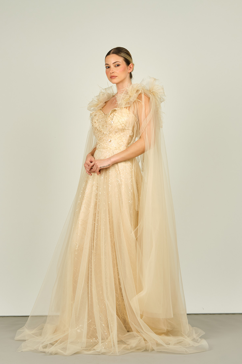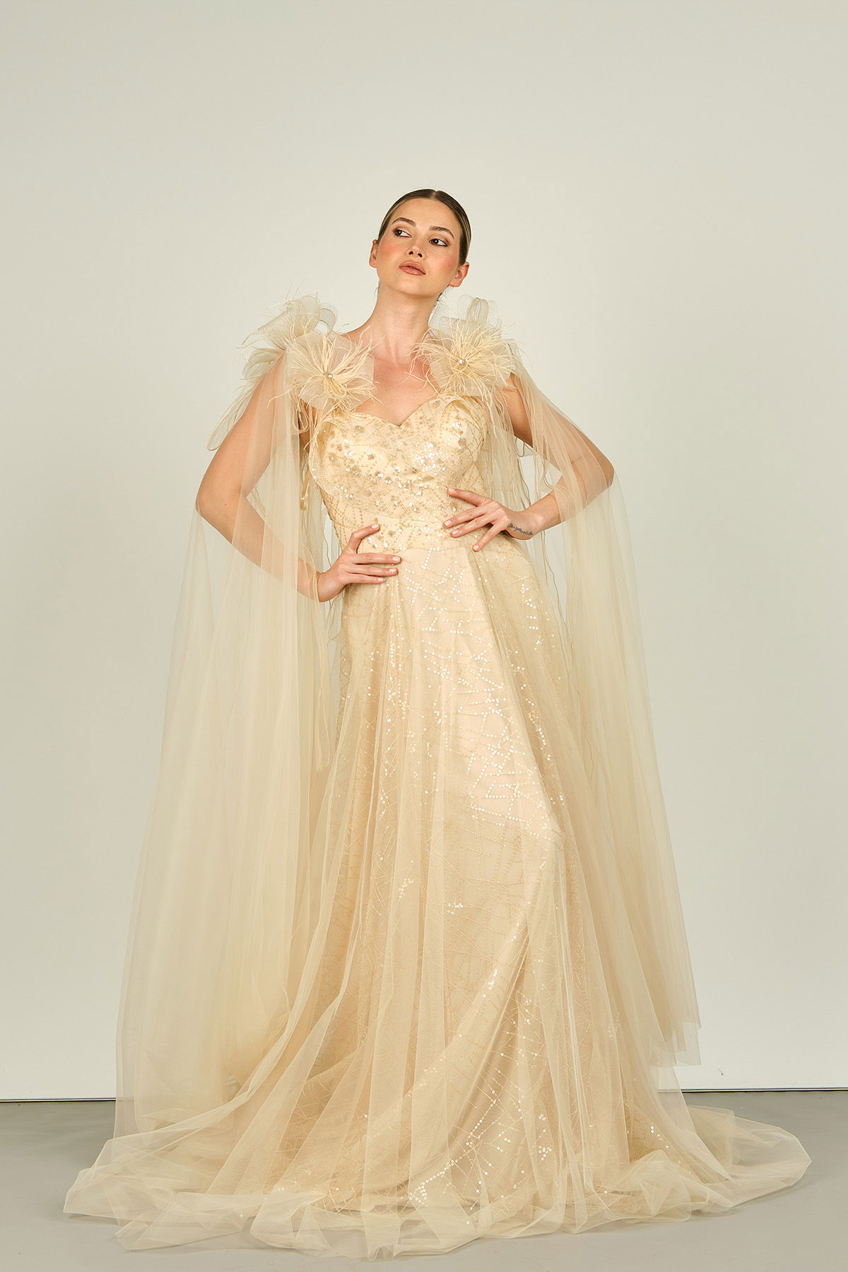 Detay: Kolları yana uzanan tül detaylı (sabit), otrişli ve fiyonklu, uzun, astarlı abiye elbise;
