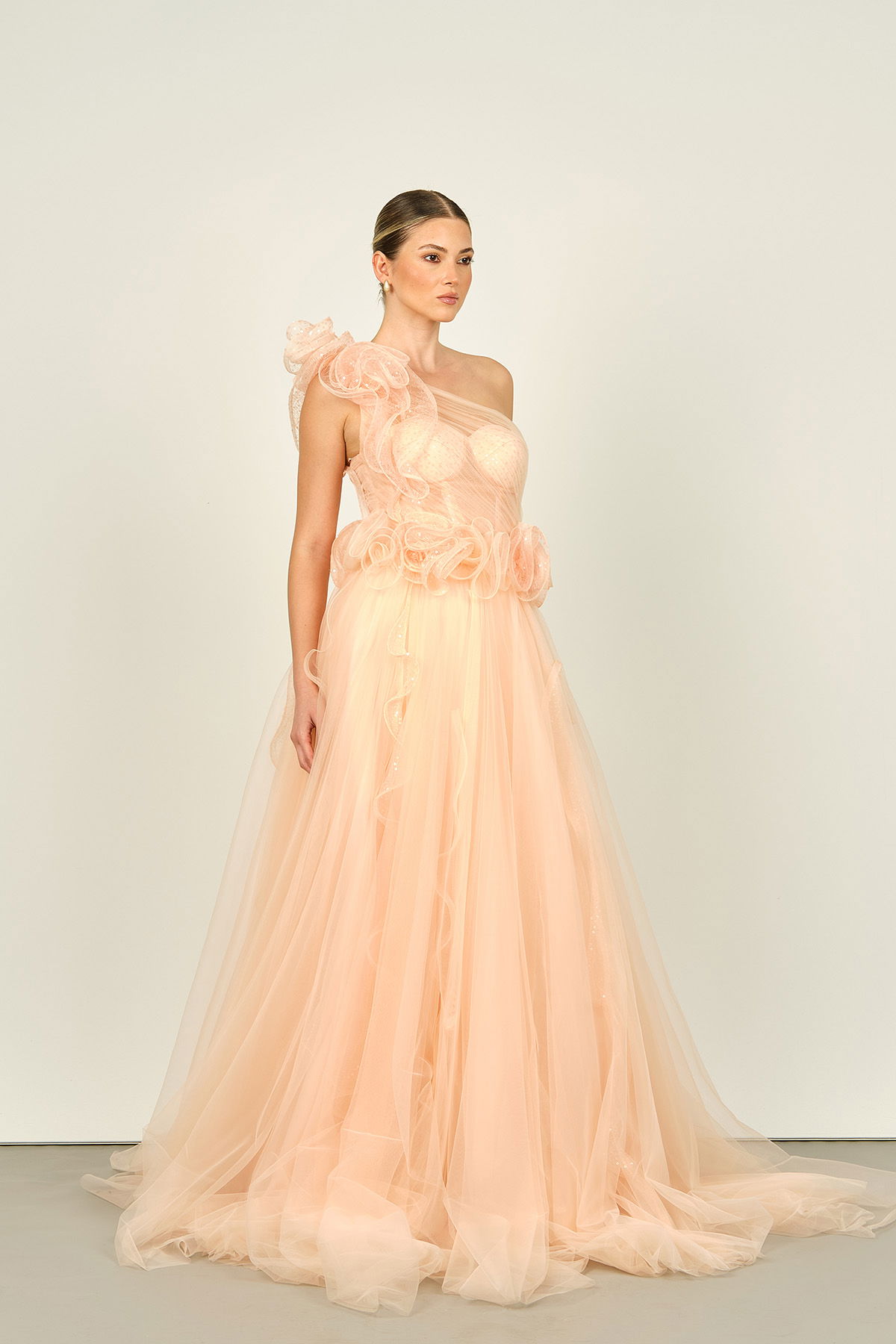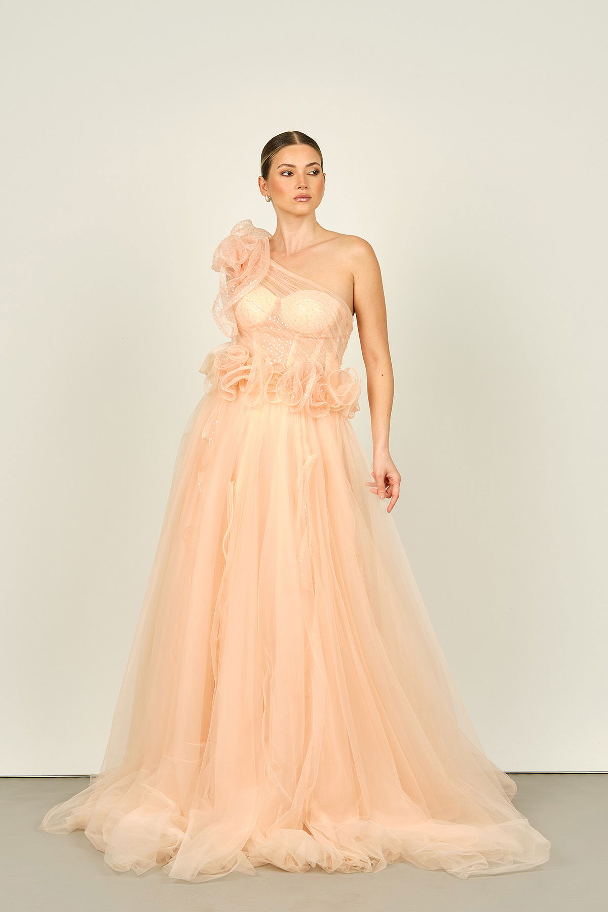 Detay: Tek omuz, göğüs kısmı transparan, beli korseli, omuz ve bel süs detaylı, astarlı, uzun abiye elbise;