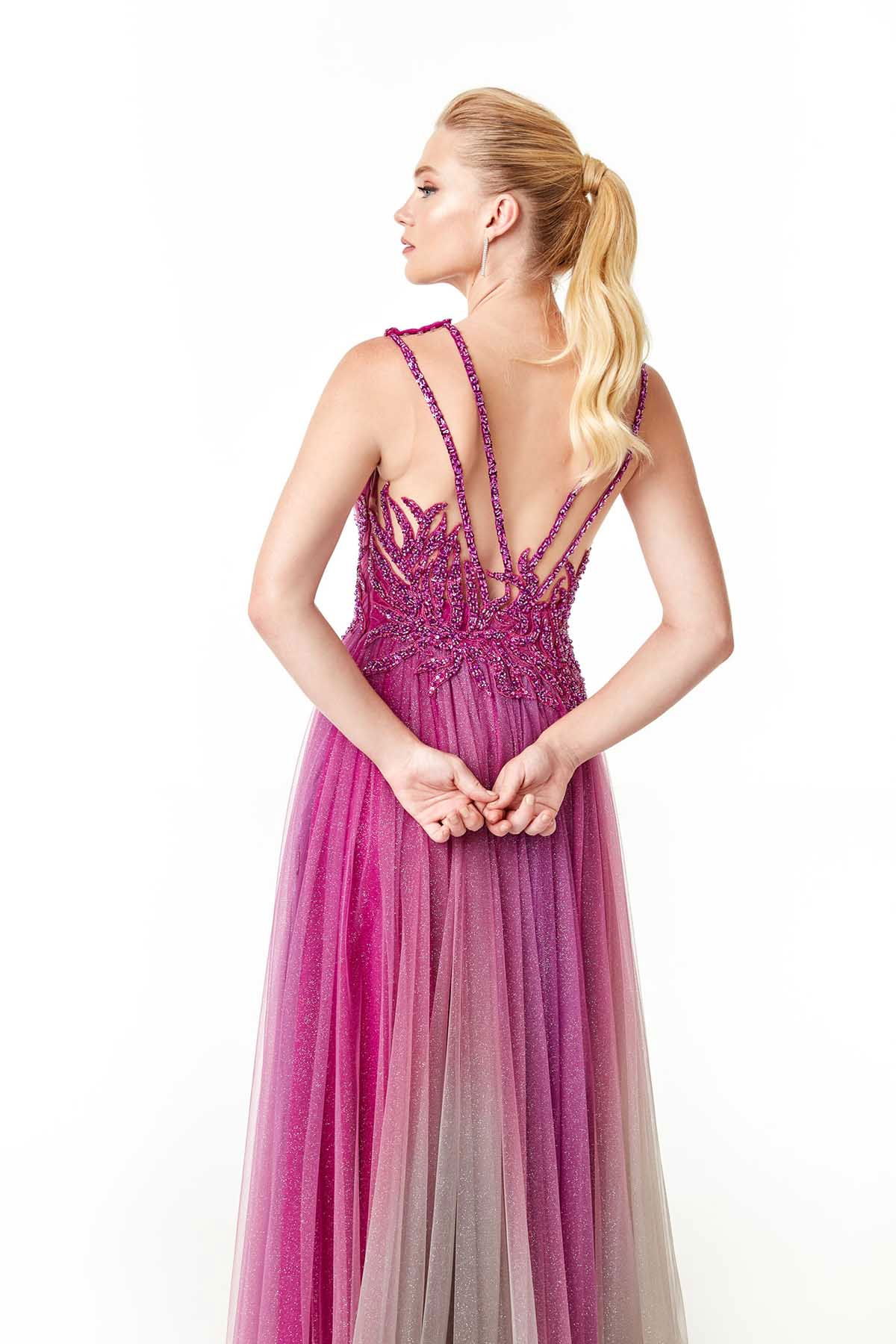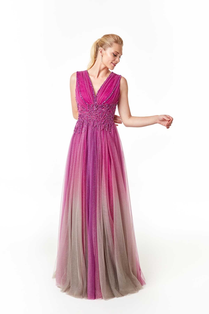 Detay: Bel kısmı taş işlemeli, V yaka, simli, sırt detaylı, alt etek renk geçişli, uzun, astarlı abiye elbise;