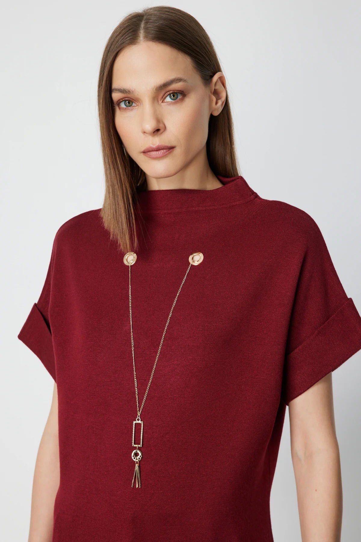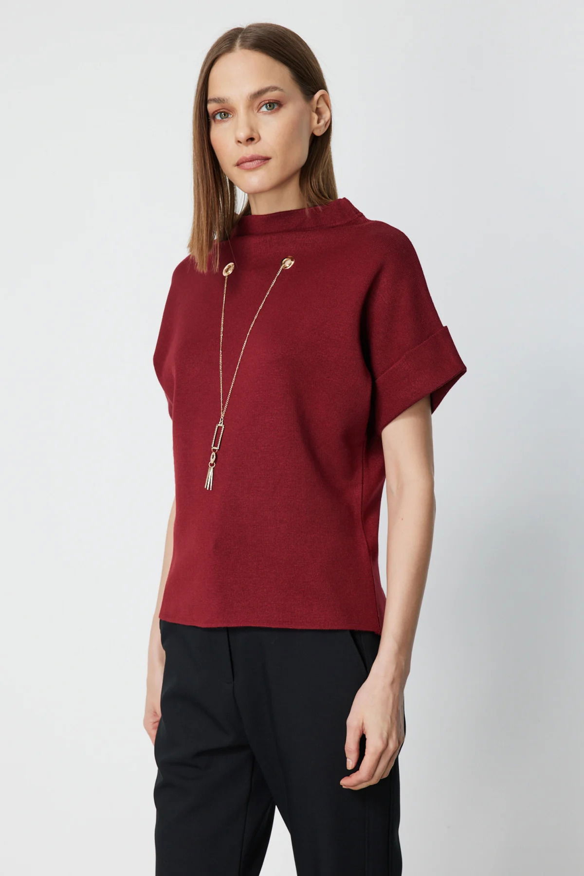 On Kadın Aksesuar Detaylı Dik Yaka Triko Kazak 65340 Bordo