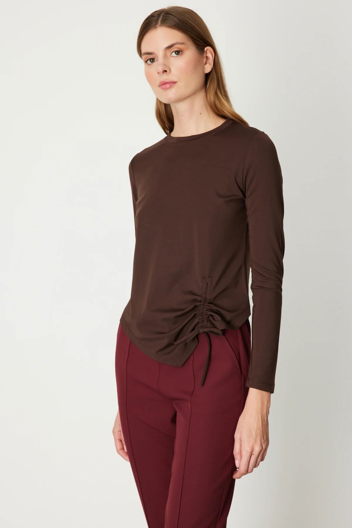 On Kadın Asimetrik Kesim Büzgü Detaylı Bluz 61376 Kahverengi
