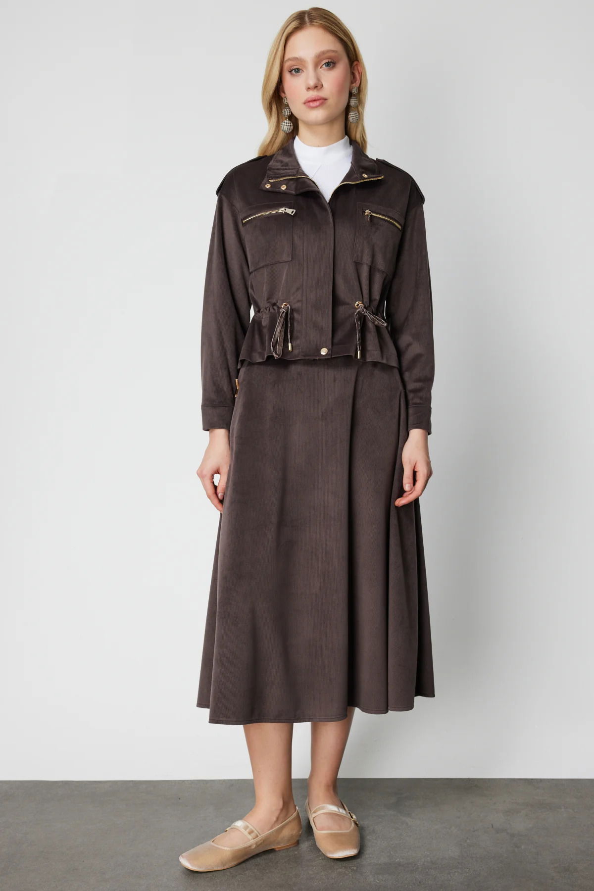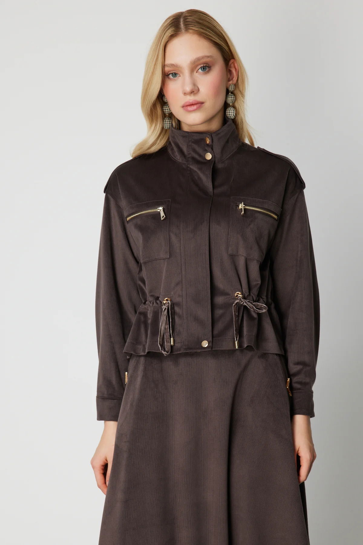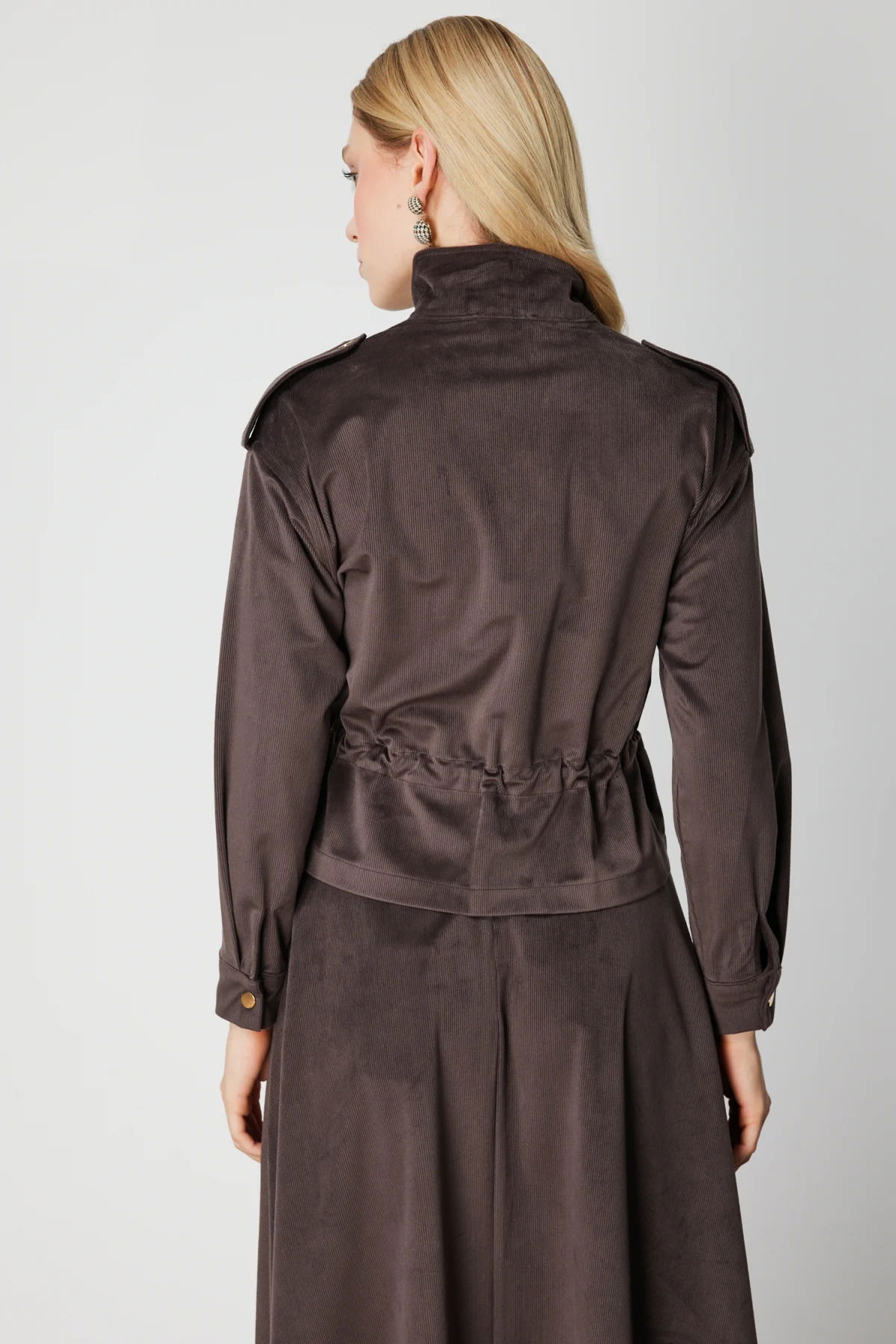 On Kadın Beli Büzgülü Dik Yaka Ceket 66532 Kahverengi