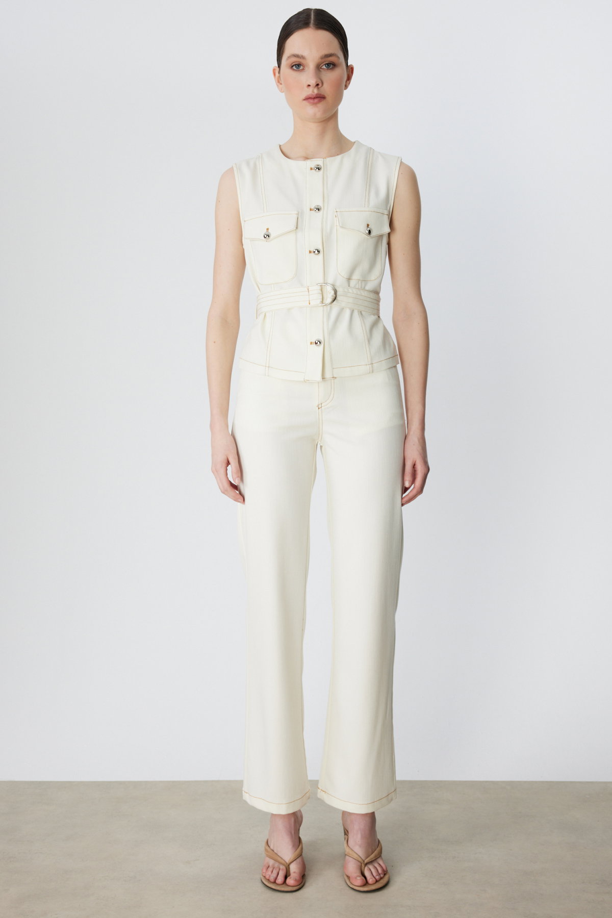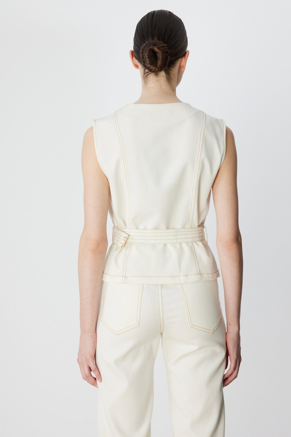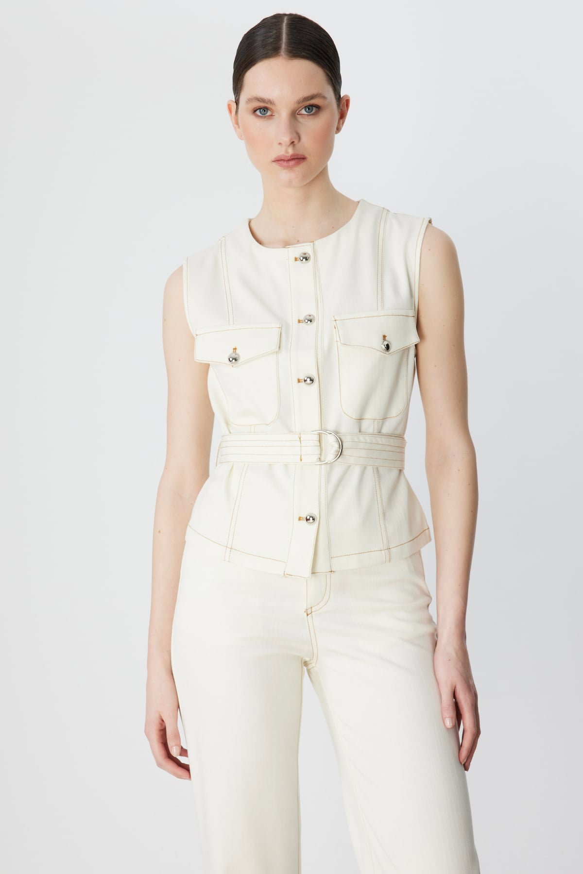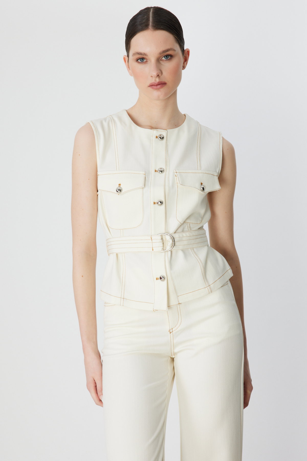 Detay: Dokuma kumaştan üretilen, astarsız, sıfır yaka ve kolsuz tasarımıyla öne çıkan bu yelek modern ve şık bir görünüm sunar. Dayanıklı dokuma kumaş hafiflik sağlarken kemerli formu bel hattını vurgular ve düğmeli kapama pratik kullanım imkânı verir. Kapaklı cepleriyle fonksiyonel detaylar sunan bu tasarım günlük kombinlerde hem zarif hem de kullanışlı bir tercih olarak dikkat çeker;