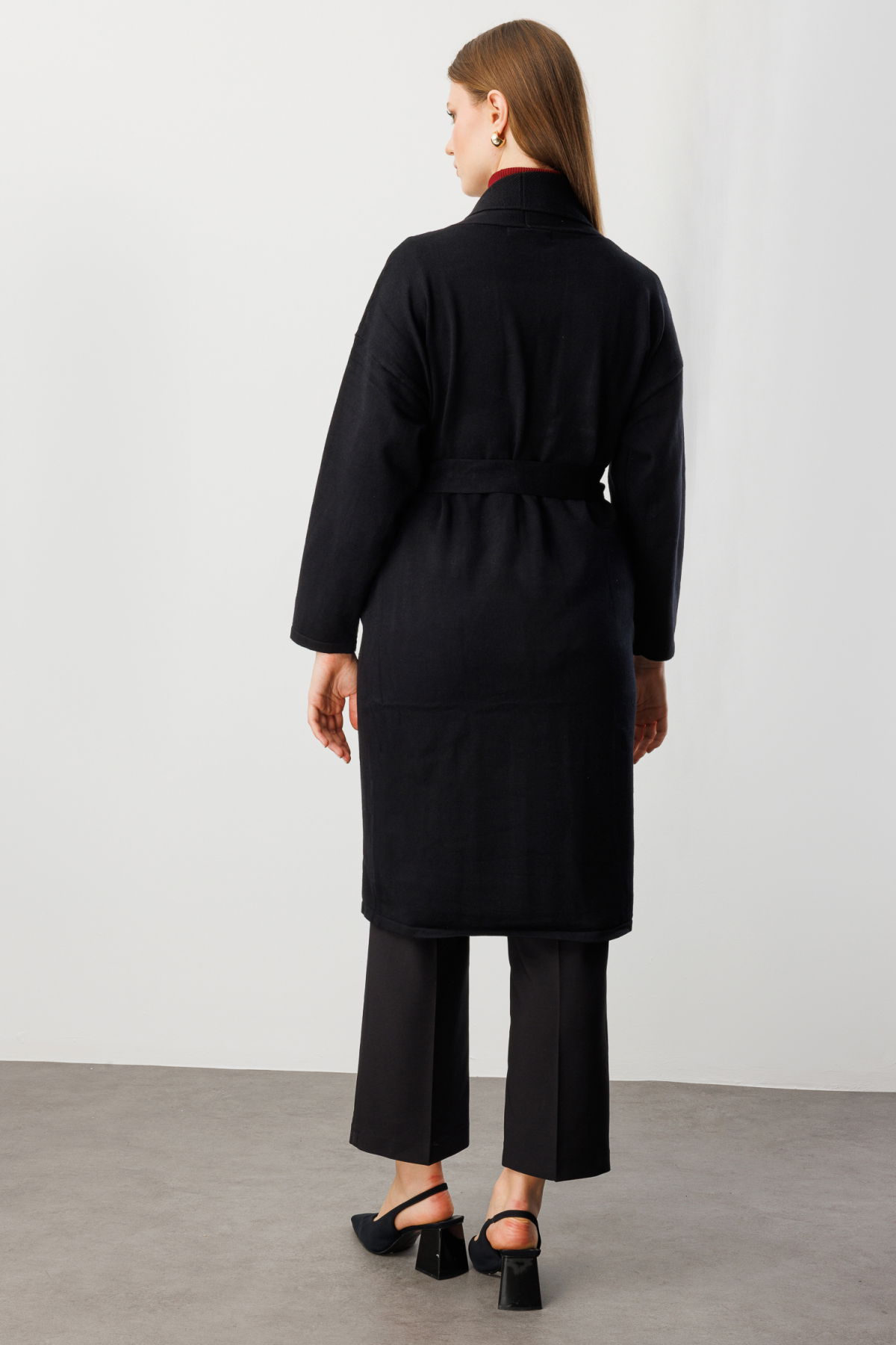On Kadın Büyük Beden Beli Kuşaklı Şal Yaka Hırka 60900 Siyah