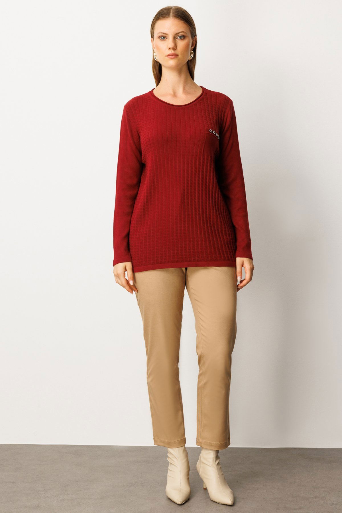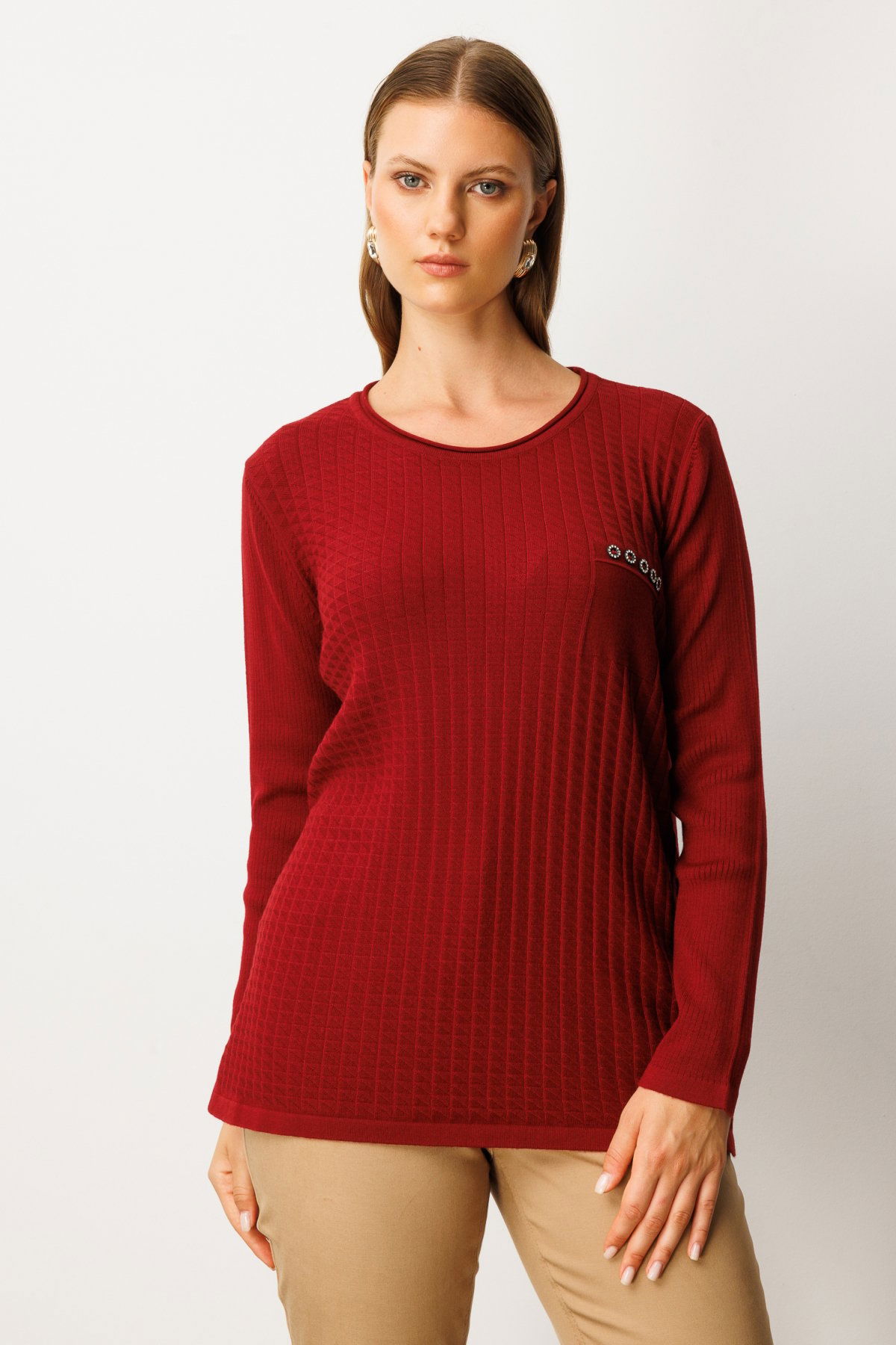 On Kadın Büyük Beden Cebi Taşlı Triko Kazak 65354 Bordo