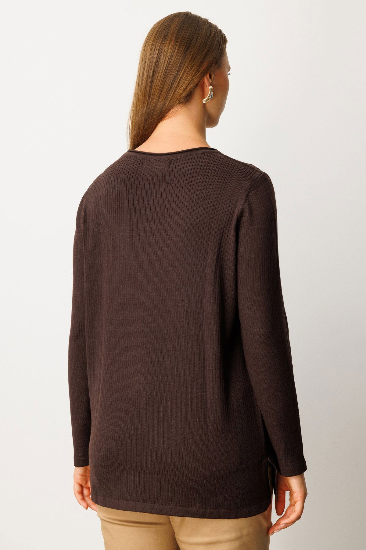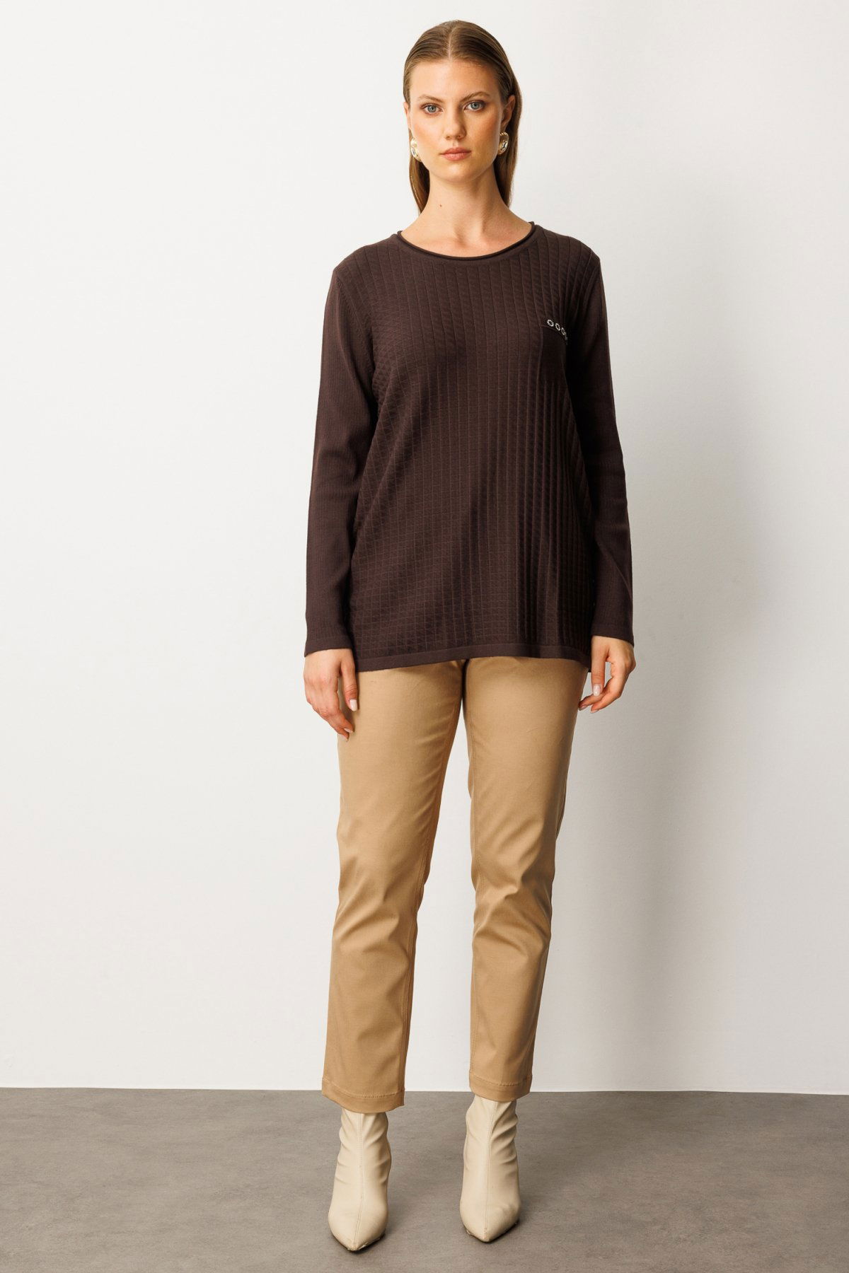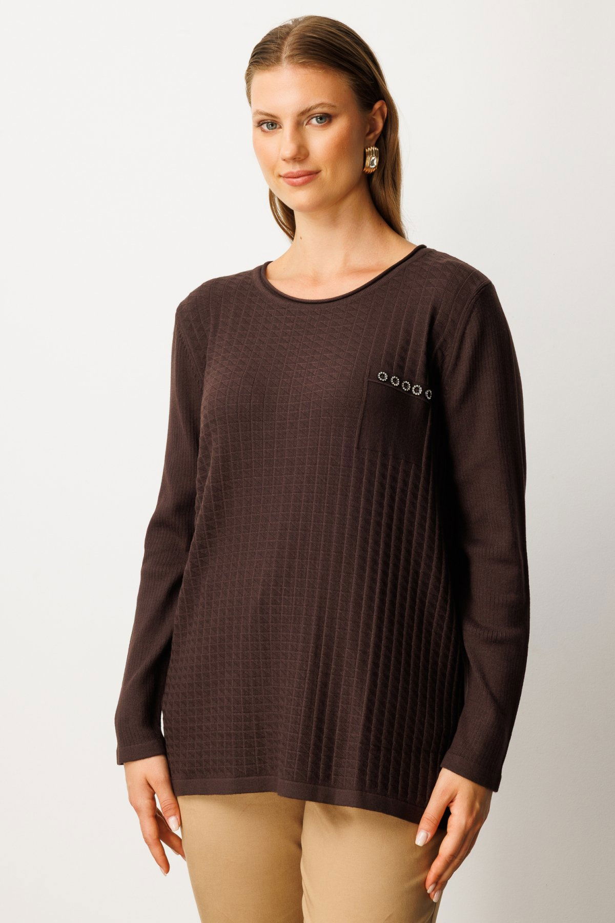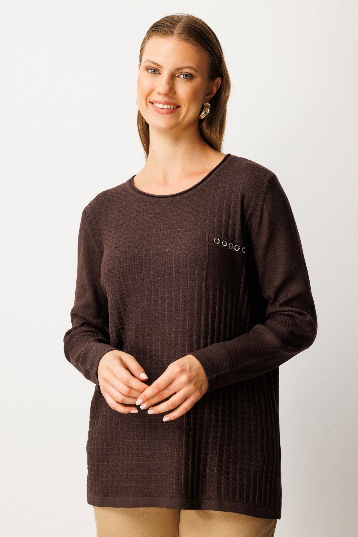 On Kadın Büyük Beden Cebi Taşlı Triko Kazak 65354 Kahverengi