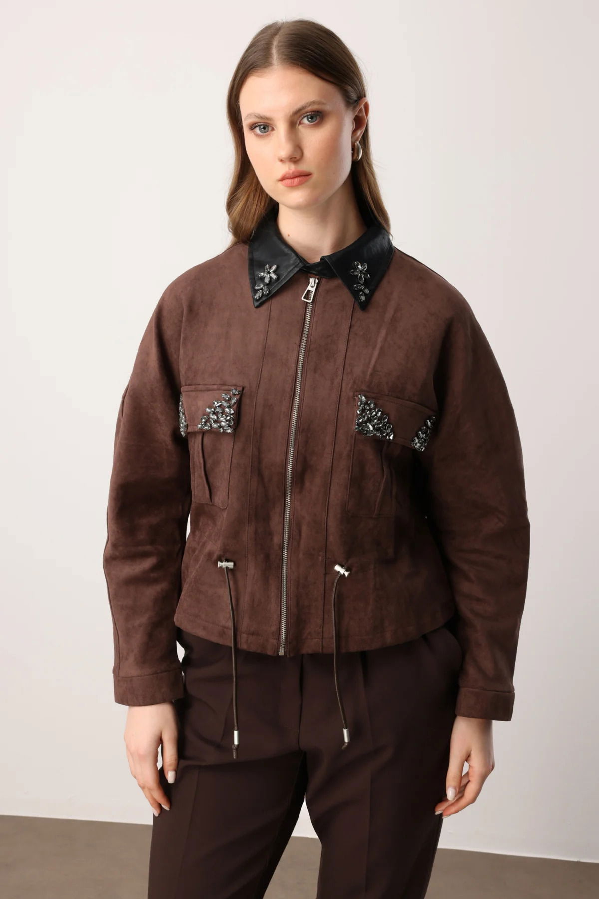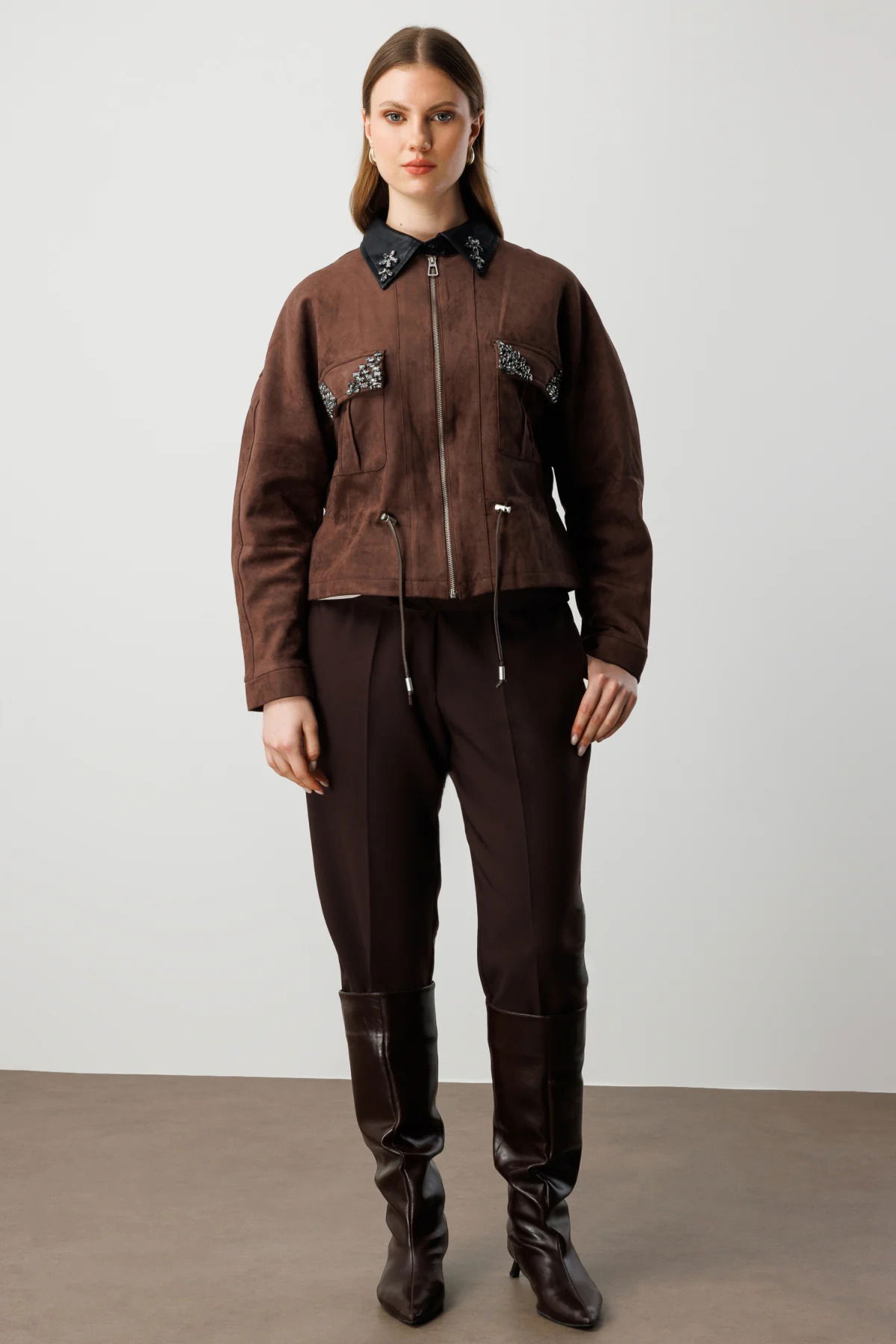 Detay: Süet kumaştan üretilen, astarlı ve klasik yaka tasarıma sahip uzun kollu fermuarlı, kapak cepli mont, şıklığı ve fonksiyonelliği bir arada sunar. Fermuar kapama detayı pratik kullanım sağlarken, kapaklı cepler modern bir görünümle birlikte ekstra kullanım kolaylığı sağlar. Hem günlük kombinlerde hem de özel davetlerde tercih edilebilecek süet mont, gardırobunuzun vazgeçilmez parçalarından biri olur.;