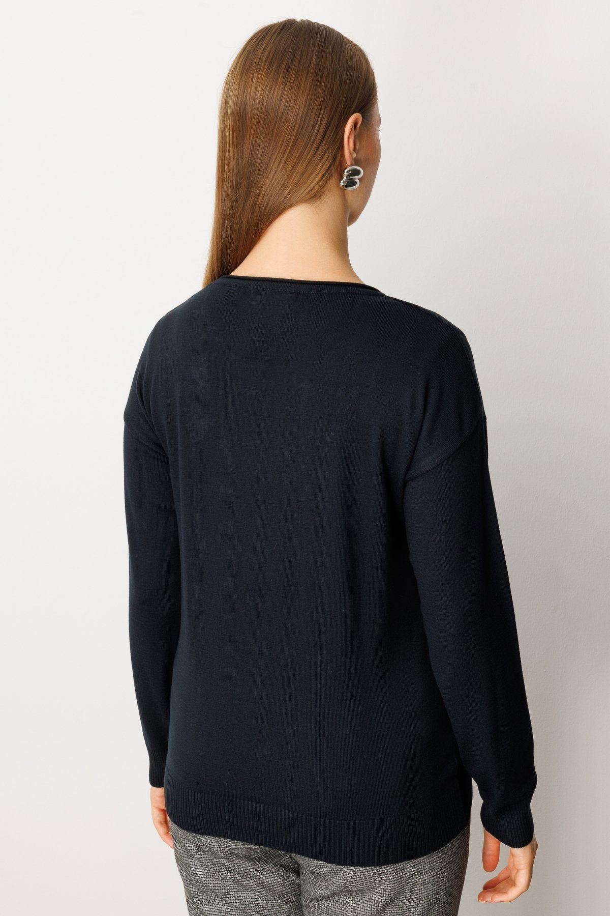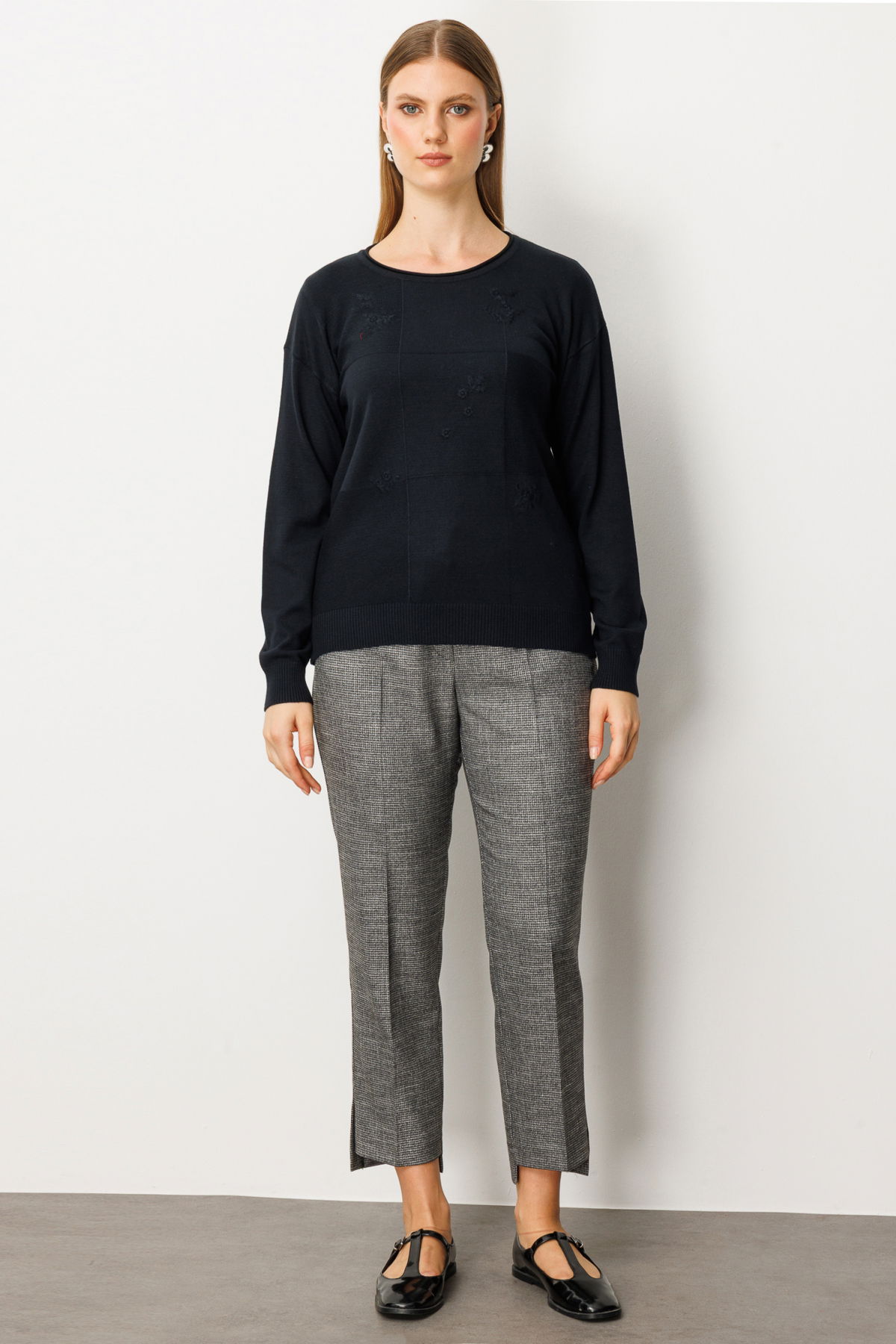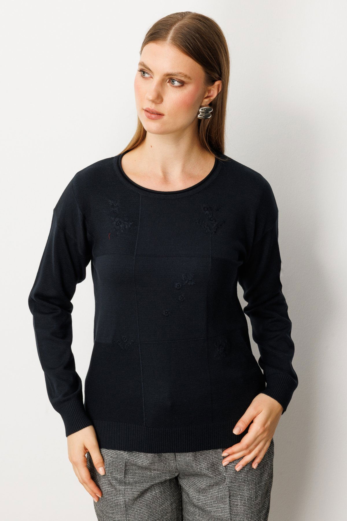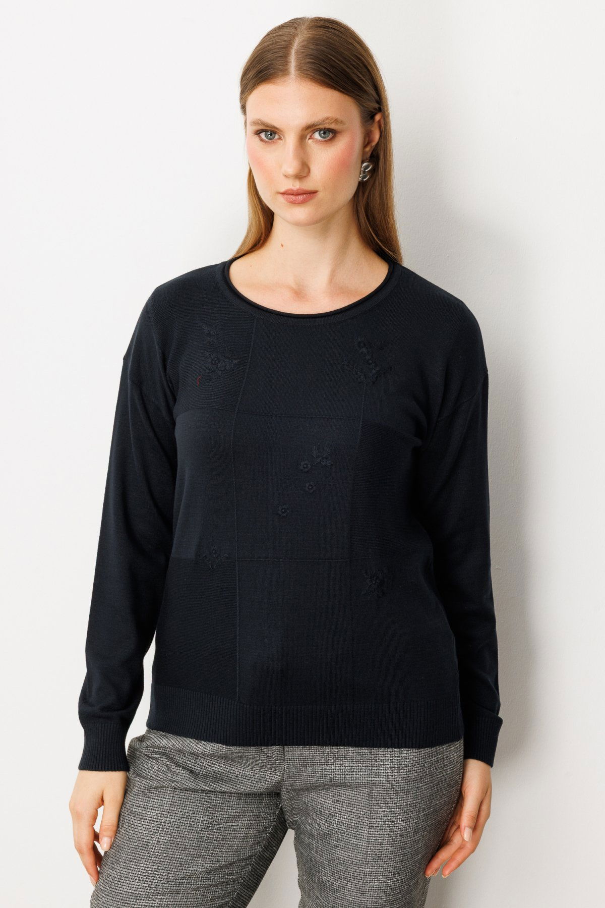 On Kadın Büyük Beden Çiçek İşlemeli Sıfır Yaka Triko Kazak 65359 Siyah