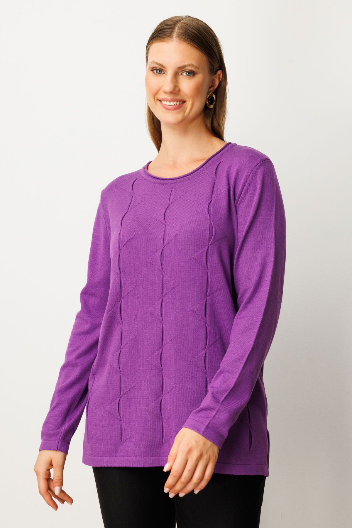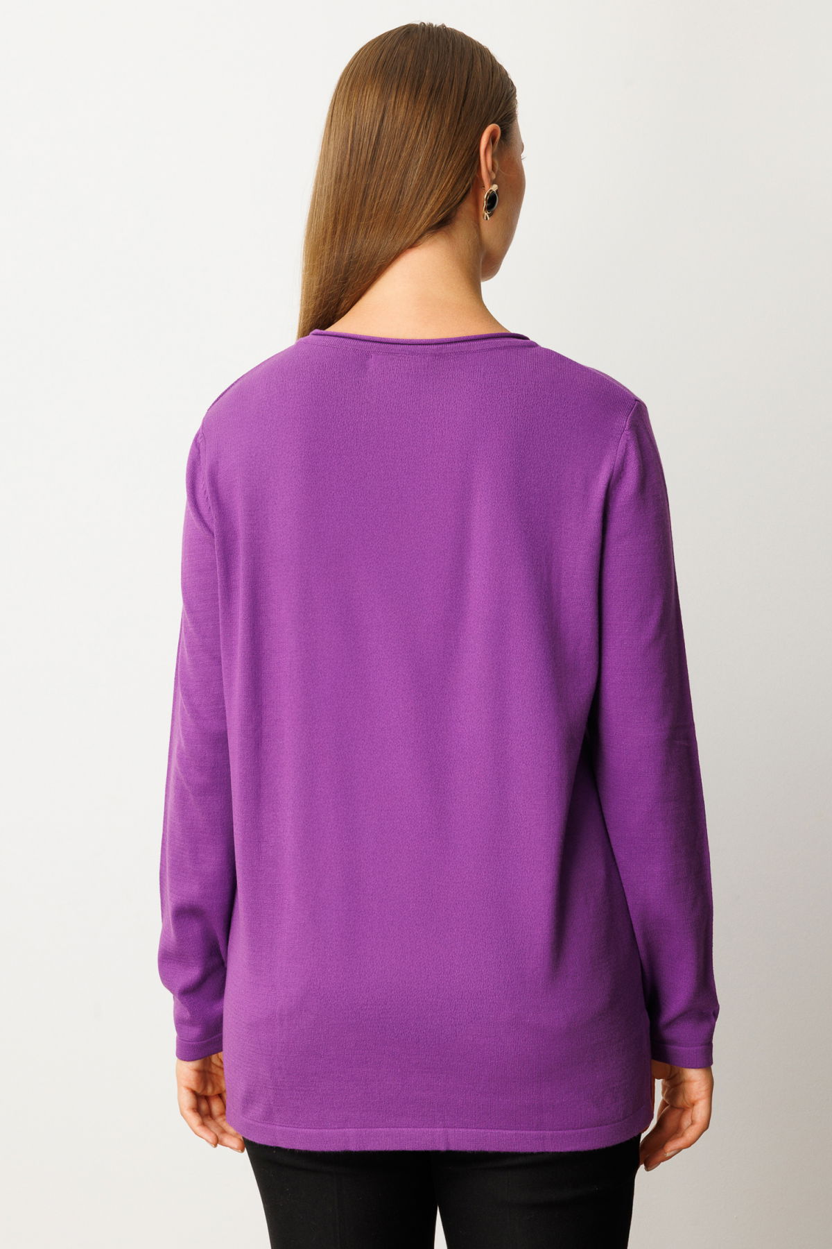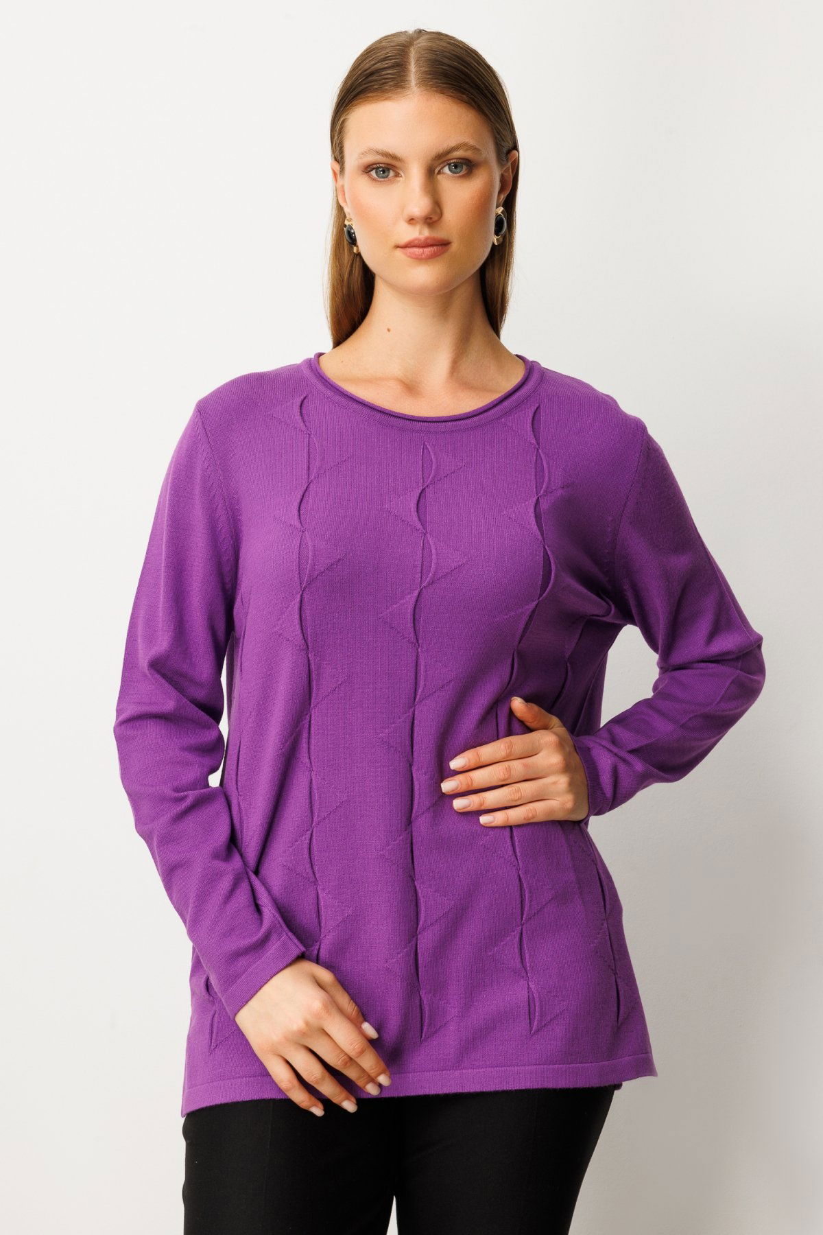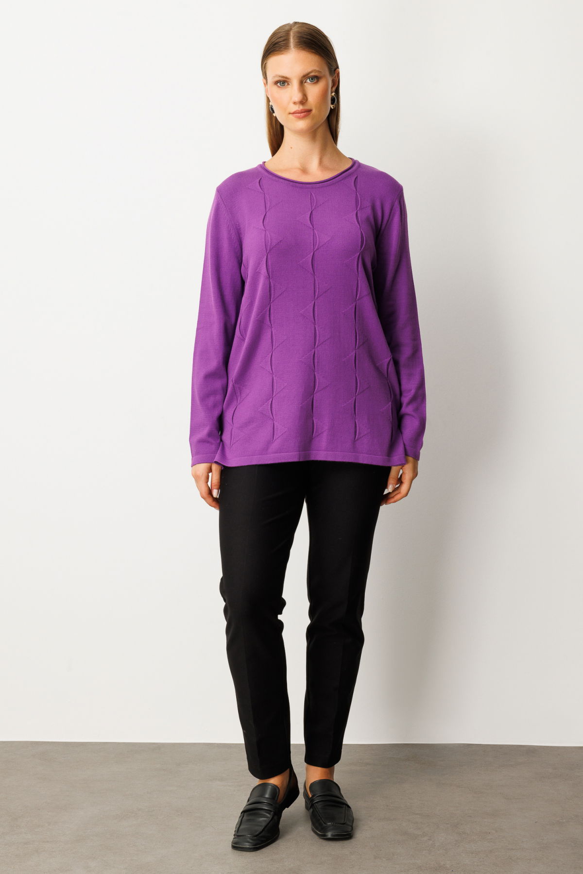On Kadın Büyük Beden Kendinden Desenli Triko Kazak 65329 Mor