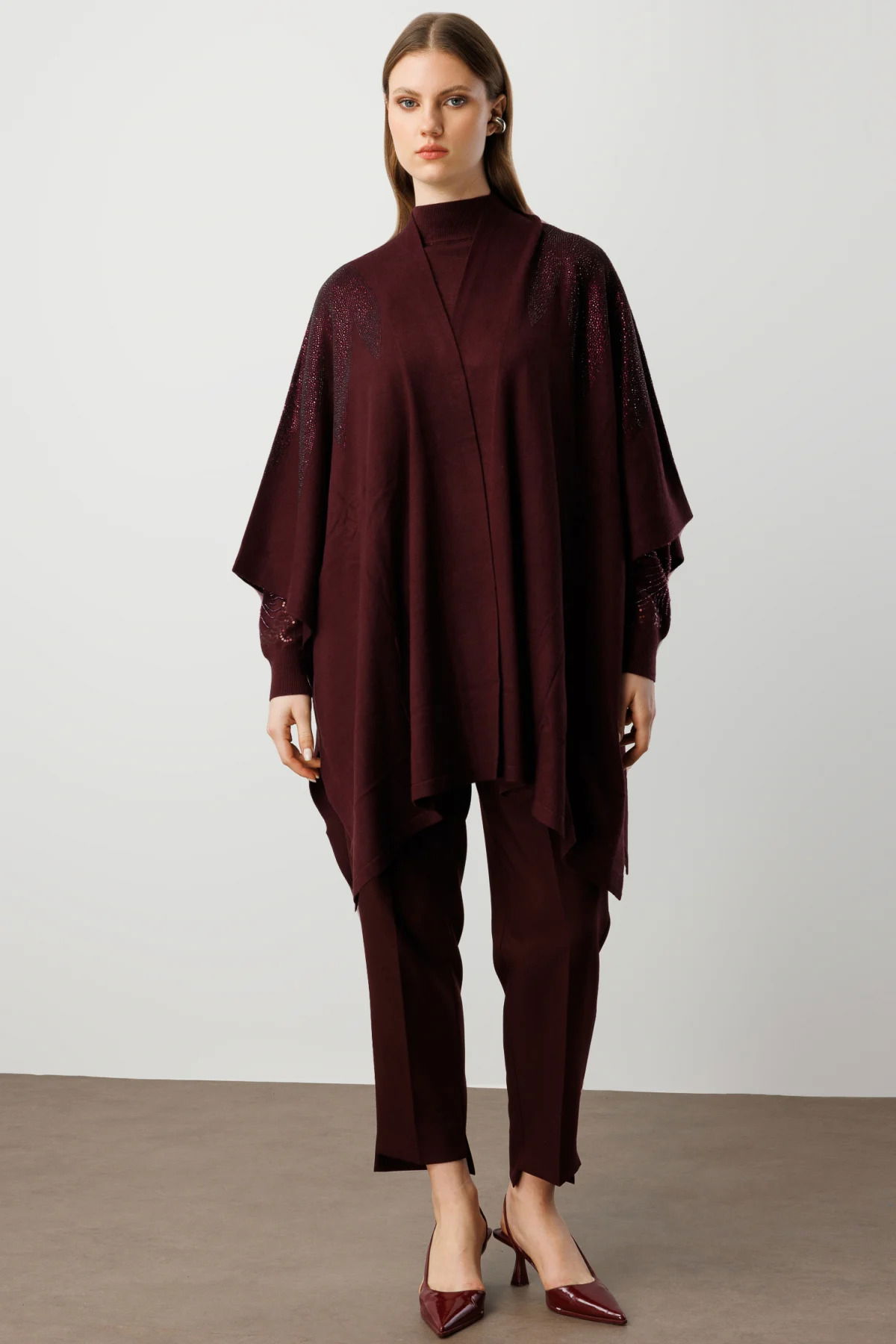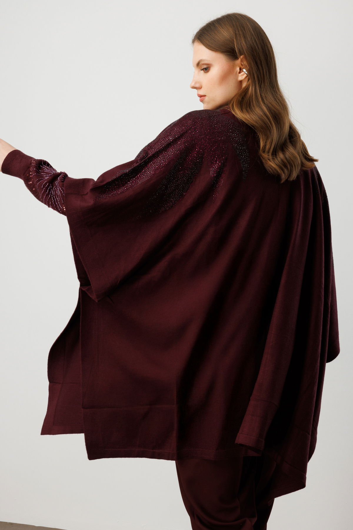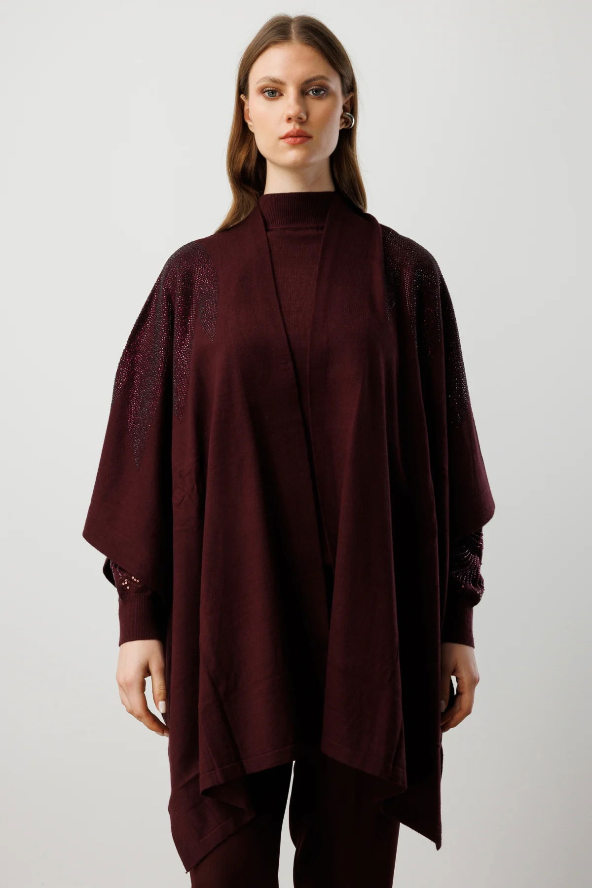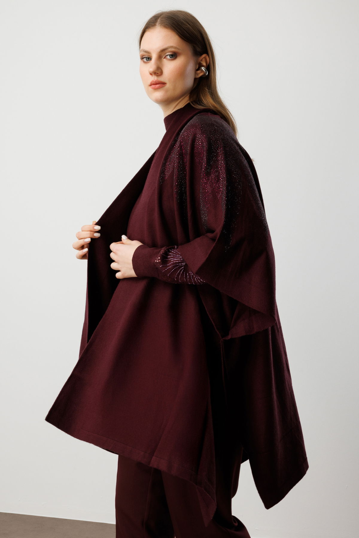 On Kadın Büyük Beden Omuzları Taşlı Yarasa Kol Hırka 60322 Bordo