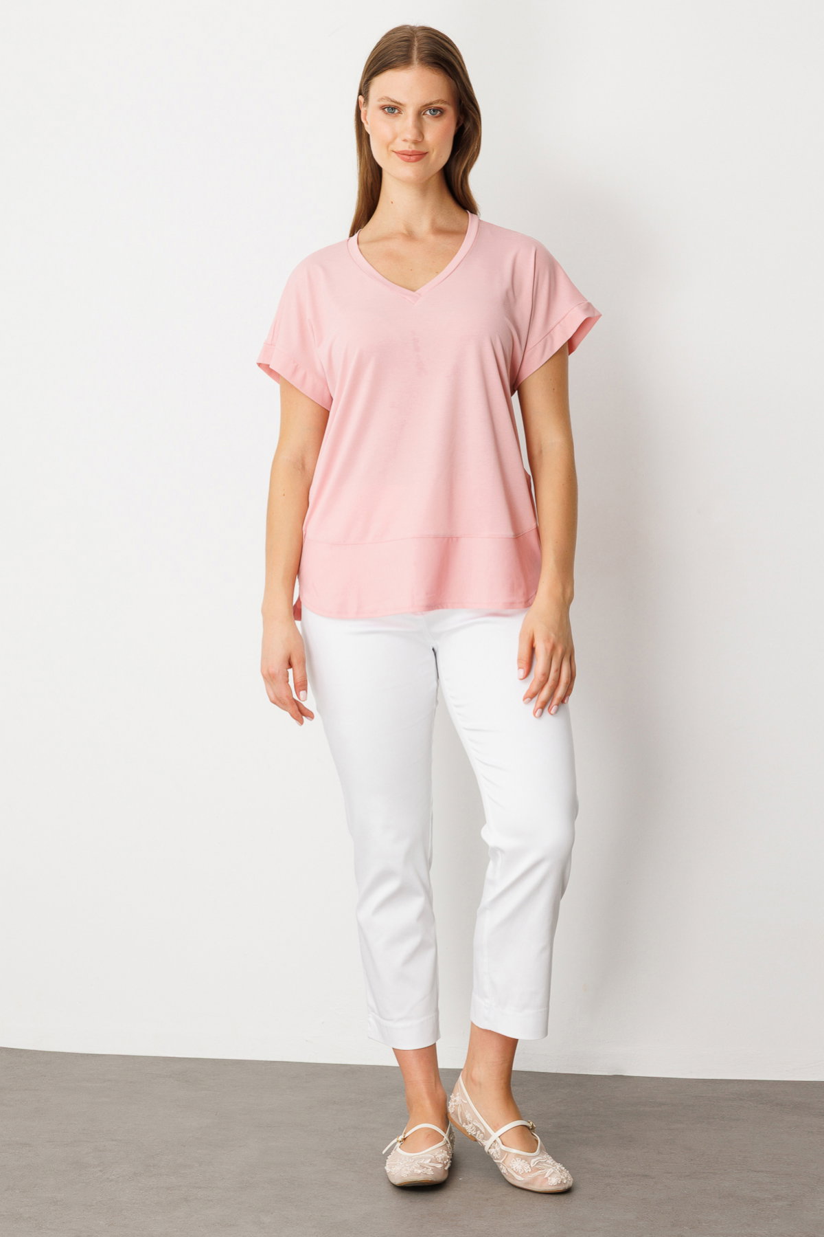On Kadın Büyük Beden V Yaka Parçalı T-Shirt 71476 Pudra