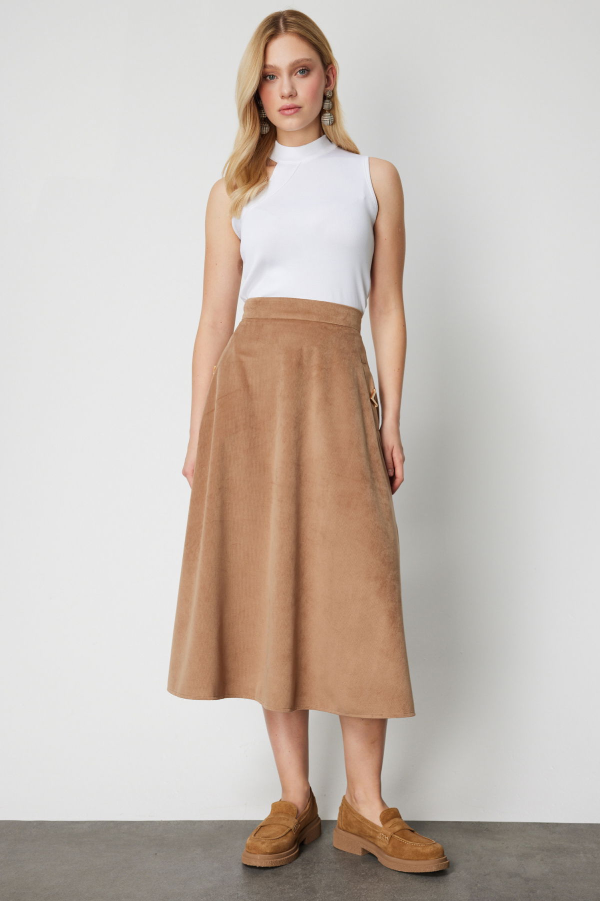 On Kadın Cebi Metal Aksesuarlı Midi Boy Etek 66533 Camel