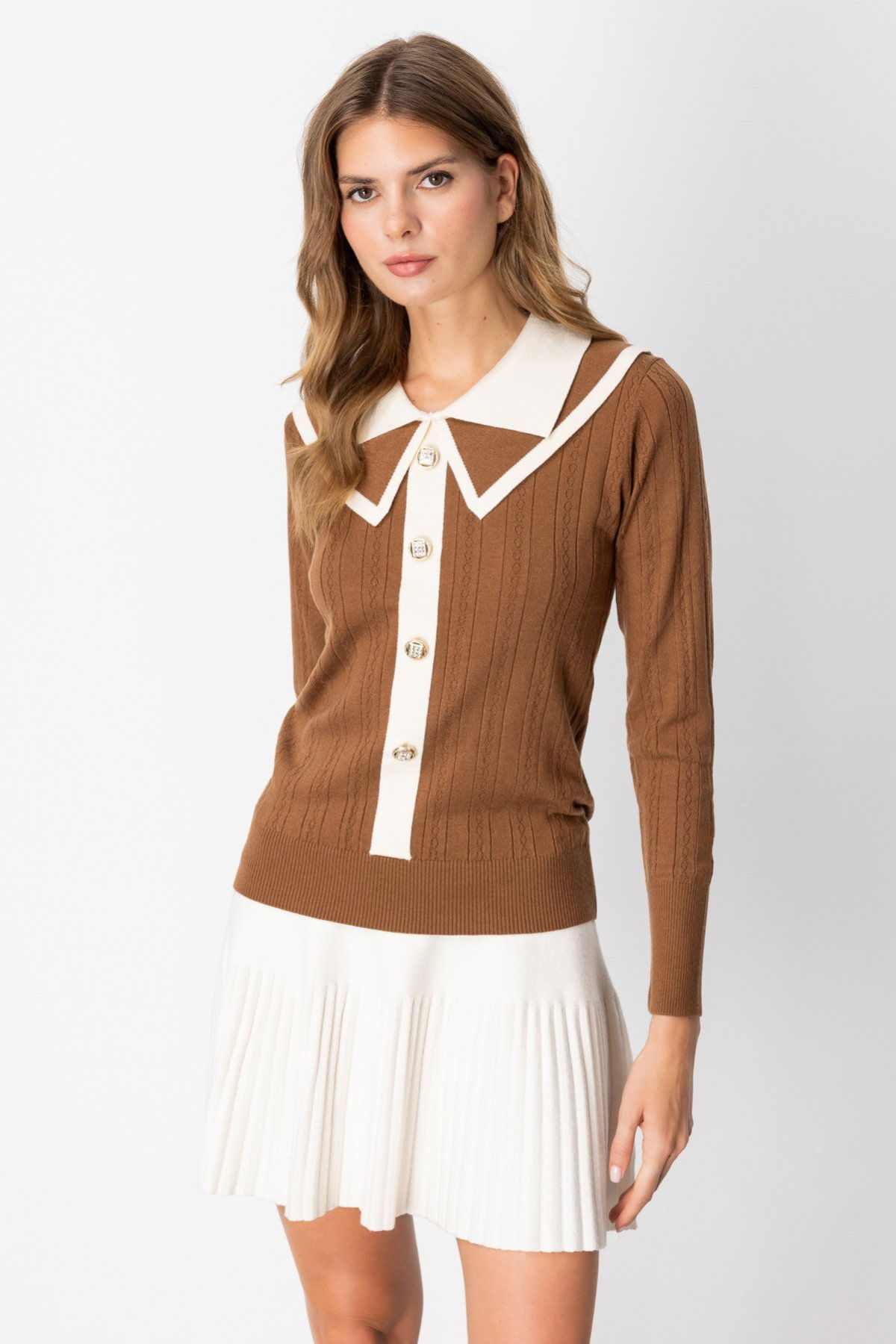 On Kadın Çift Yaka Düğme Detaylı Triko Kazak 66460 Mocha