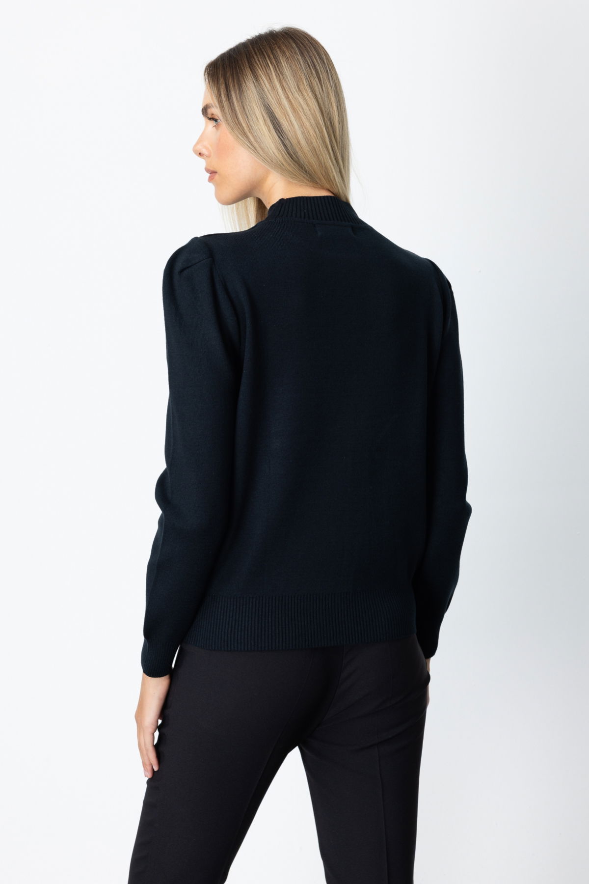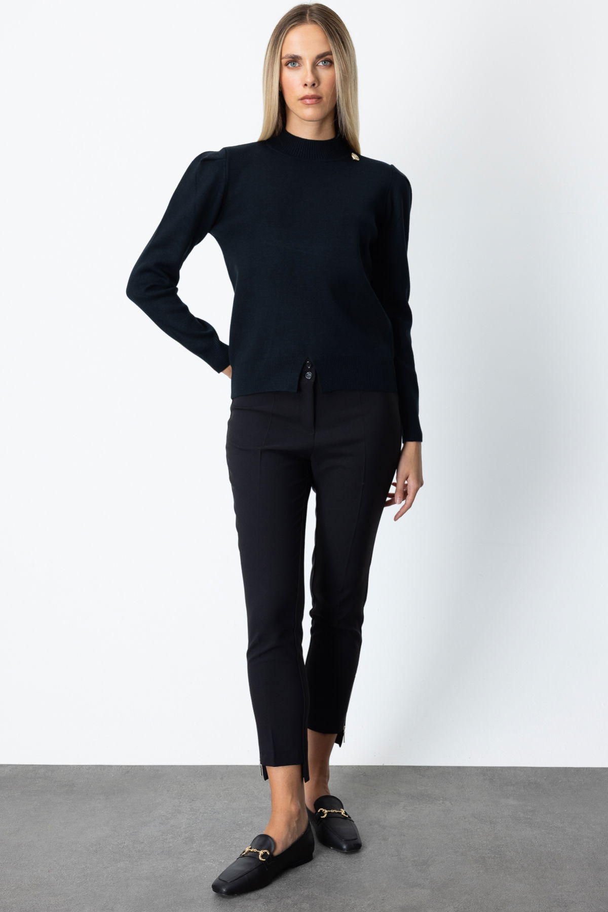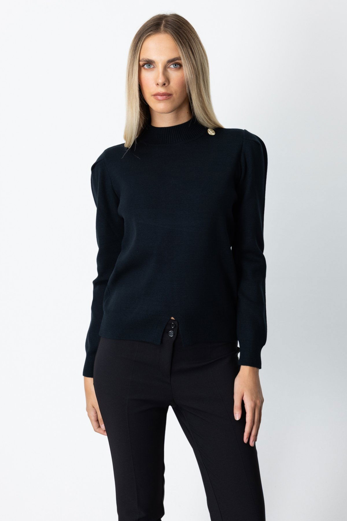On Kadın Dik Yaka Düğme Detaylı Kazak 65331 Siyah
