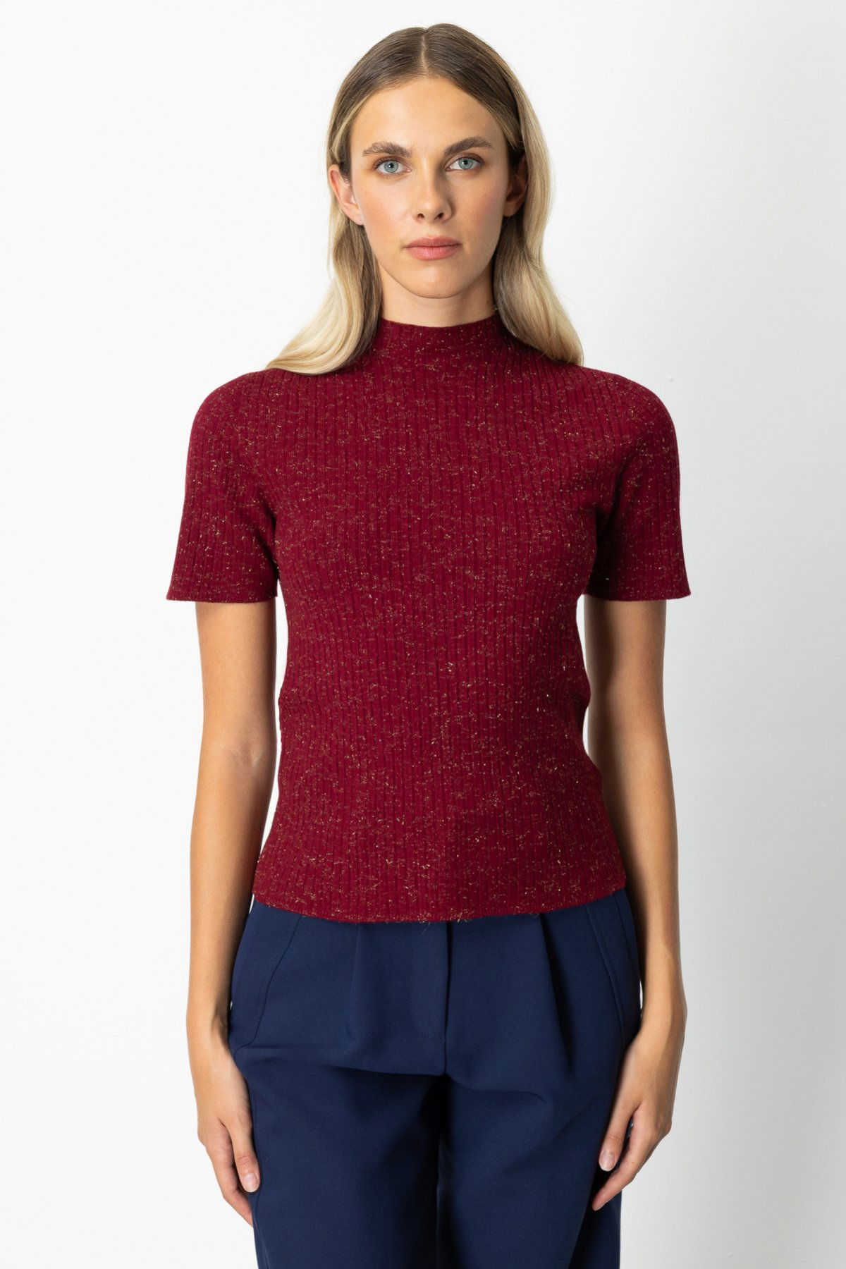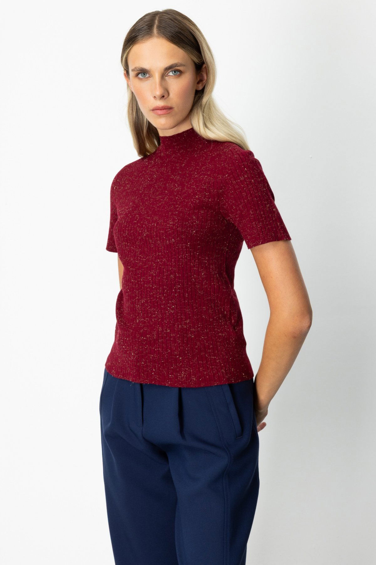 On Kadın Dik Yaka Kısa Kollu Triko Kazak 69302 Bordo