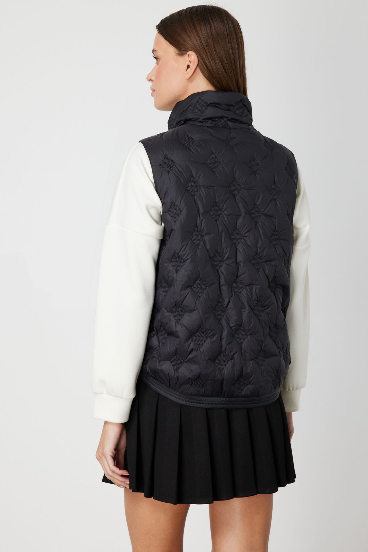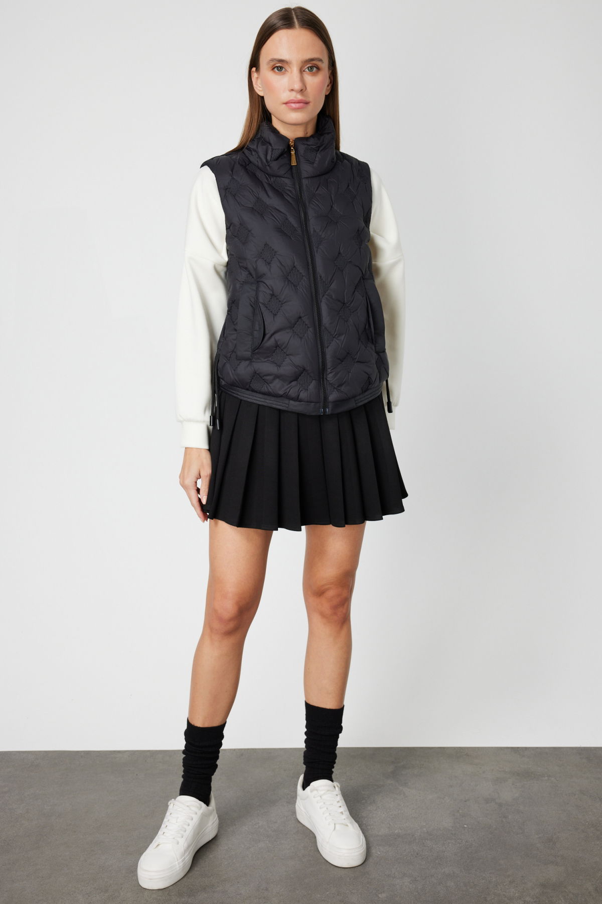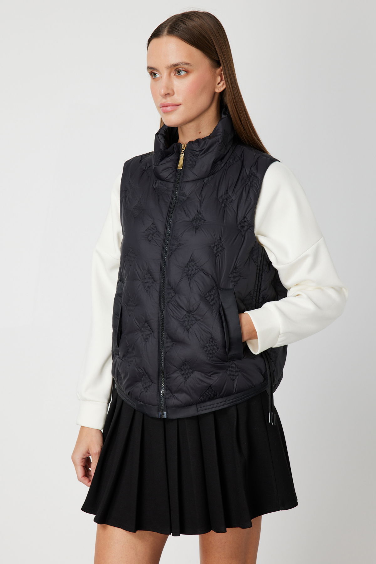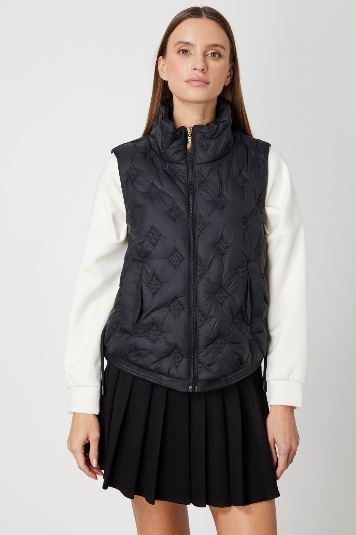 Detay: Dik yaka tasarımıyla modern ve güçlü bir duruş sergileyen bu dokuma yelek, astarlı yapısıyla hem sıcak tutar hem de konforlu bir kullanım sunar. Kolsuz formu sayesinde hareket özgürlüğü sağlarken, fermuarlı kapama ve yan ceplerle işlevselliği ön plana çıkarır. Günlük stilinize şıklık katmak isteyenler için bu yelek, hem pratik hem de zarif bir tercihtir;