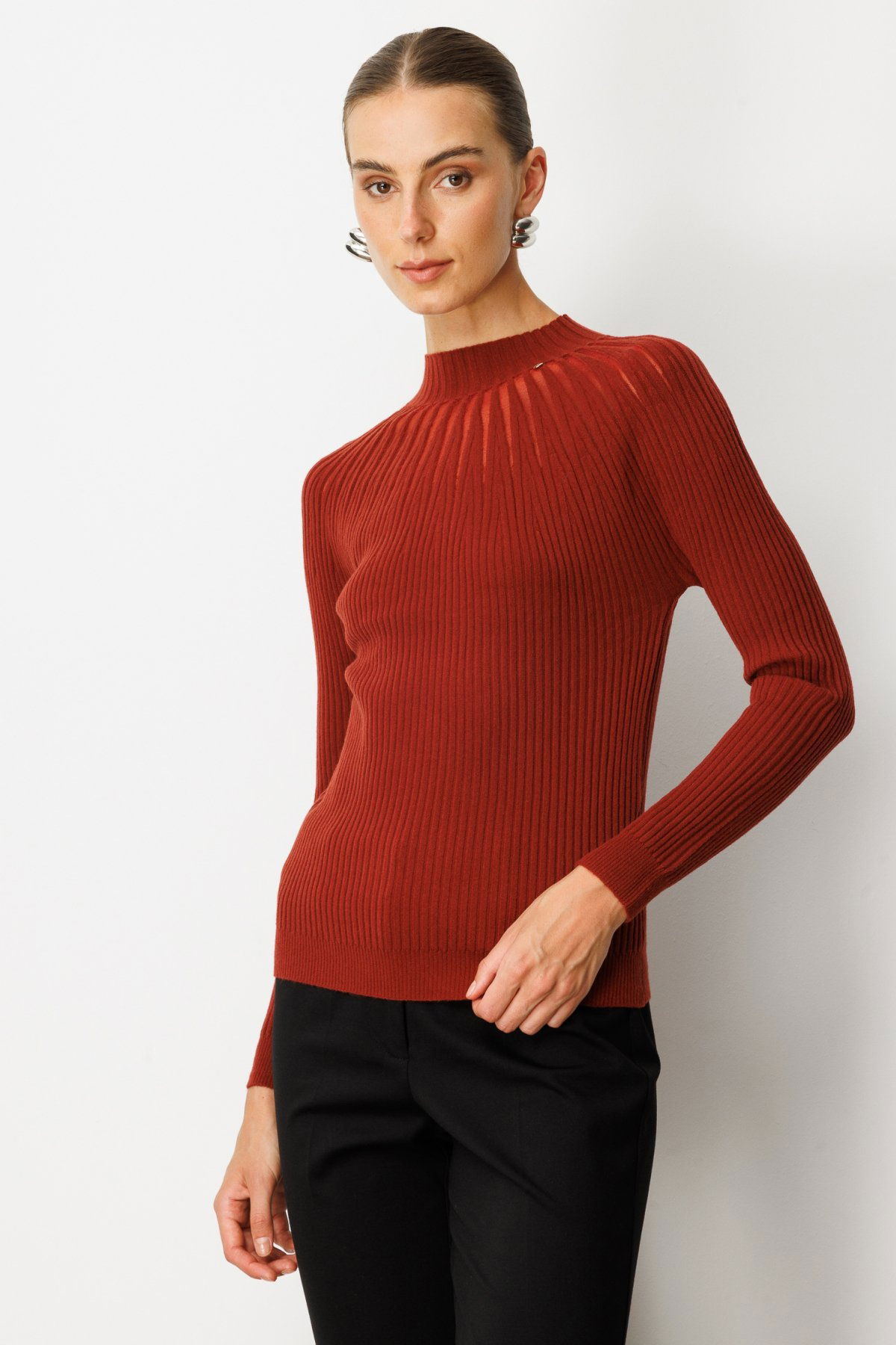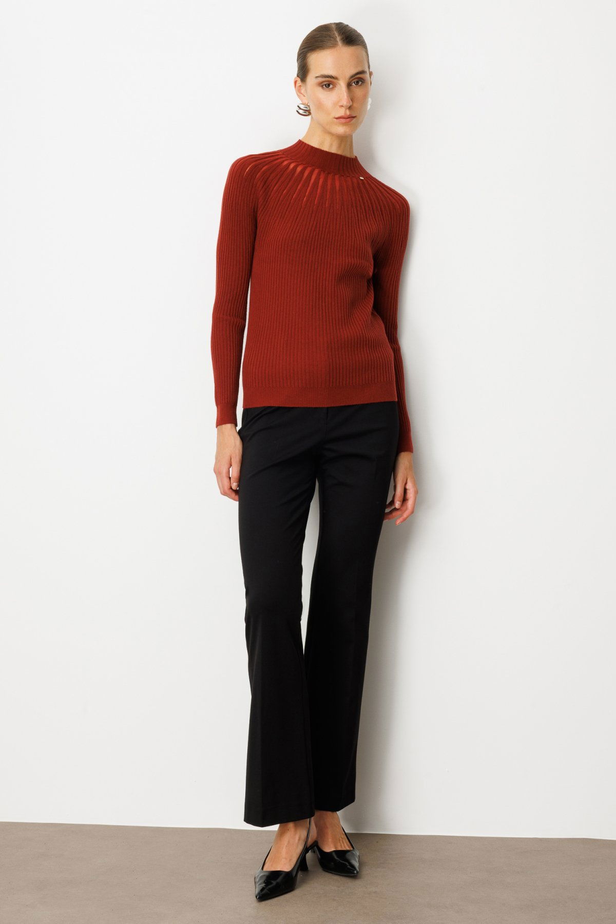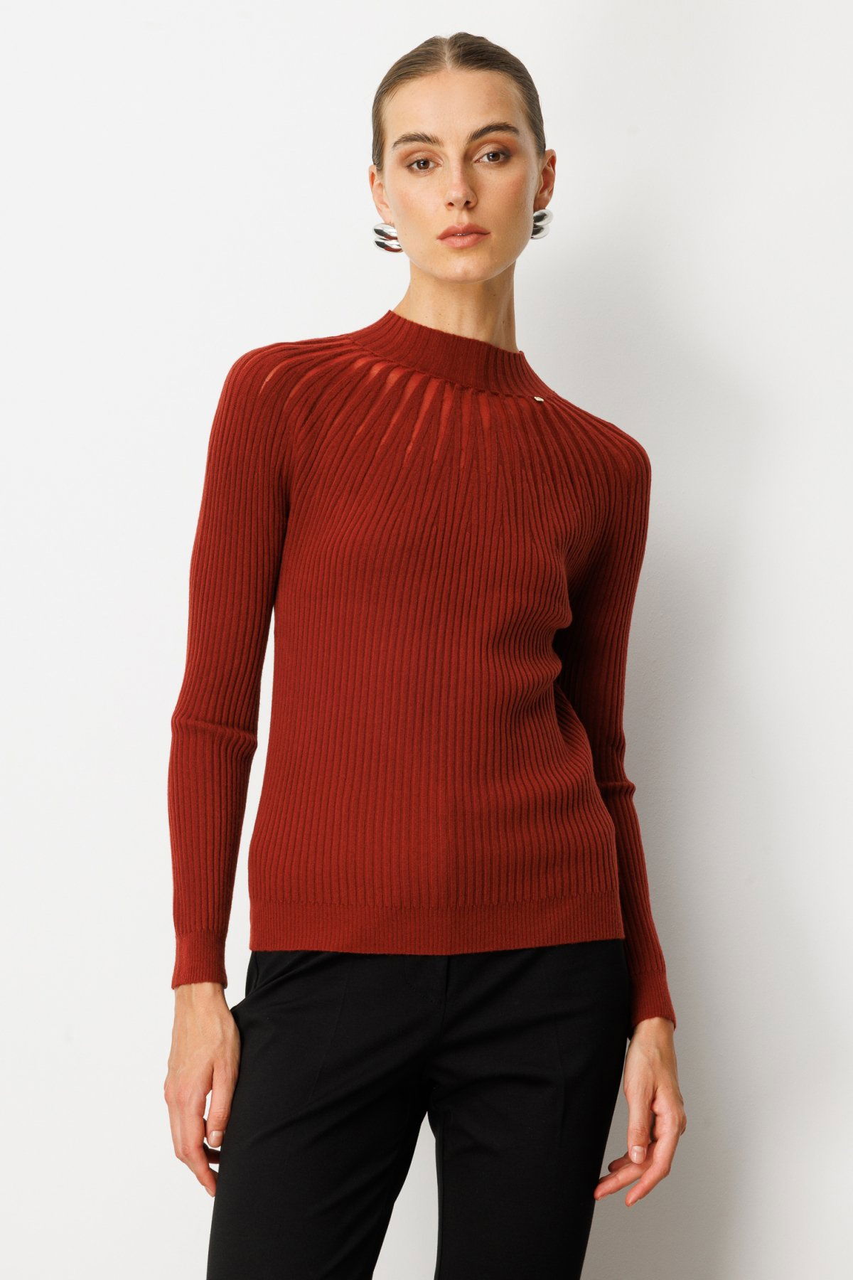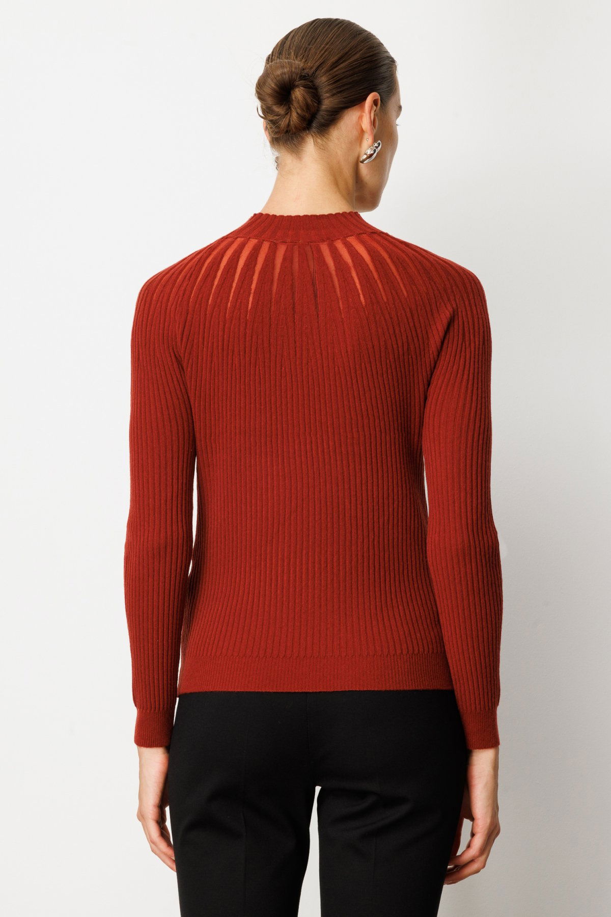 On Kadın Dik Yaka Tül Detaylı Triko Kazak 60384 Bordo