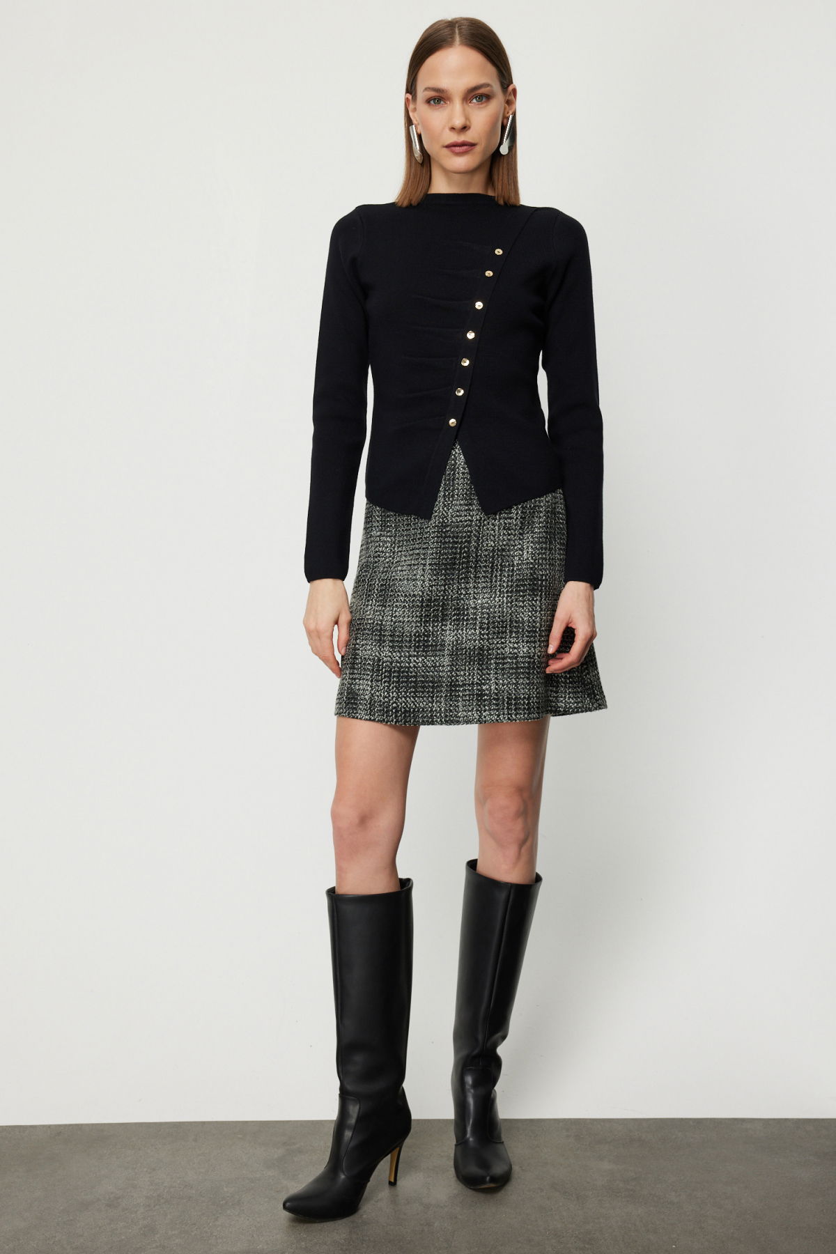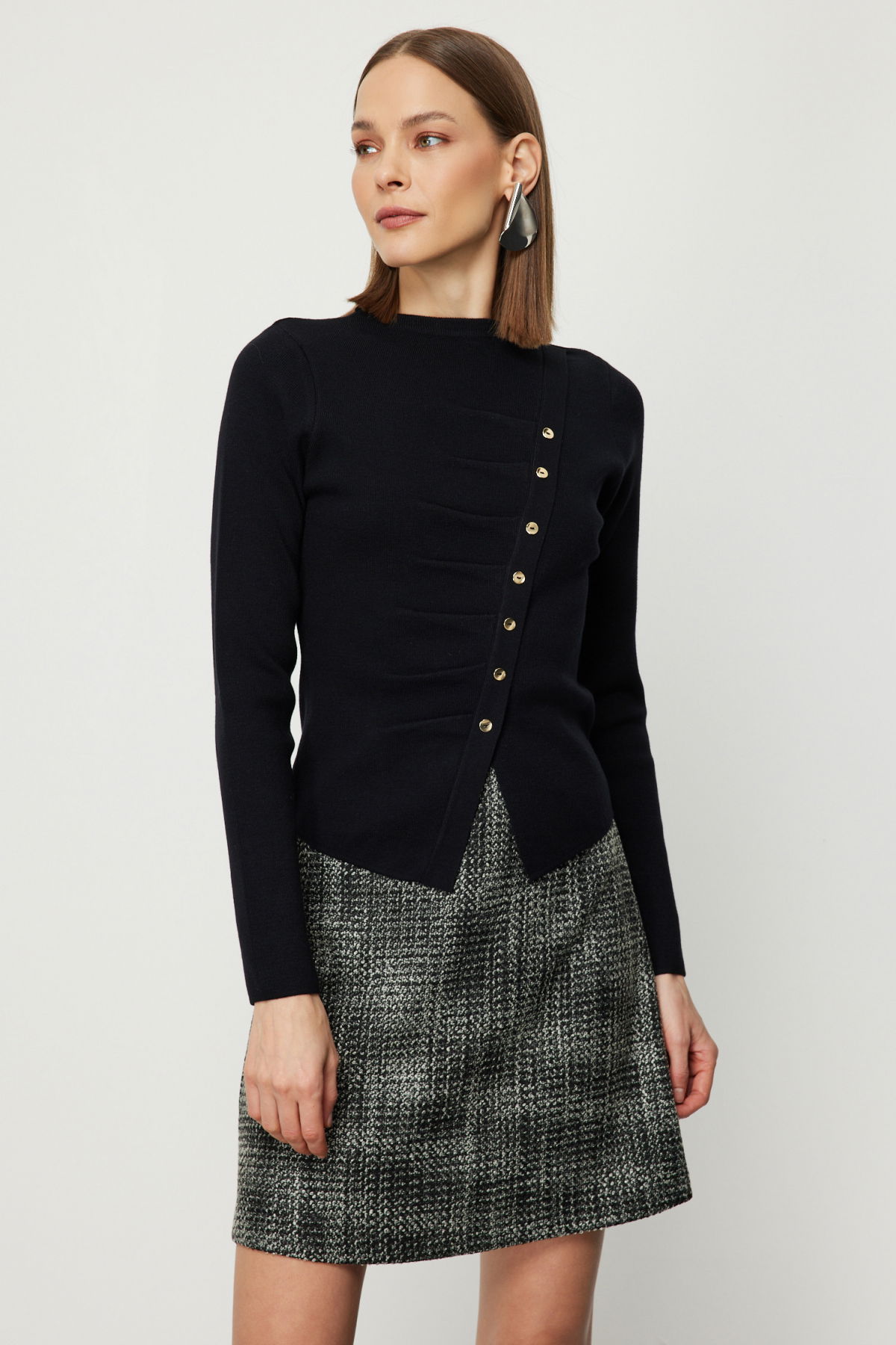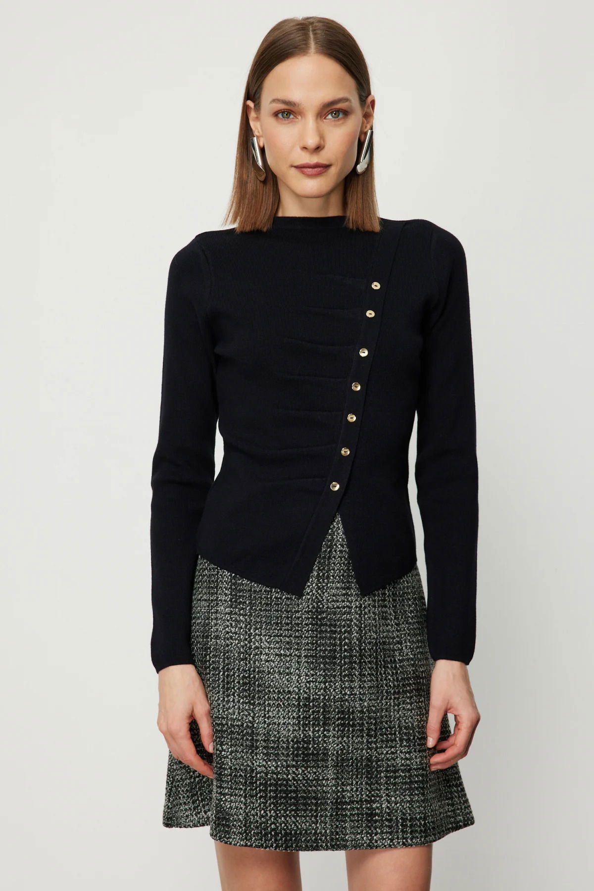 On Kadın Drape Detaylı Düğmeli Triko Kazak 65339 Siyah