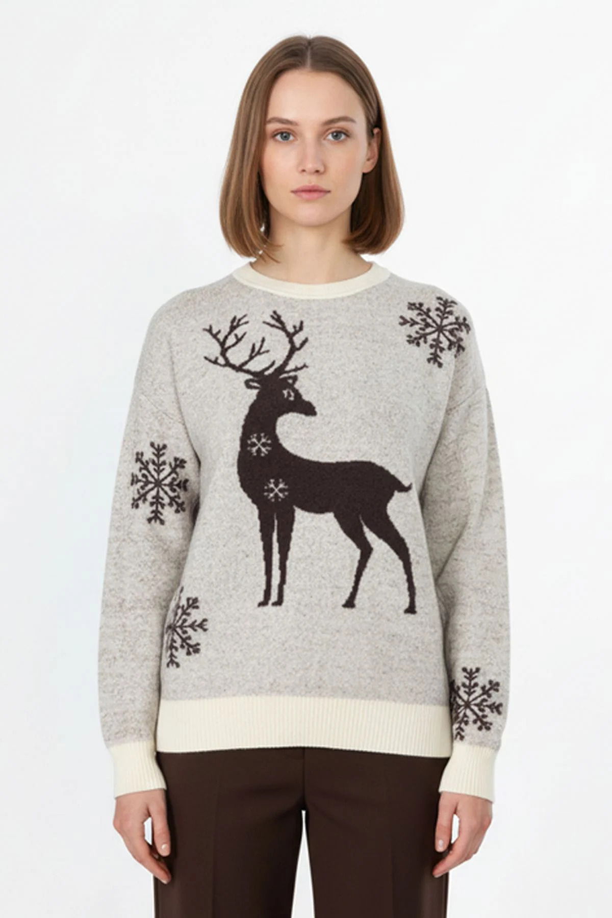 On Kadın Geyik Desenli Triko Kazak 63324 Ekru