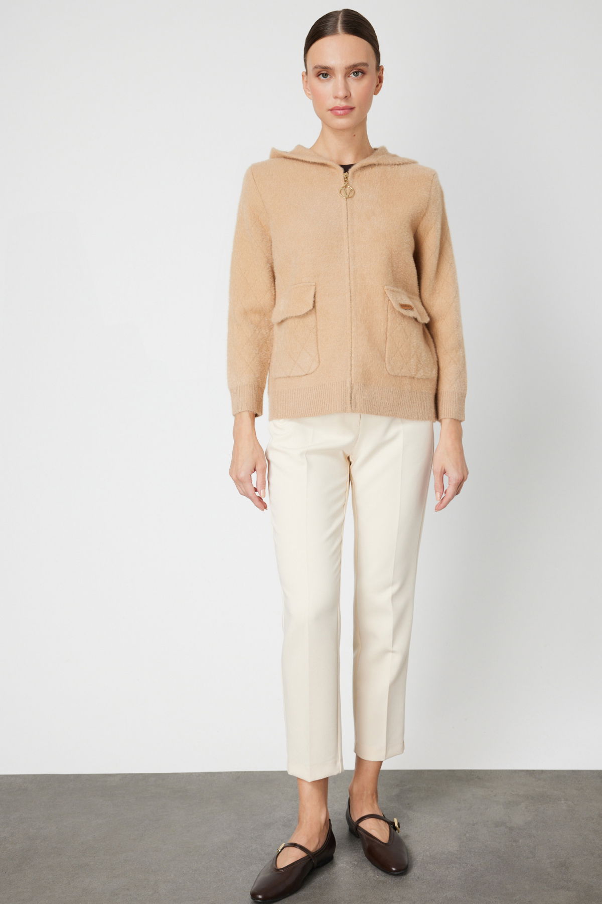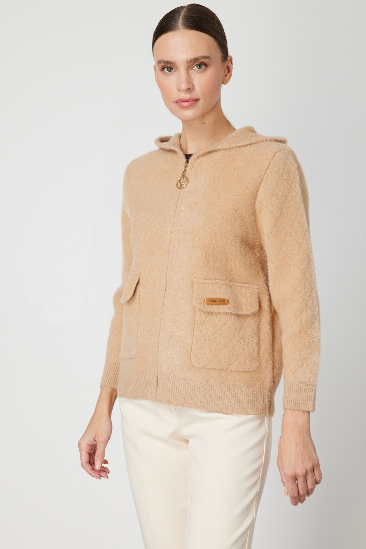 On Kadın Kapak Cepli Peluş Hırka 60936 Bej