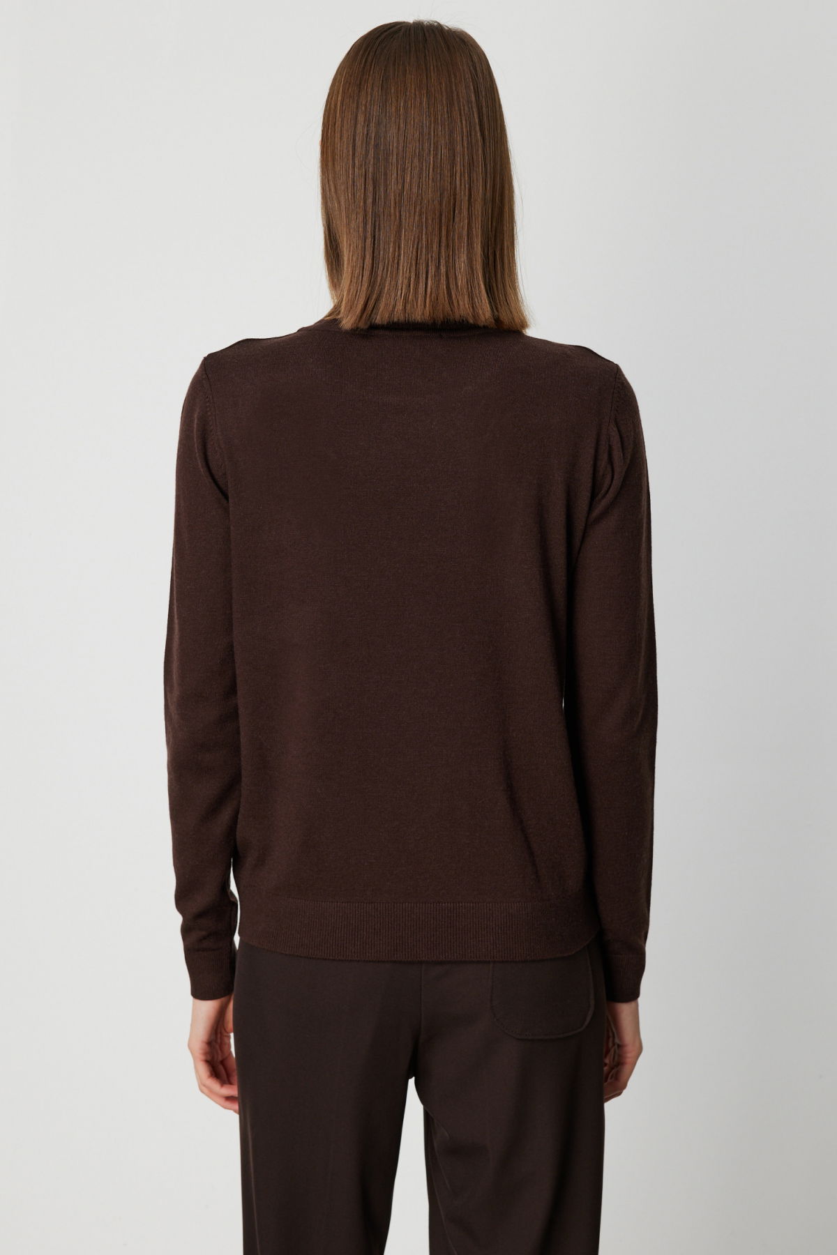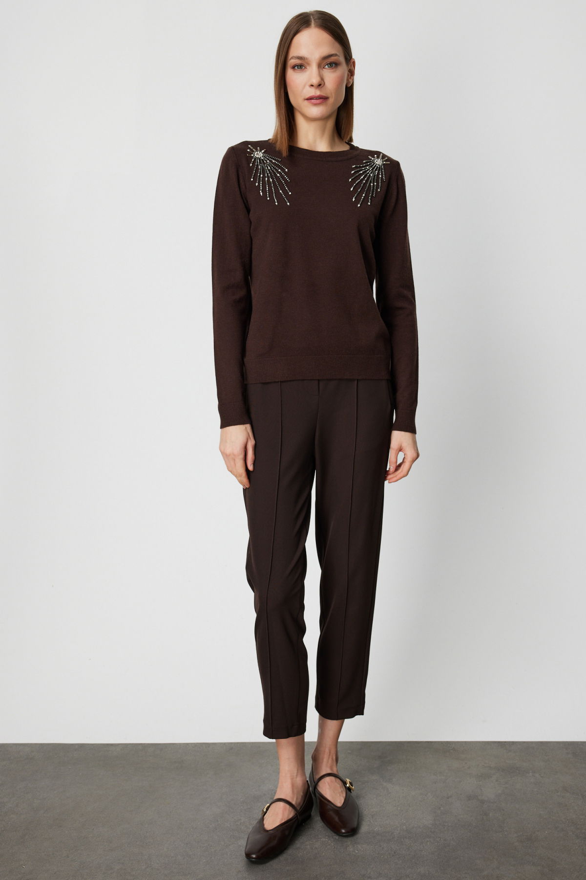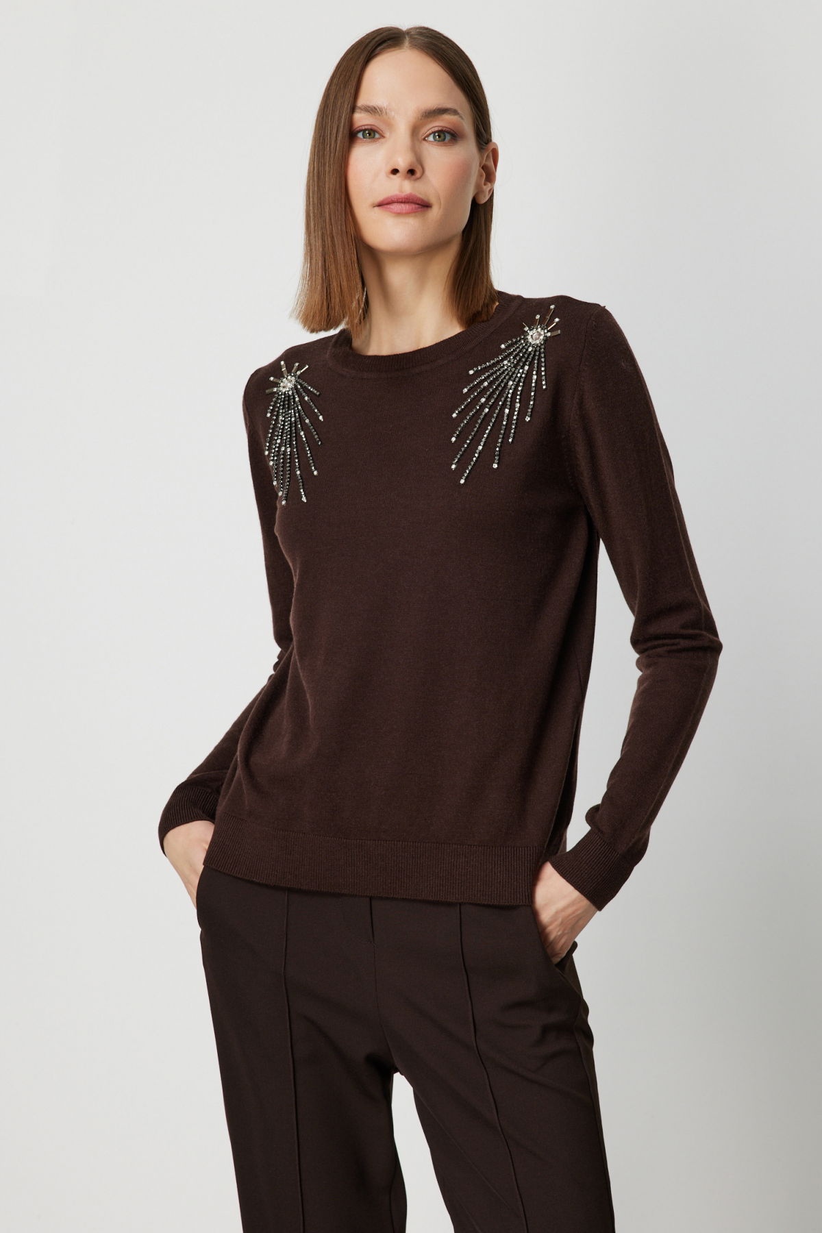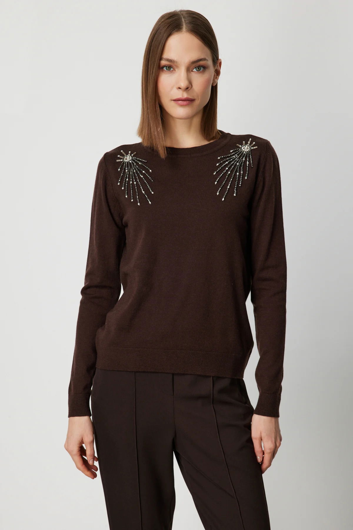 On Kadın Omzu Taş Detaylı Triko Kazak 63314 Kahverengi