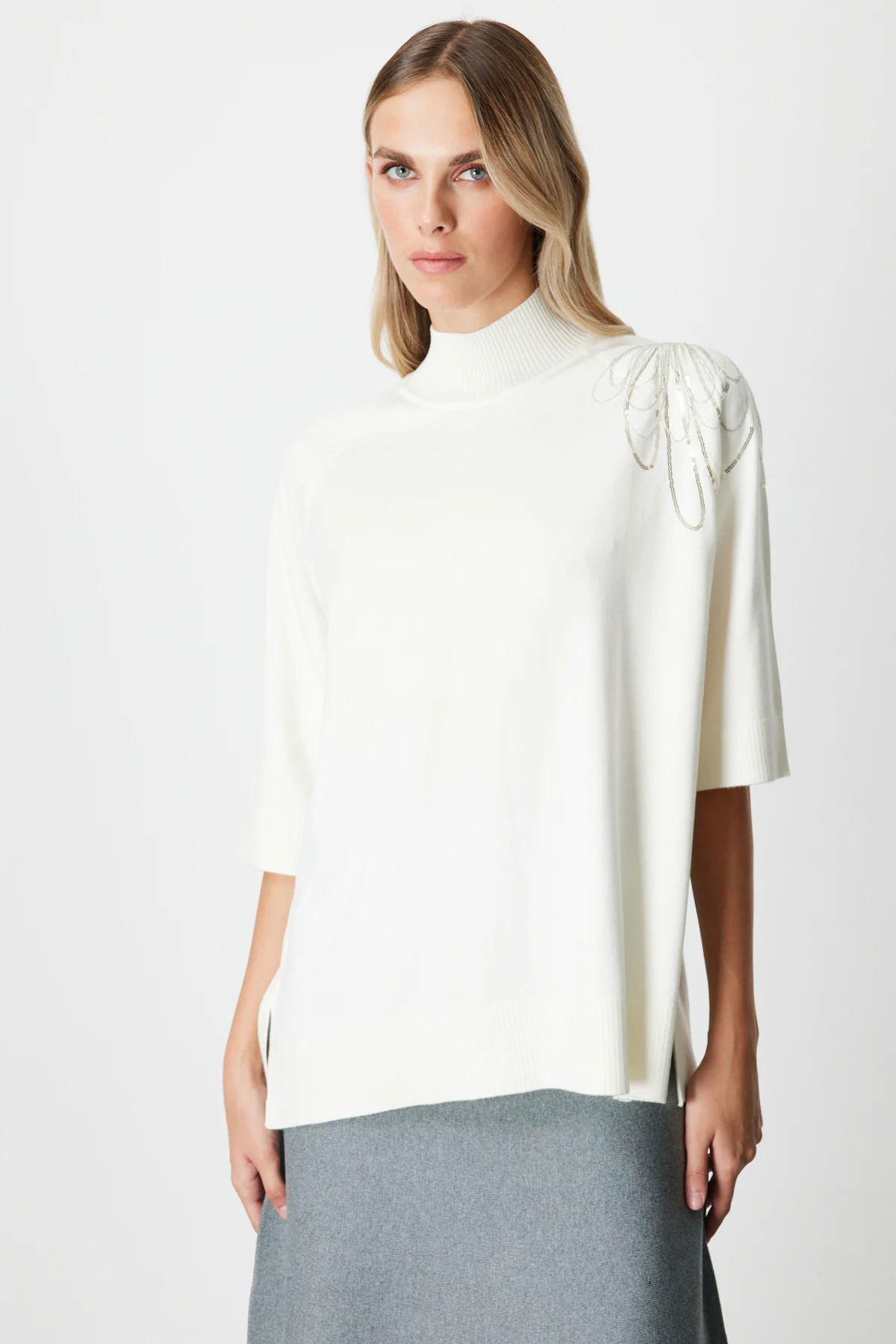 Detay: Bu astarsız triko kazak, dik yaka tasarımıyla modern ve sofistike bir görünüm sunarken, truvakar uzunluğundaki yarım kol detayıyla mevsim geçişleri için ideal bir seçenek oluşturur. Triko kumaşın yumuşak ve esnek dokusu sayesinde gün boyu konforlu bir kullanım sağlar. Minimal ve zarif çizgileriyle hem günlük kombinlere hem de ofis stiline kolayca uyum sağlayan bu kazak, sade şıklığı sevenler için vazgeçilmez bir parça olmaya aday;