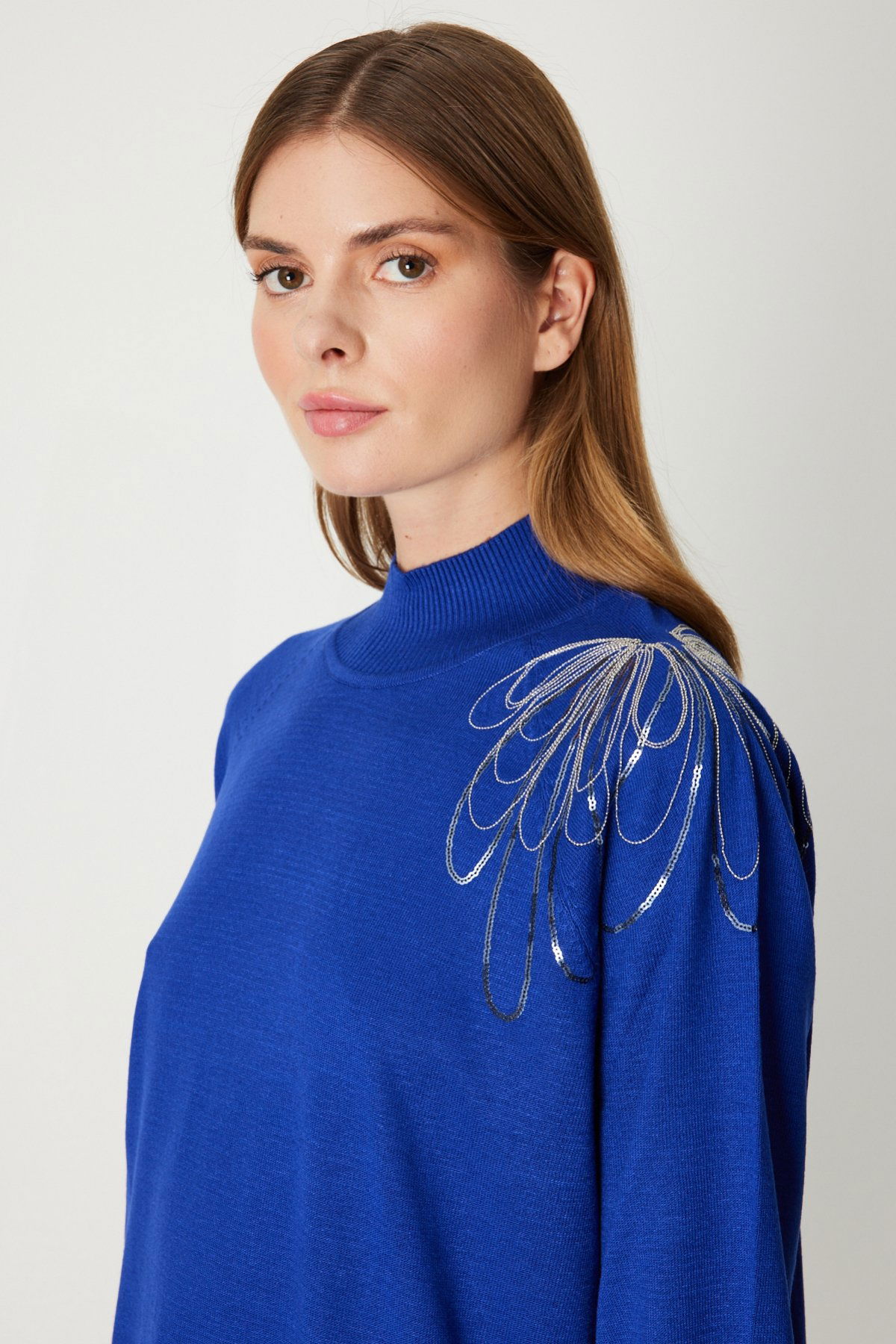On Kadın Omzu Zincir İşlemeli Triko Kazak 65381 Saks