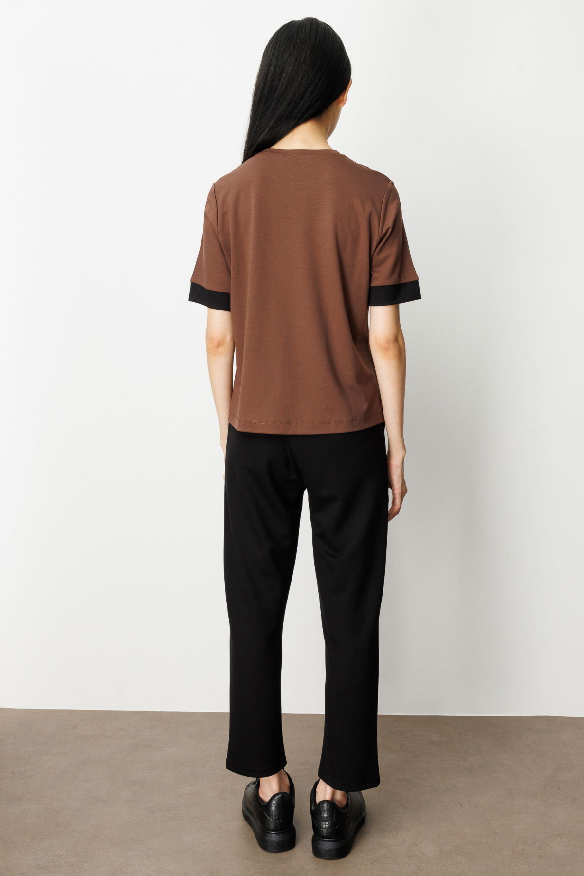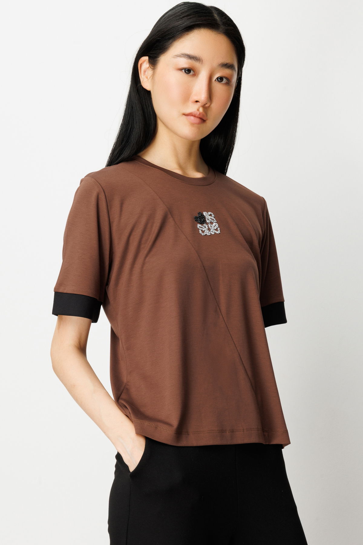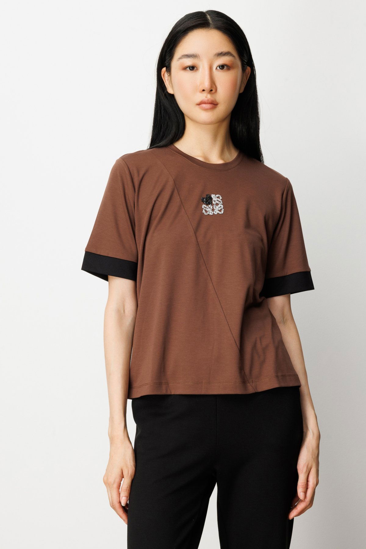 On Kadın Önü Taşlı Sıfır Yaka Bluz 61331 Kahve-Siyah