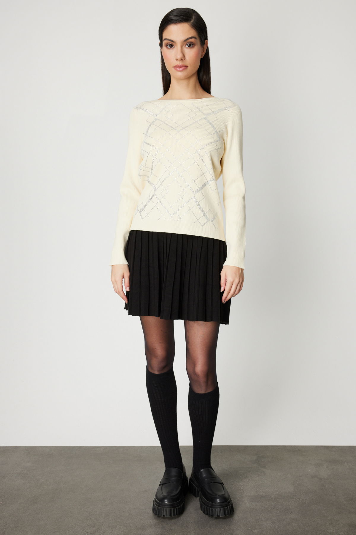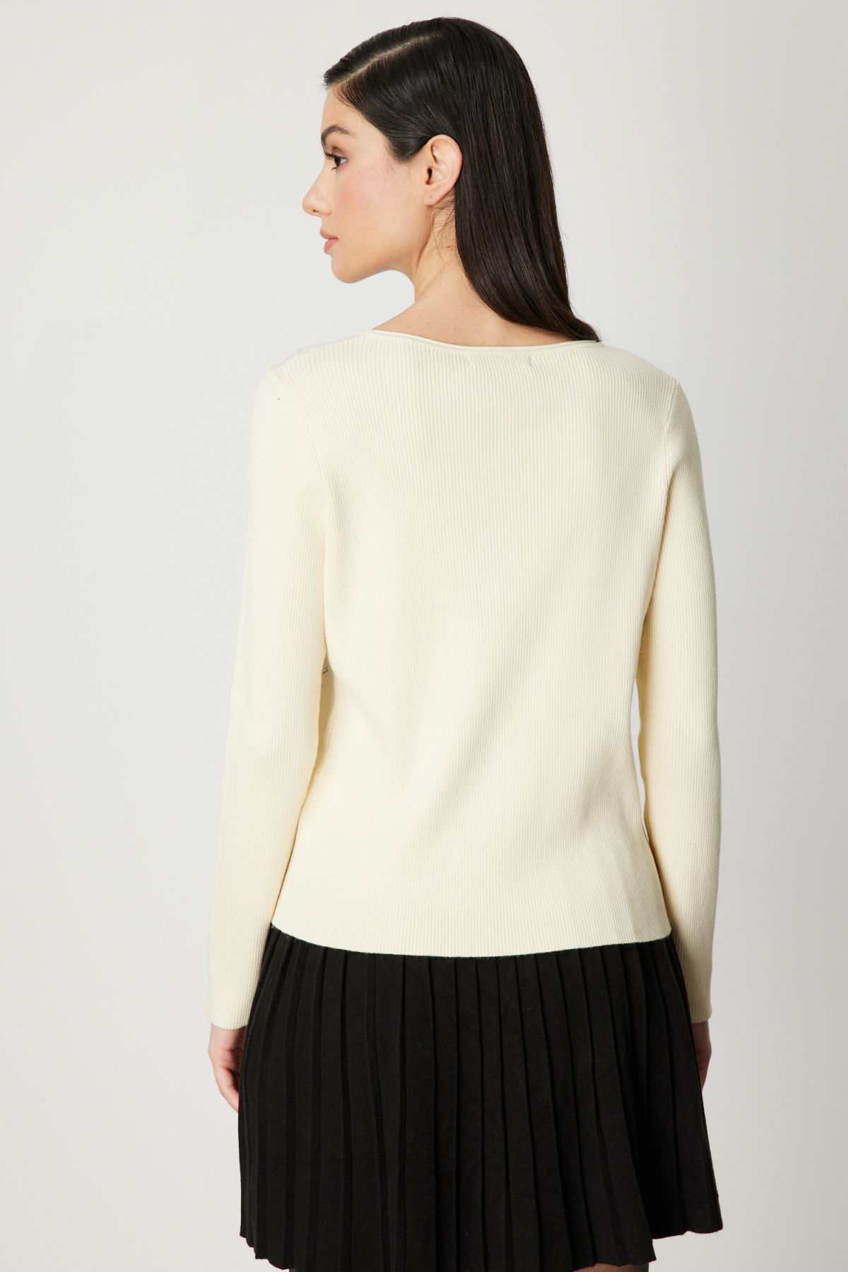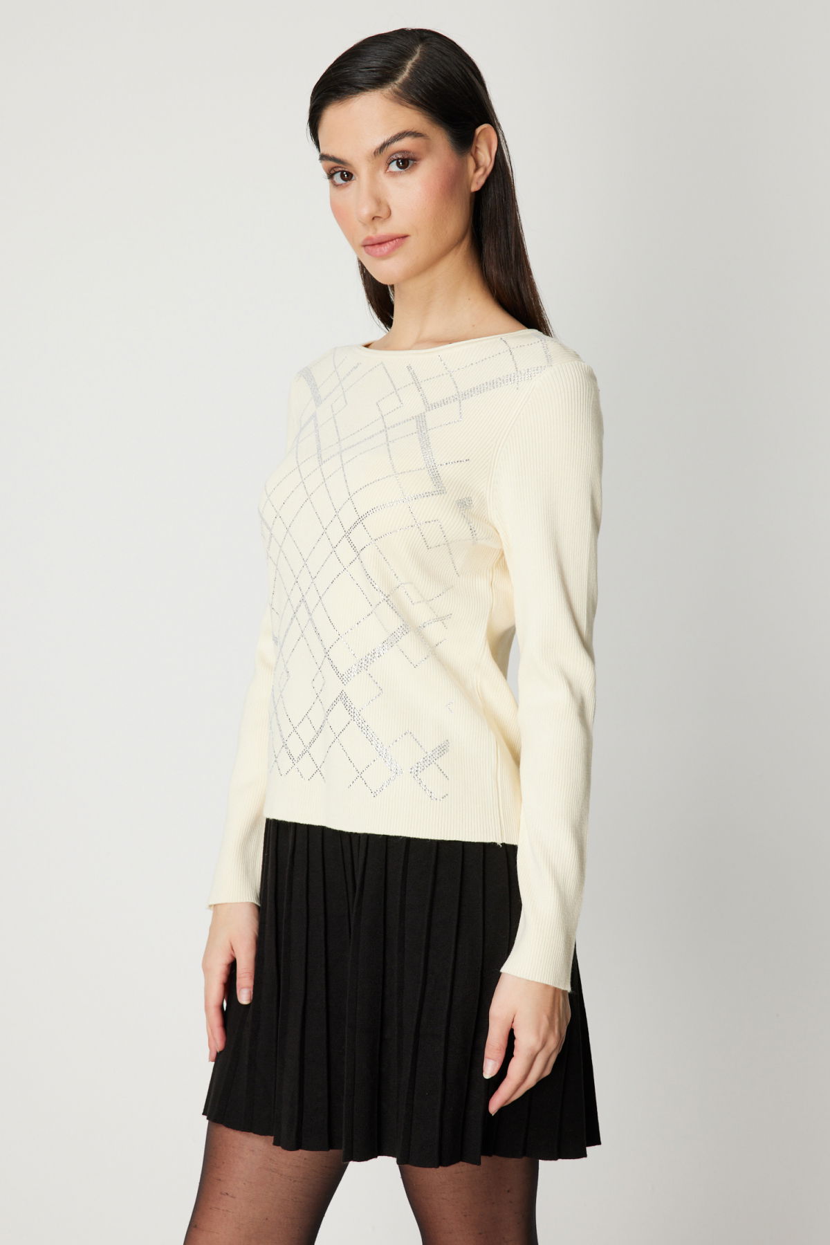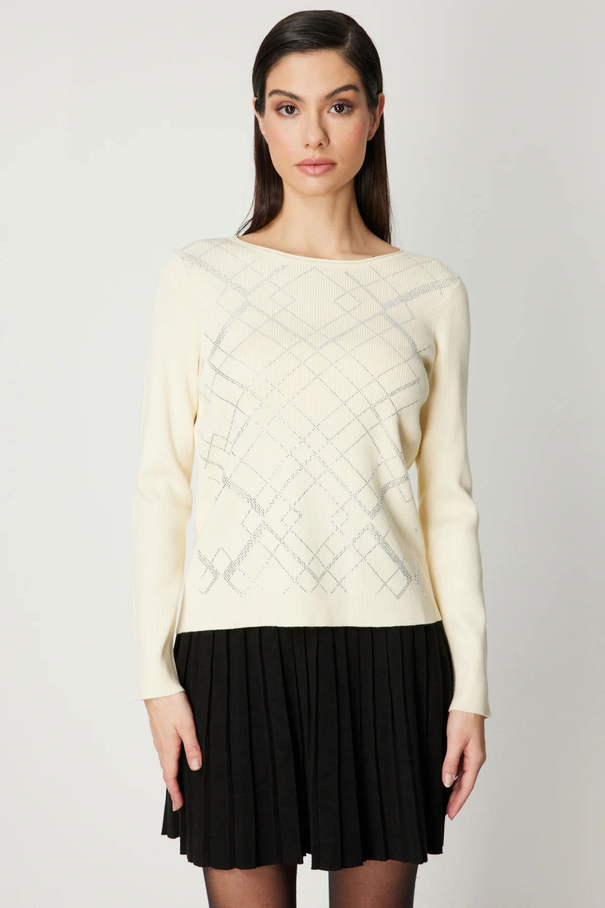 On Kadın Önü Taşlı Sıfır Yaka Triko Kazak 60353 Ekru