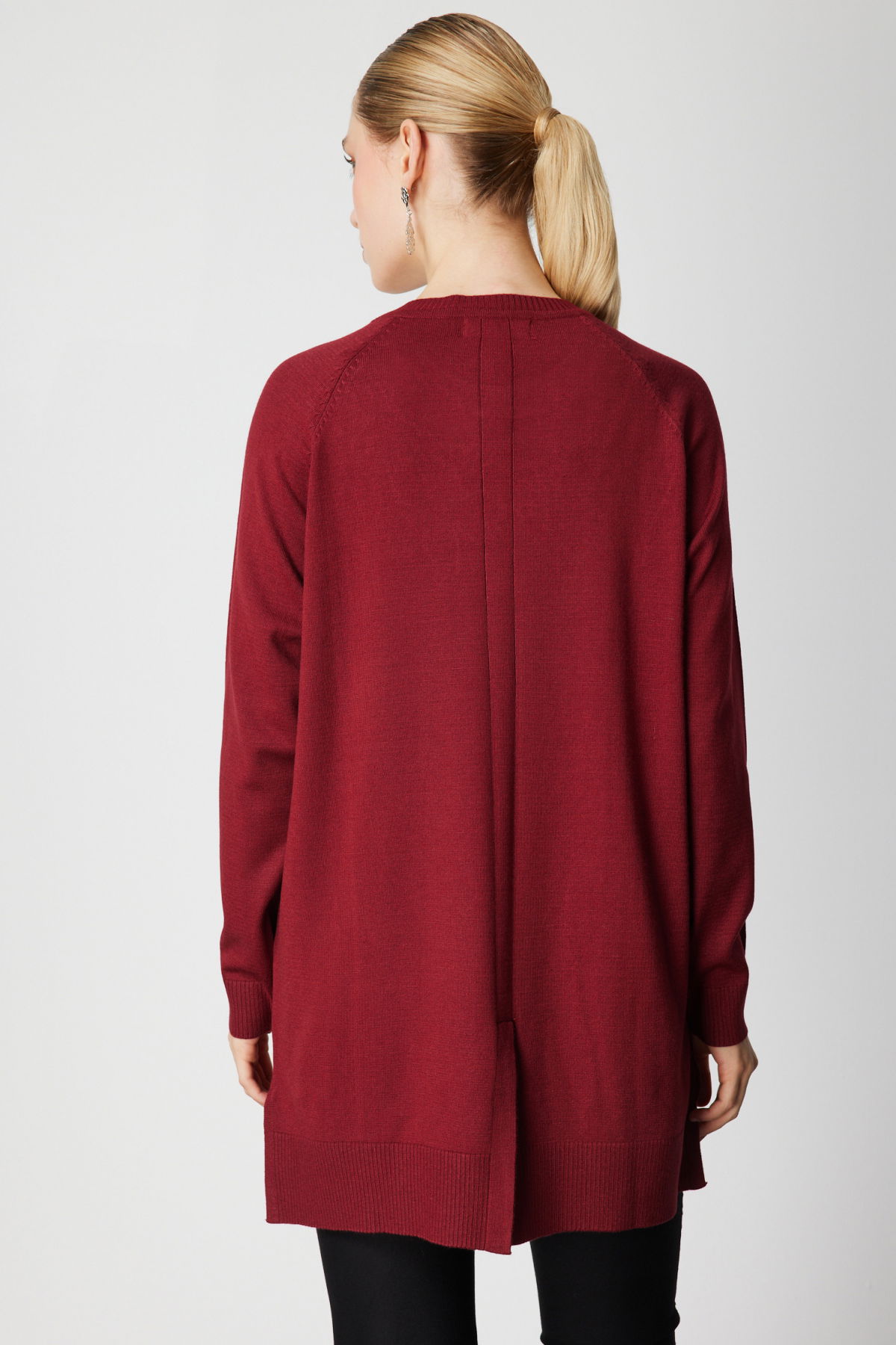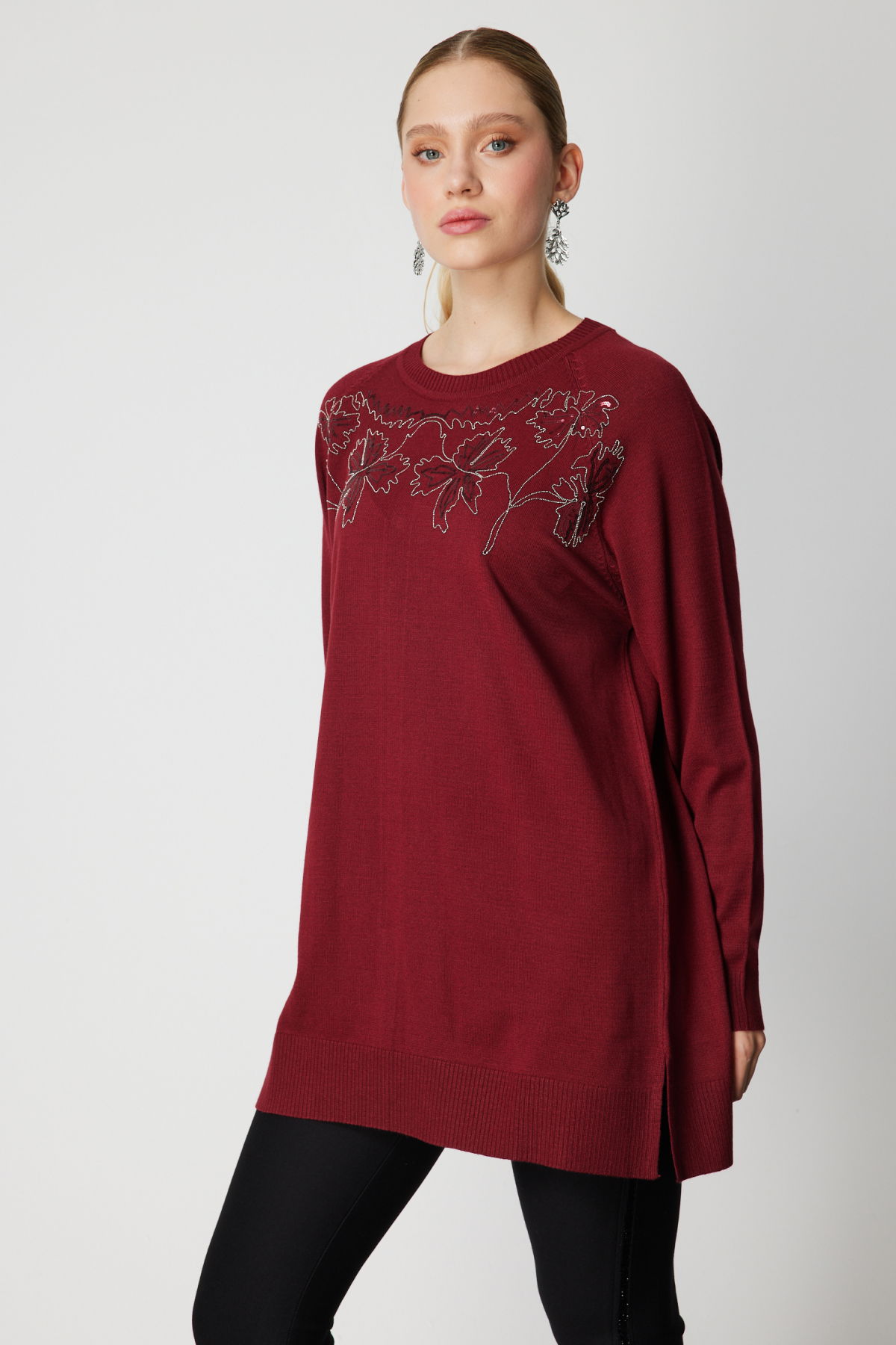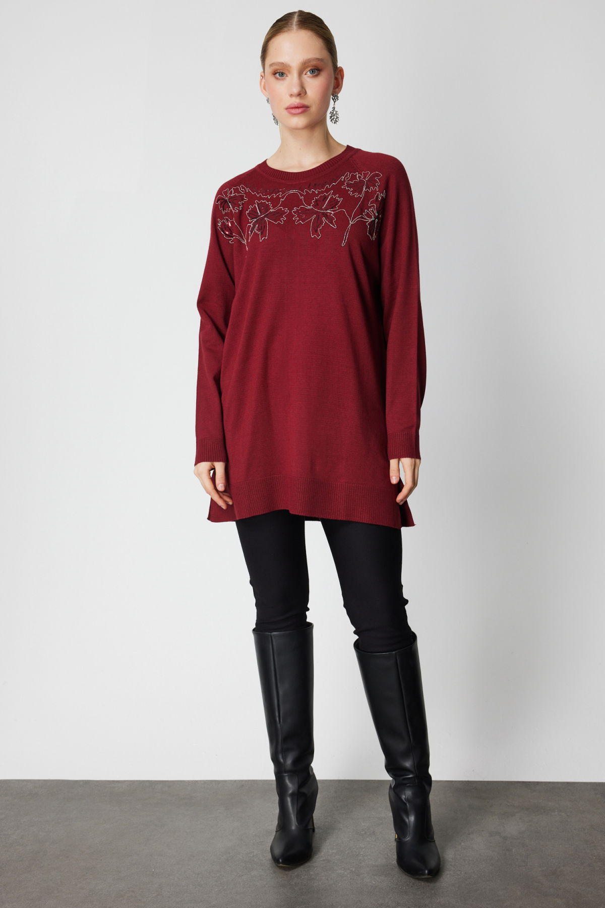 On Kadın Önü Zincirli Desenli Uzun Triko Kazak 65387 Bordo
