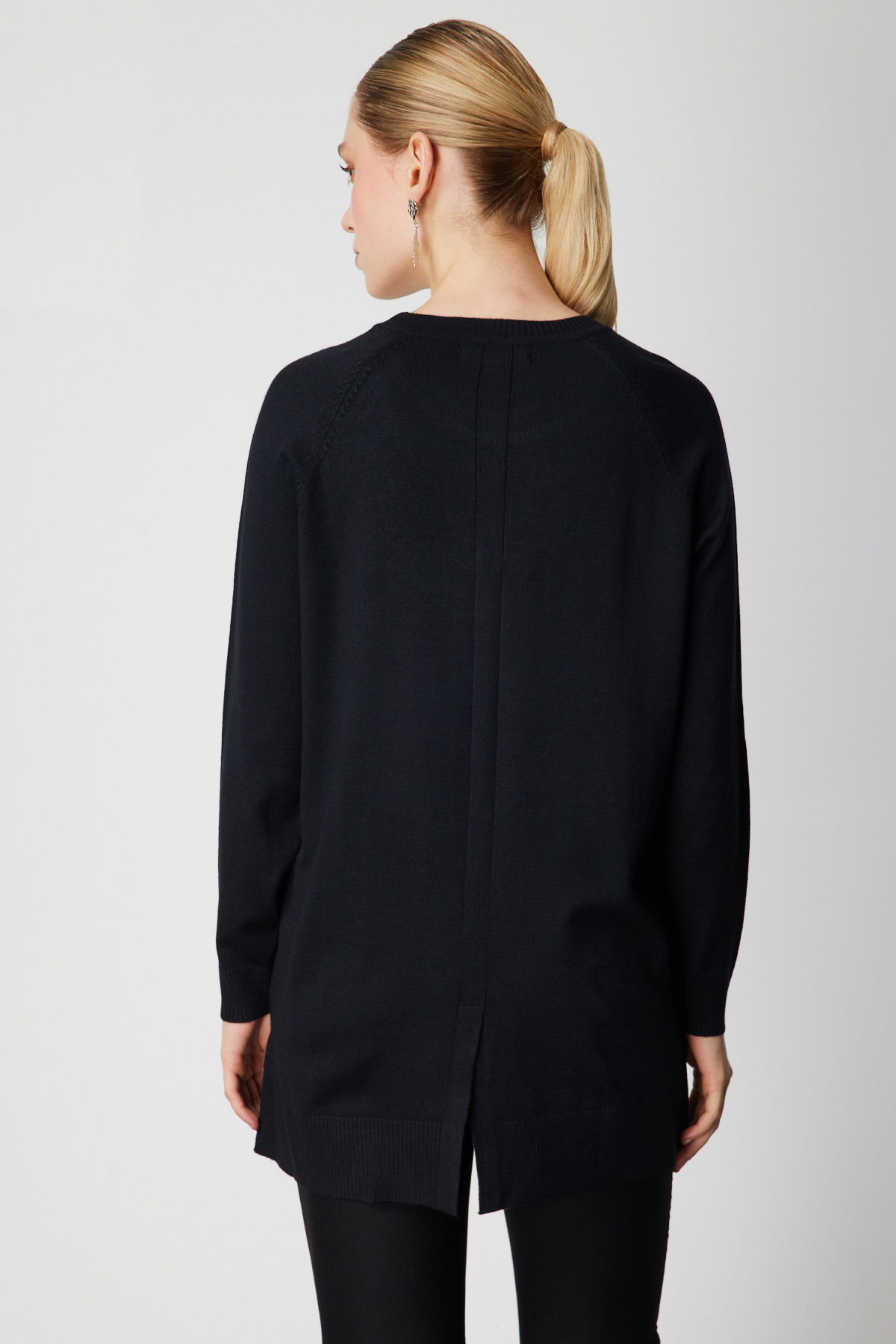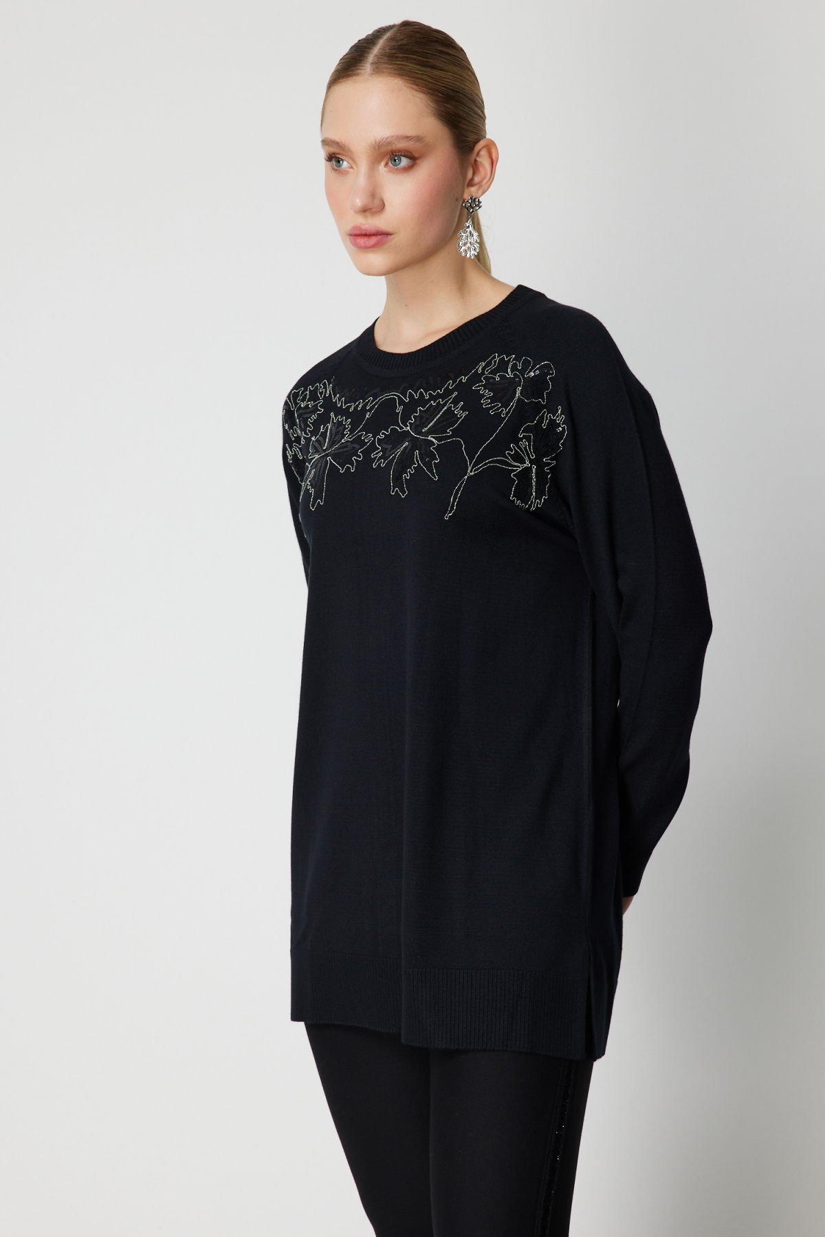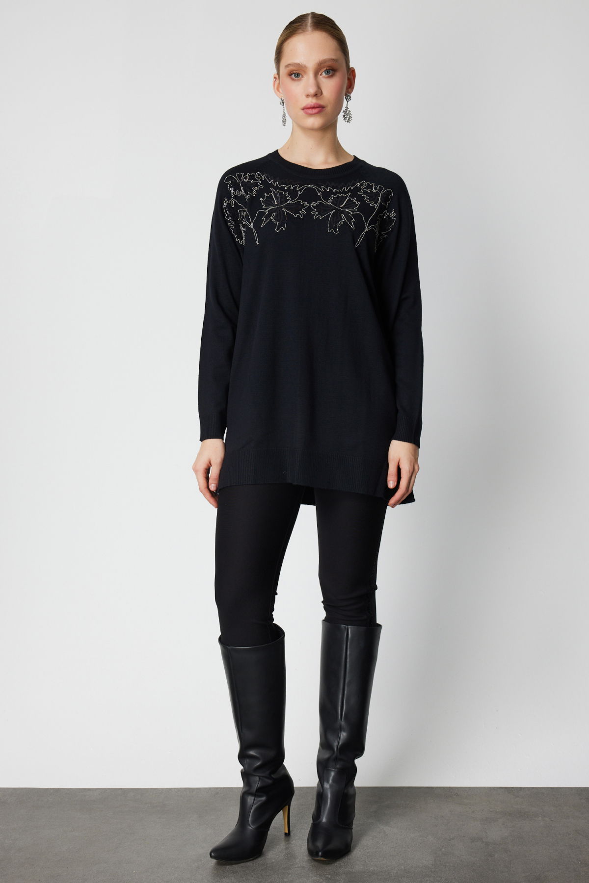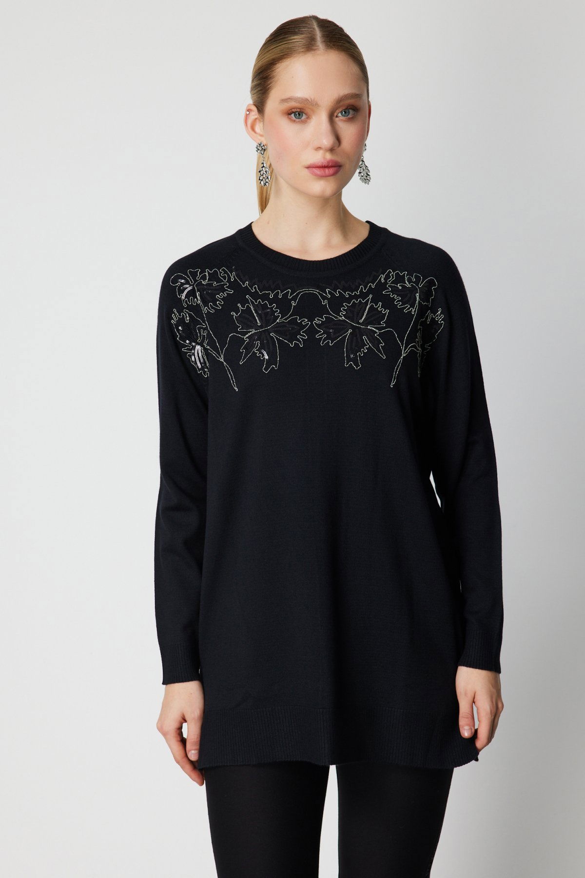 On Kadın Önü Zincirli Desenli Uzun Triko Kazak 65387 Siyah