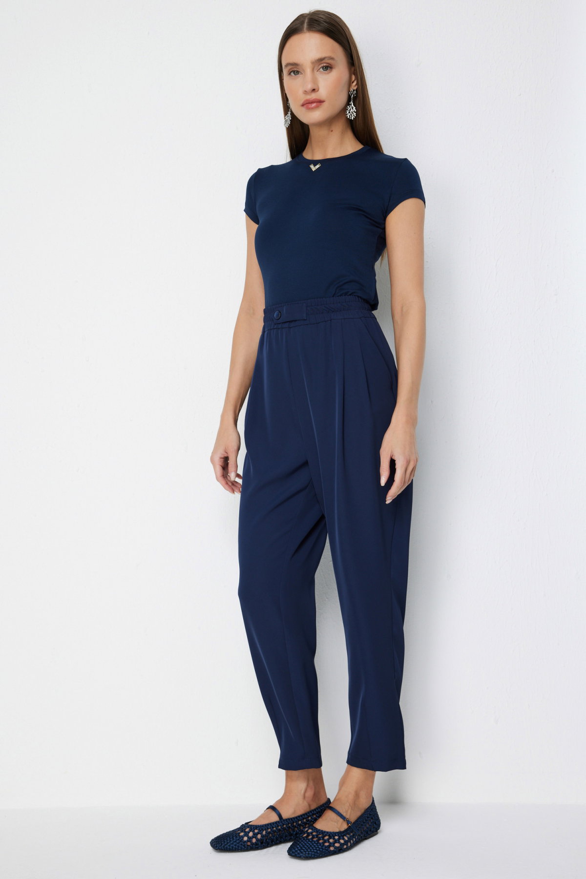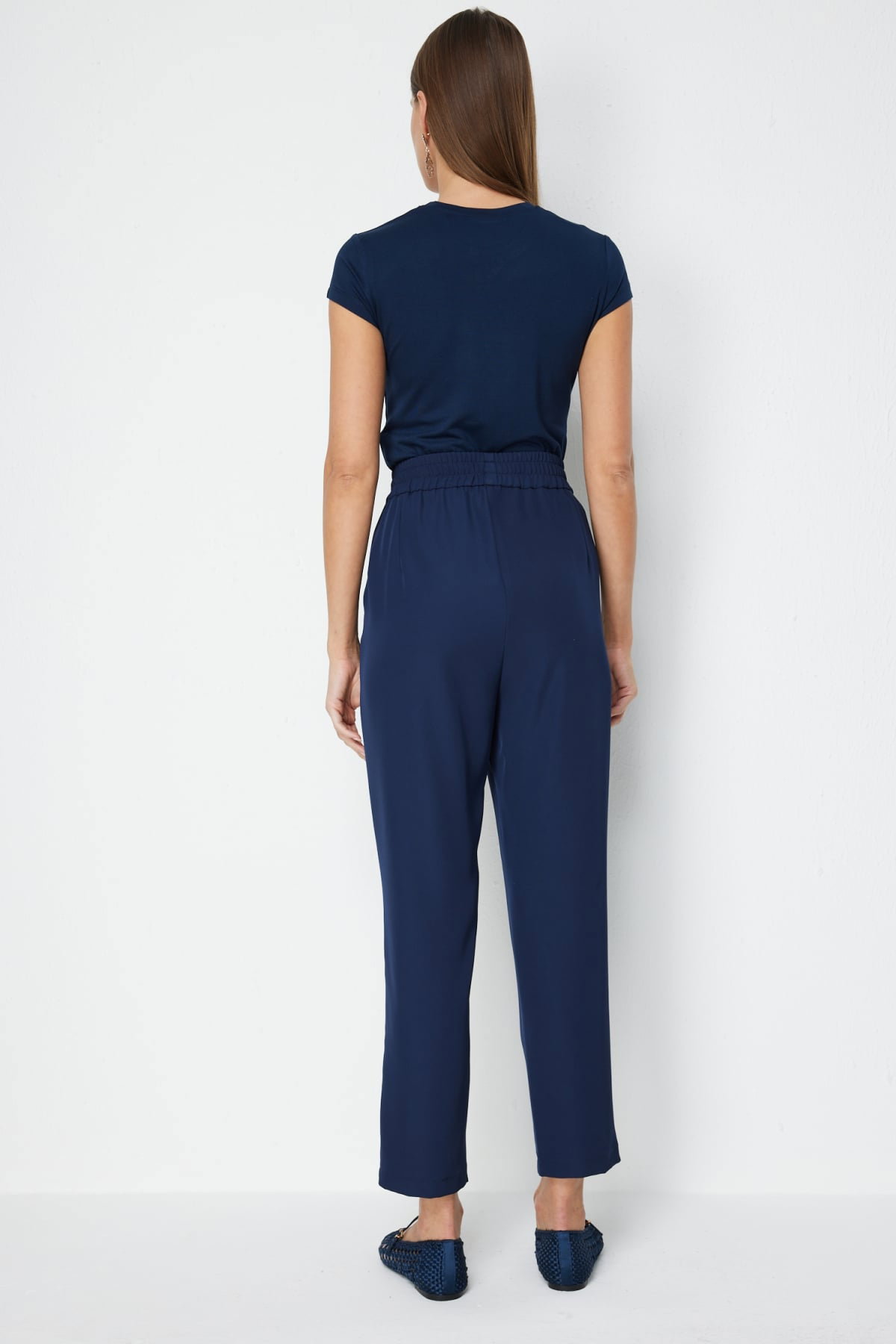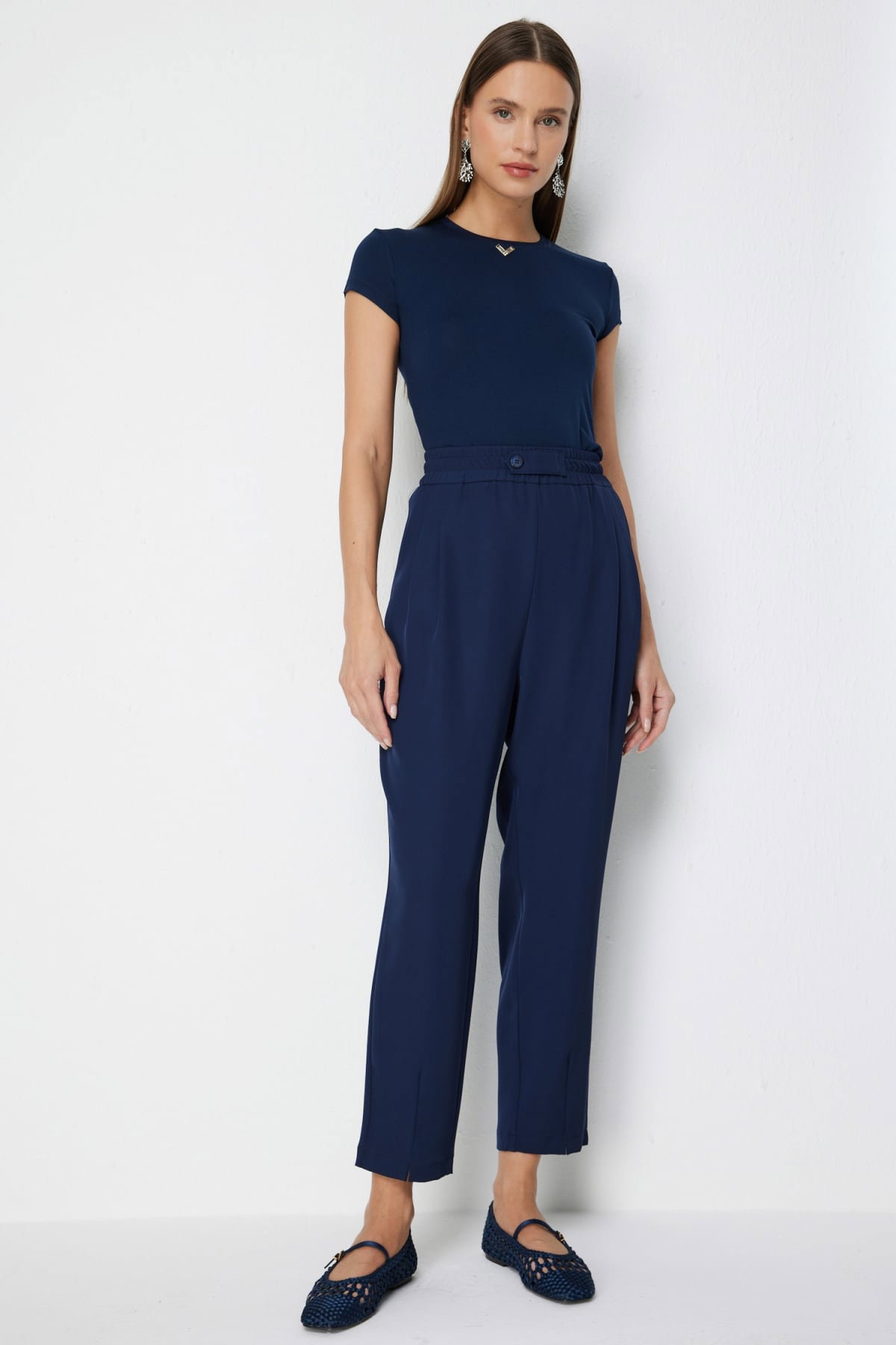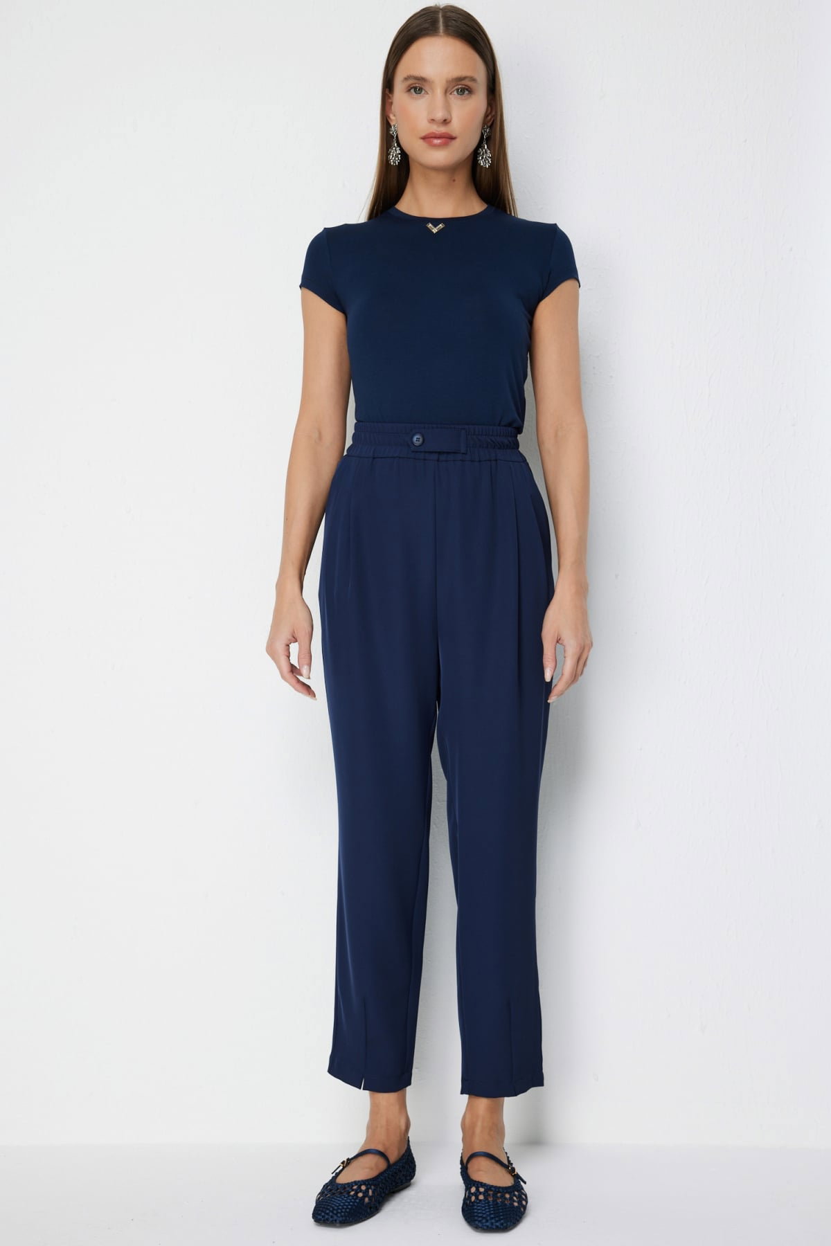 Detay:Dokuma kumaştan üretilen, astarsız yapıya sahip, lastikli bel, dar paça ve yan cepli bu pantolon modern ve konforlu bir tasarıma sahiptir; astarsız oluşu hafiflik ve rahatlık sağlarken dokuma kumaşın kaliteli dokusu şık bir duruş kazandırır, lastikli bel detayı pratik kullanım ve esneklik sunar, dar paça formu modern bir görünüm ortaya koyar, yan cepler ise günlük kullanımda fonksiyonel bir kolaylık sağlar;