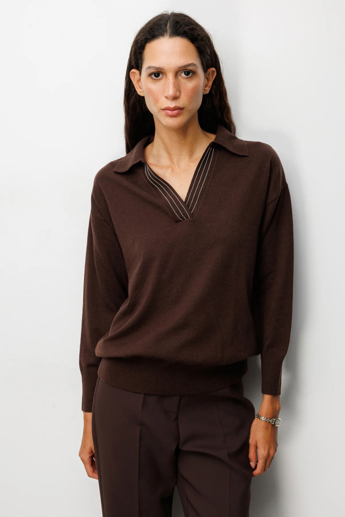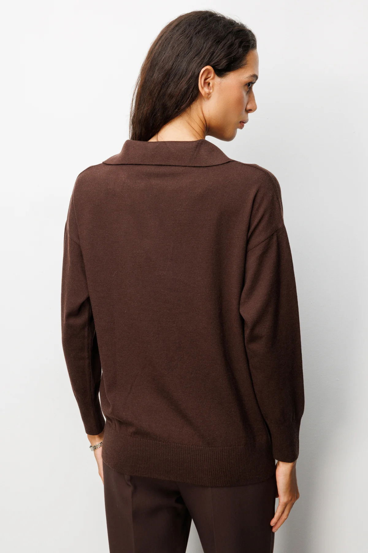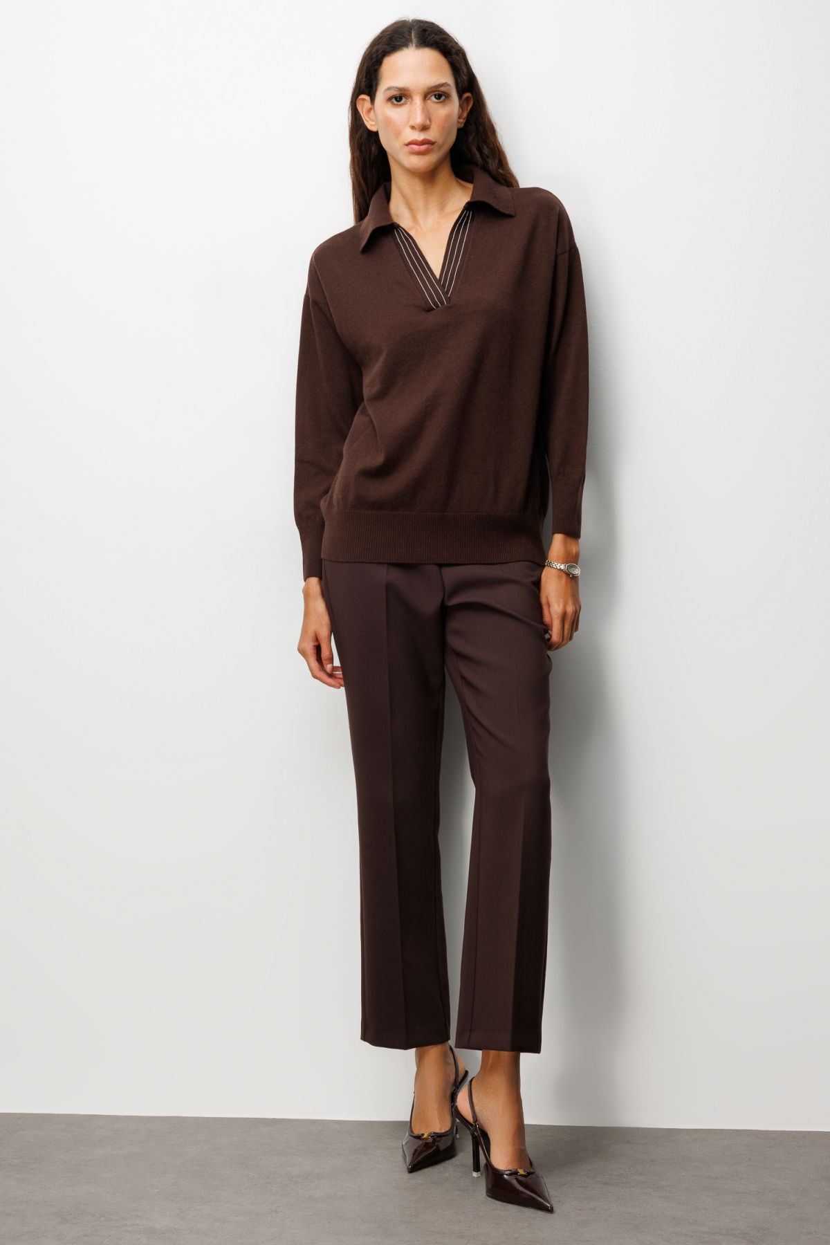 On Kadın Polo Yaka Zincir Detaylı Triko Kazak 66336 Kahverengi