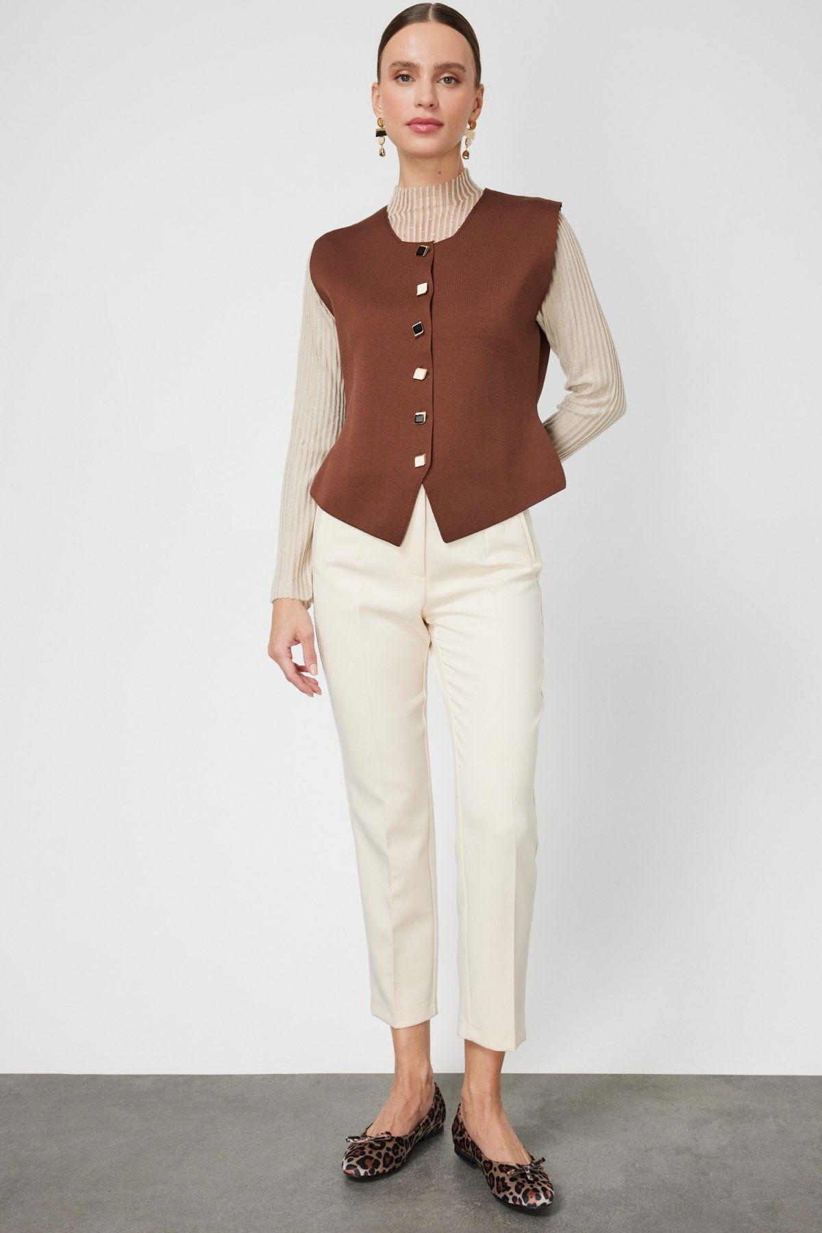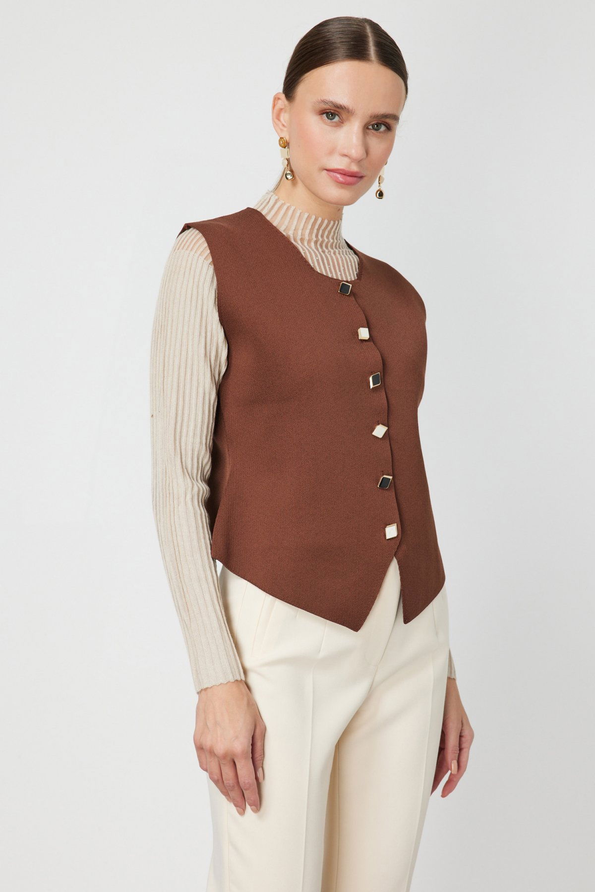 Detay: Sıfır yaka tasarımıyla sade ve modern bir duruş sergileyen bu triko yelek, astarsız yapısıyla hafiflik ve konfor sunar. Kolsuz formu sayesinde mevsim geçişlerinde rahatlıkla kullanılabilirken, düğmeli kapama detayıyla klasik şıklığı tamamlar. Günlük kombinlerden ofis stiline kadar geniş bir kullanım alanı sunan bu yelek, zarif ve fonksiyonel bir gardırop parçasıdır;