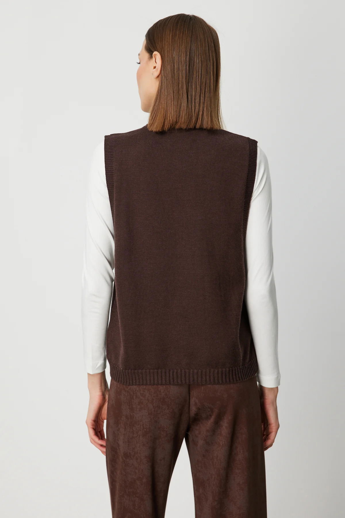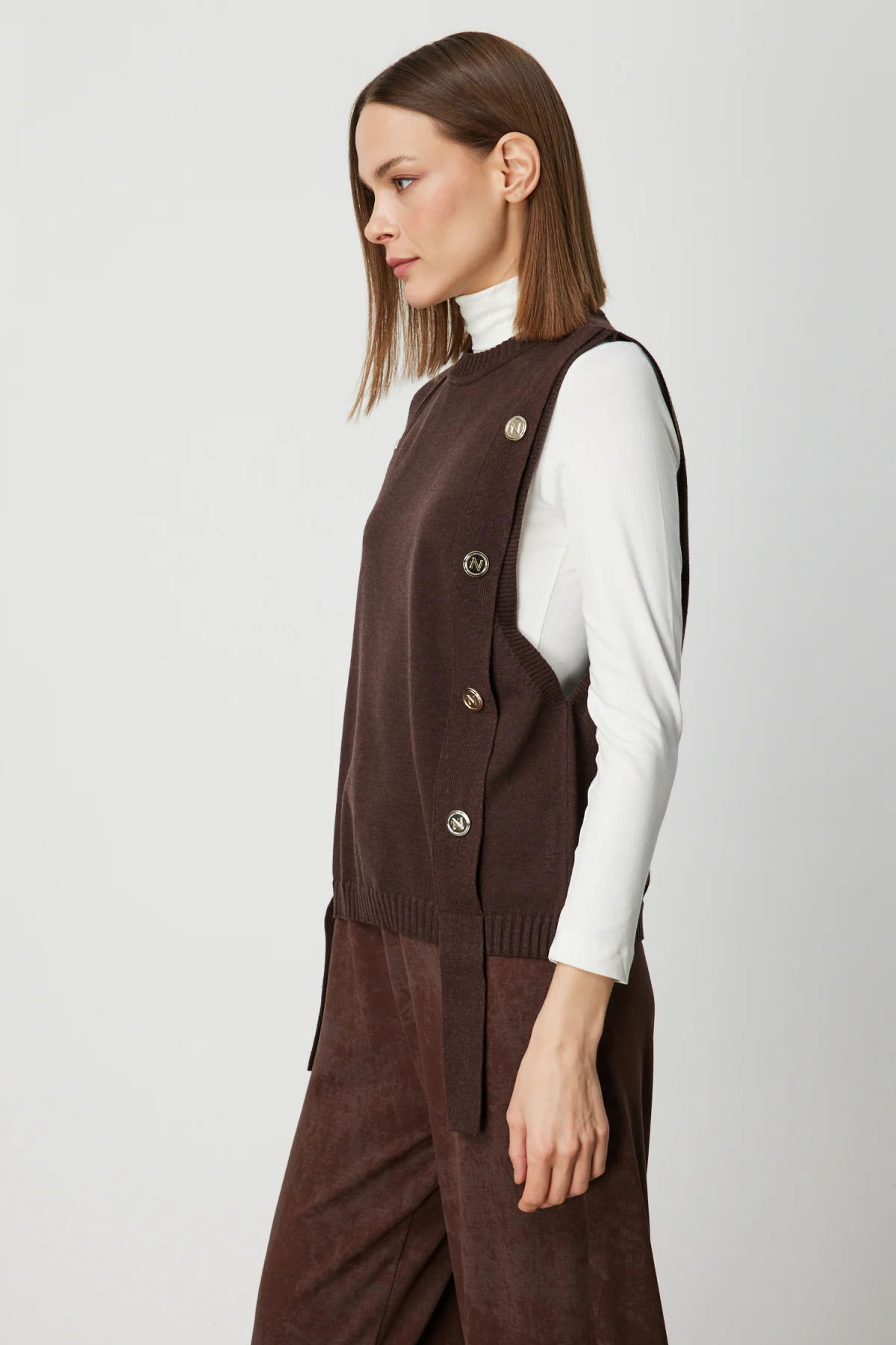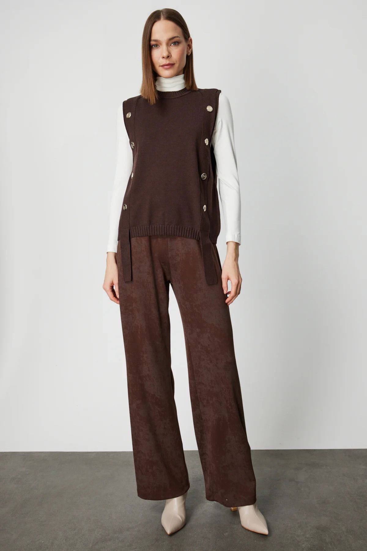 On Kadın Süs Düğmeli Sıfır Yaka Süveter 69310 Kahverengi