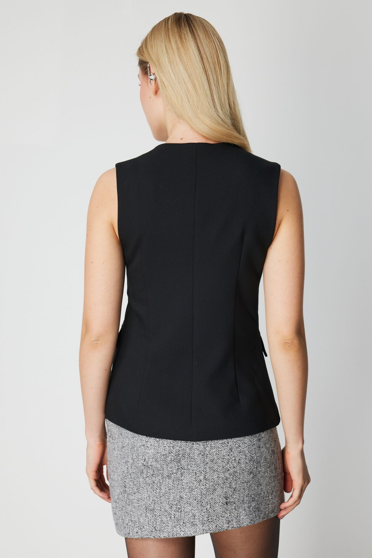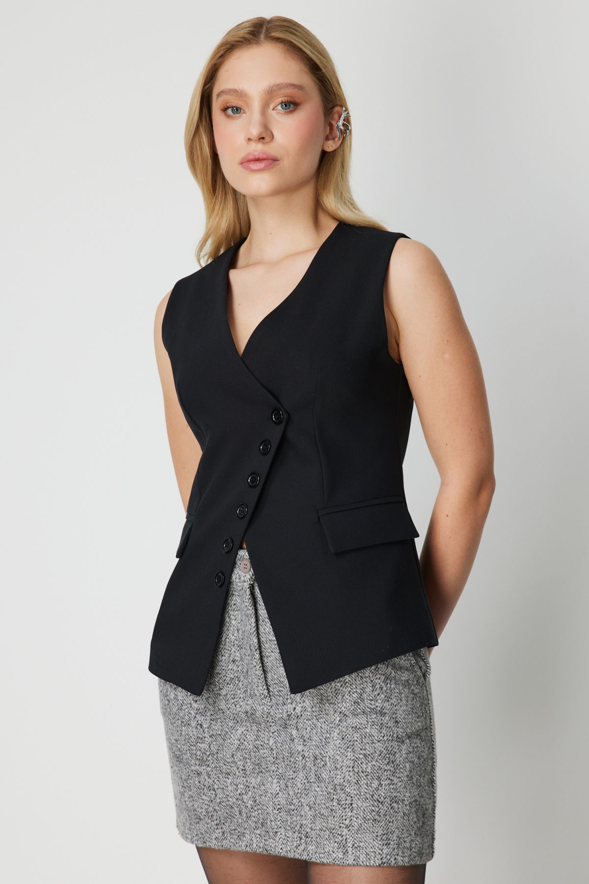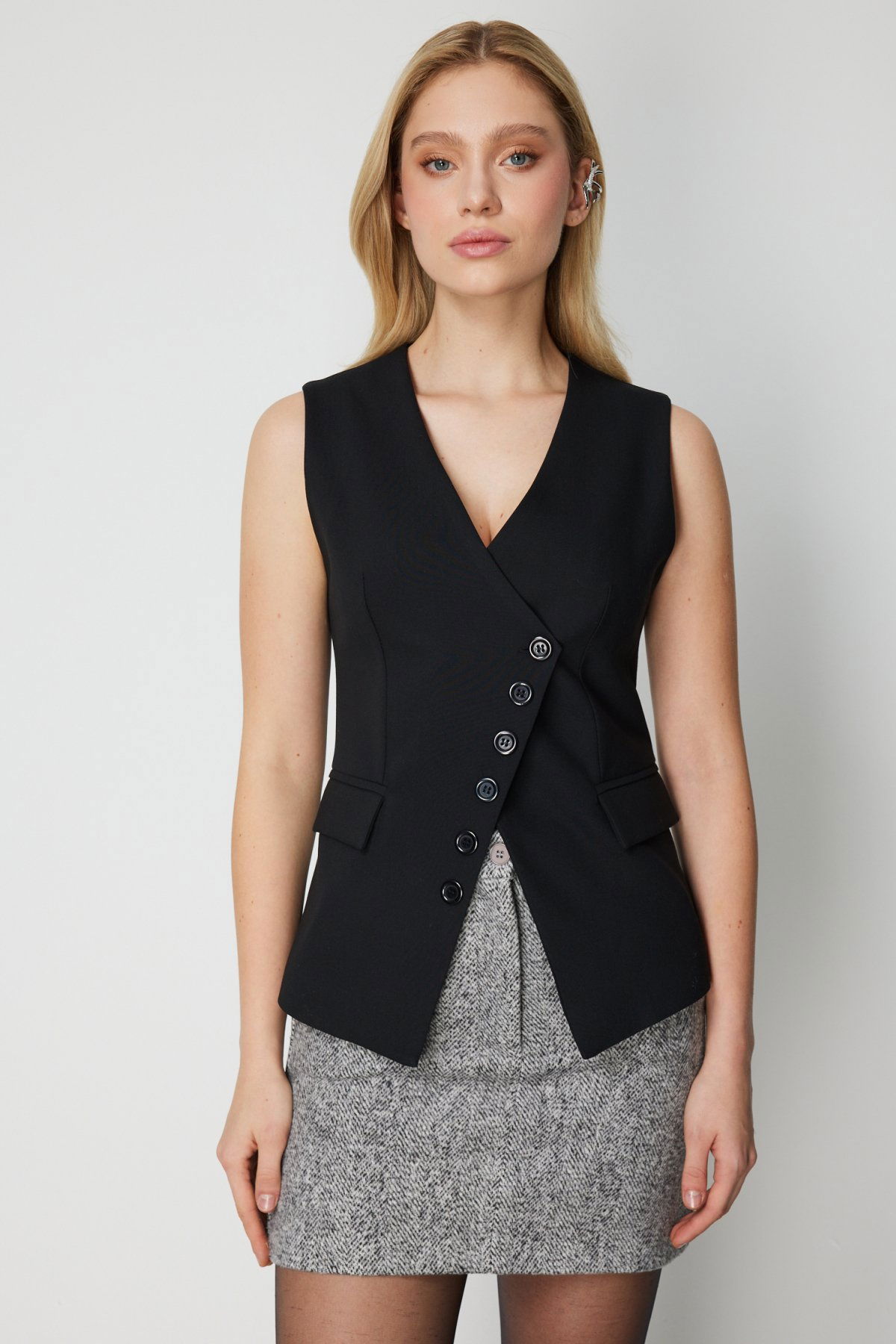 Detay: Astarlı yapısıyla düzgün bir duruş sağlayan bu dokuma kumaş kolsuz yelek, V yaka tasarımı ve düğmeli kapamasıyla klasik şıklığı yansıtır. Cepsiz formuyla sade bir görünüm sunan bu parça, hem resmi hem günlük kombinlerde zarif bir tamamlayıcıdır;