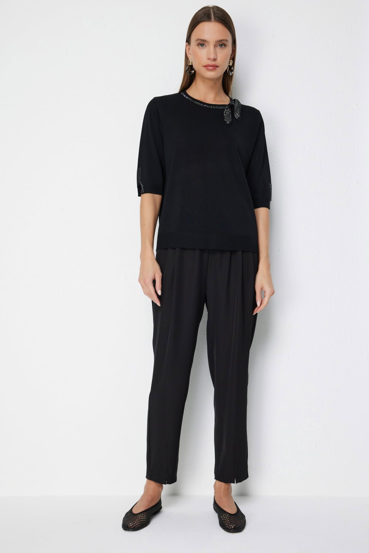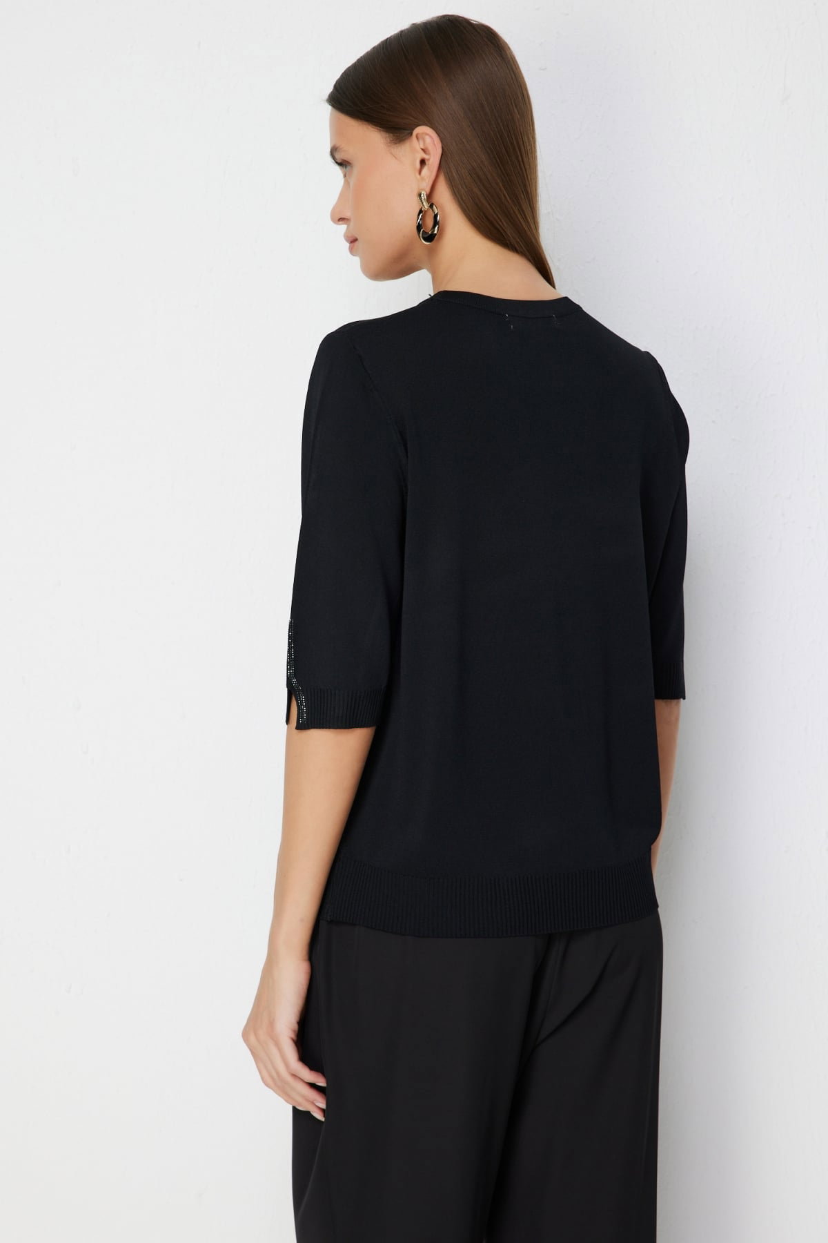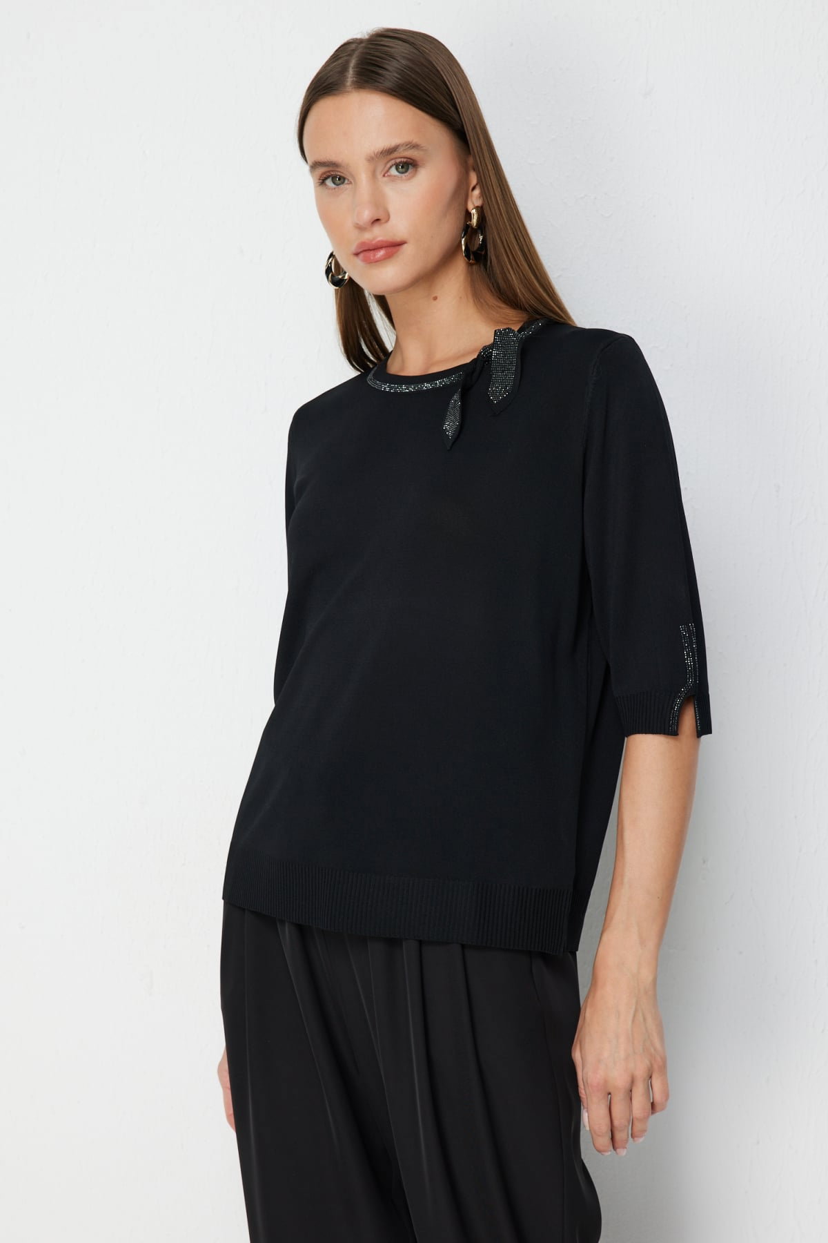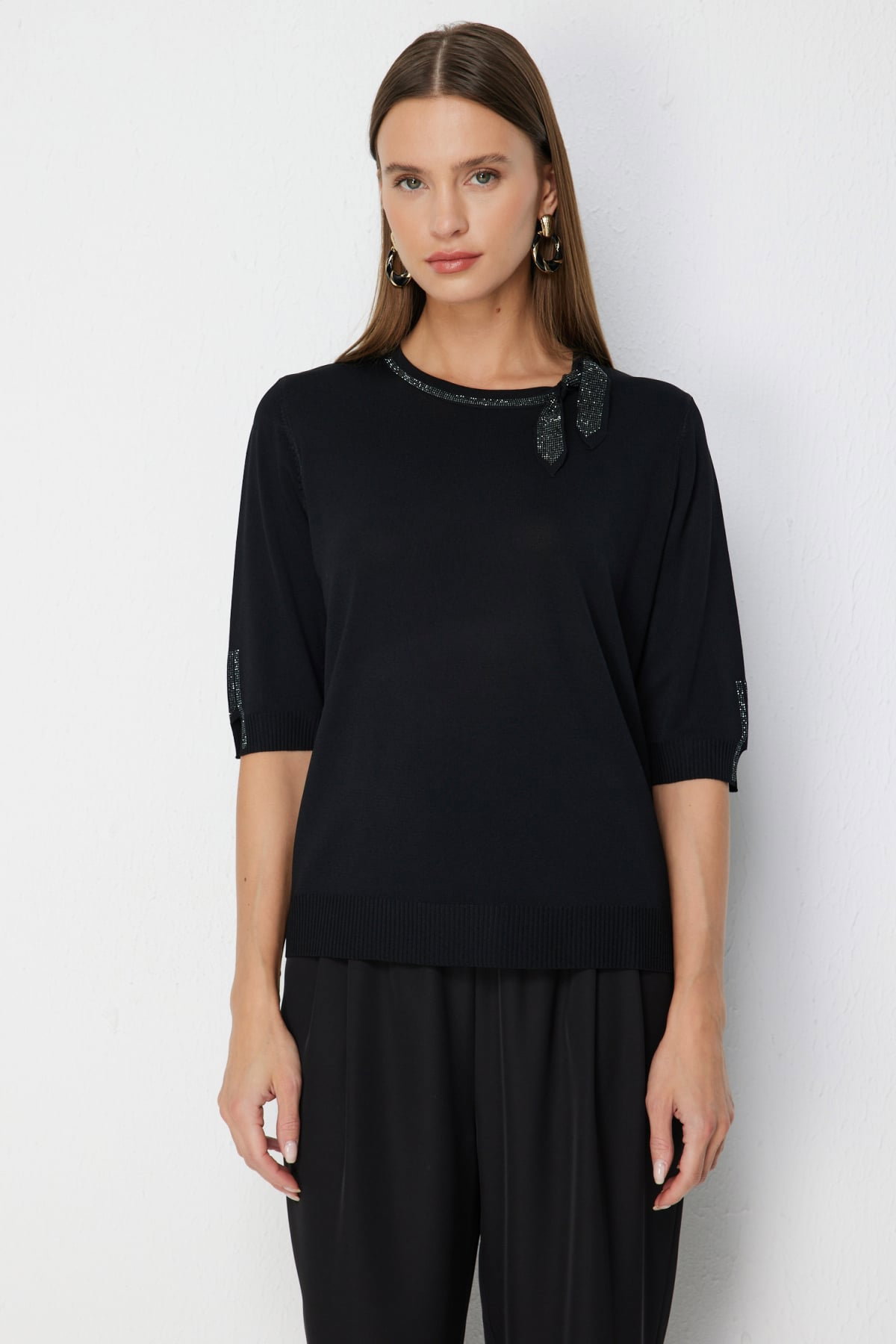 On Kadın Taş İşlemeli Kısa Kollu Bluz 70422 Siyah