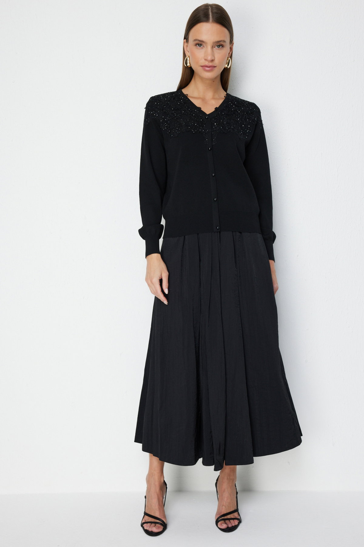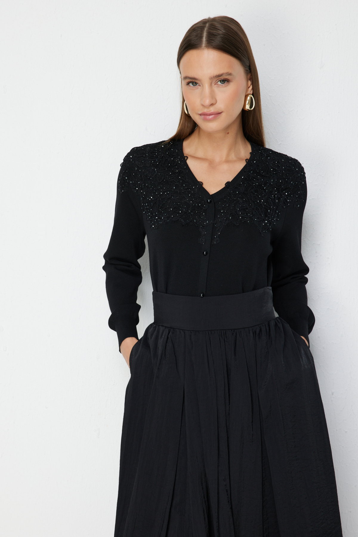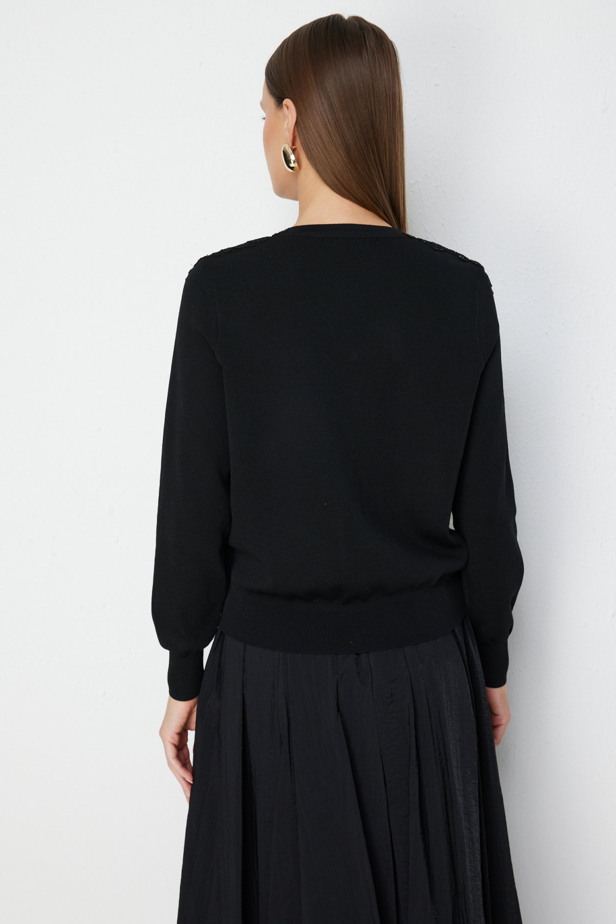 Detay: Triko kumaştan üretilen, astarsız yapıya sahip, V yaka ve uzun kollu bu bluz modern ve şık bir tasarıma sahiptir; astarsız oluşu hafiflik ve rahatlık sağlarken triko kumaşın esnek dokusu konforlu bir kullanım sunar, V yaka detayı feminen ve zarif bir görünüm kazandırır, uzun kollu form ise günlük kombinlerde hem şıklığı hem de rahatlığı bir arada sağlar;