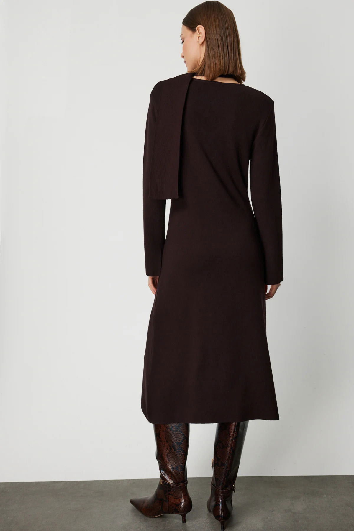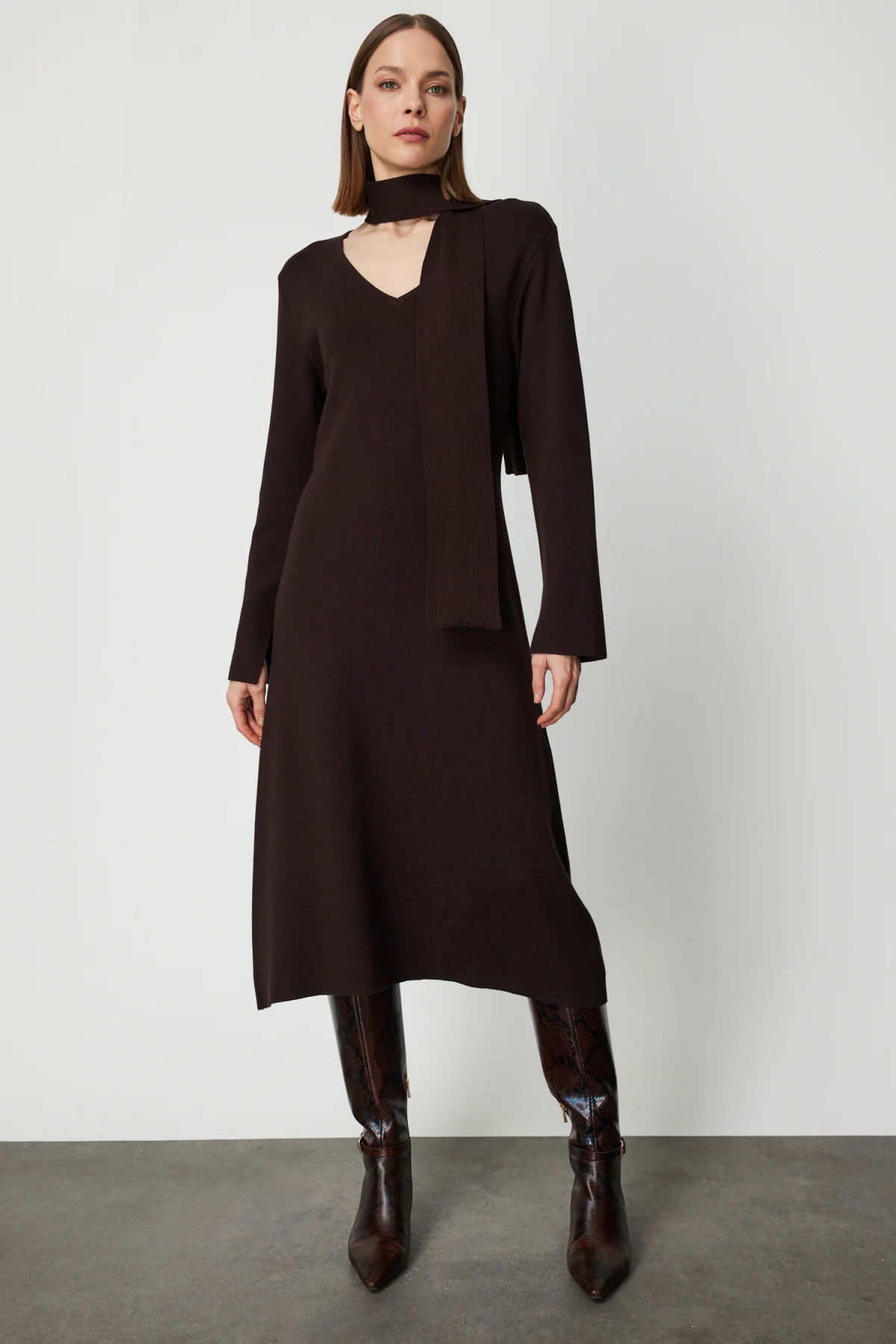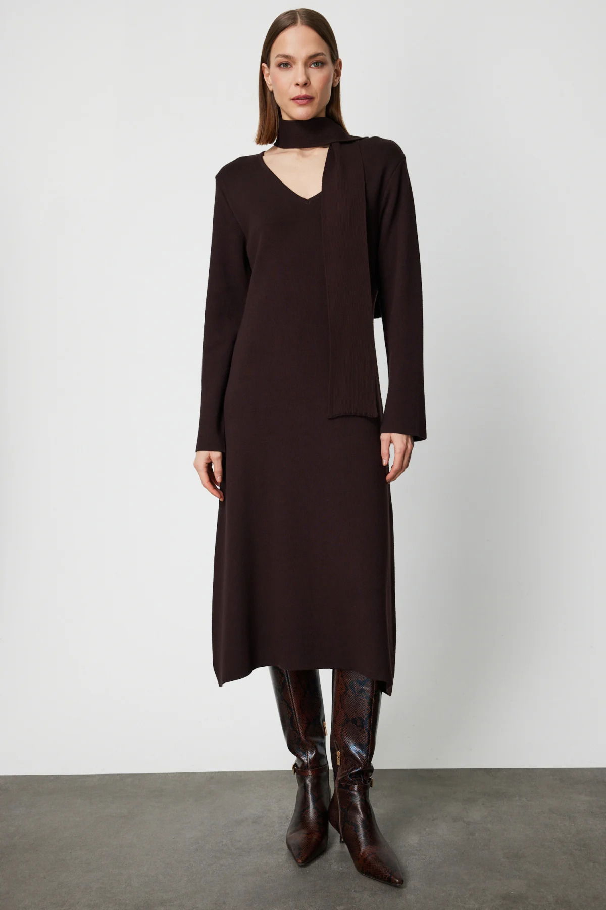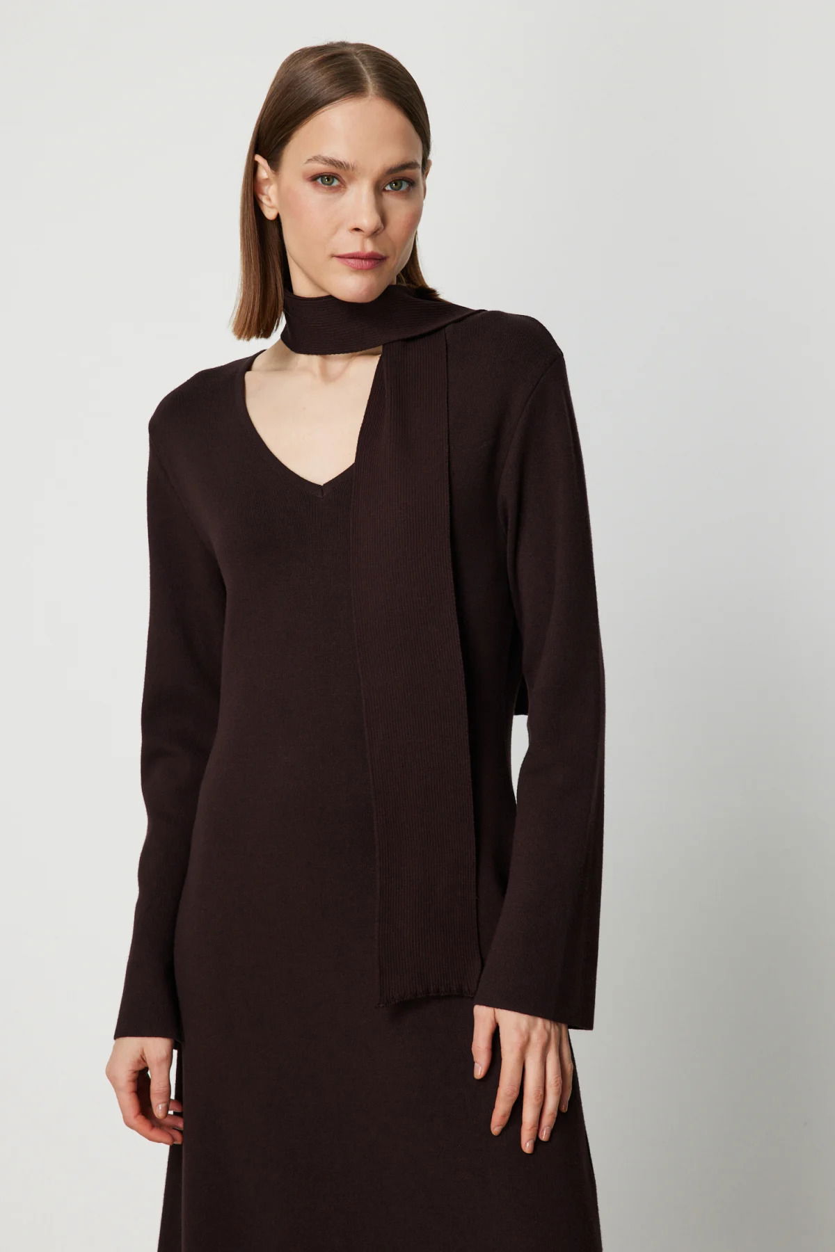 On Kadın V Yaka Kuşaklı Triko Elbise 63401 Kahverengi