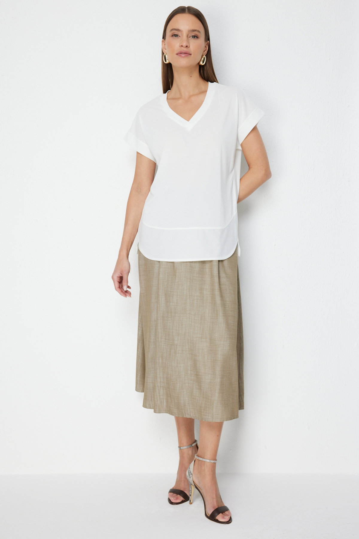 On Kadın V Yaka Parçalı T-Shirt 71475 Ekru