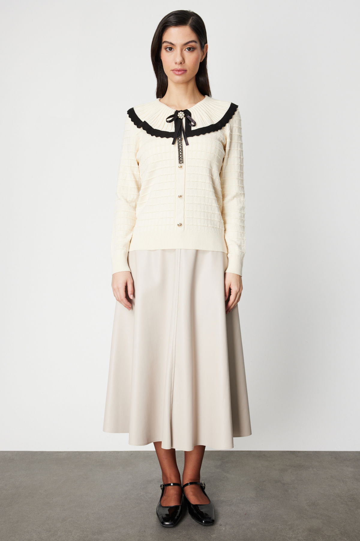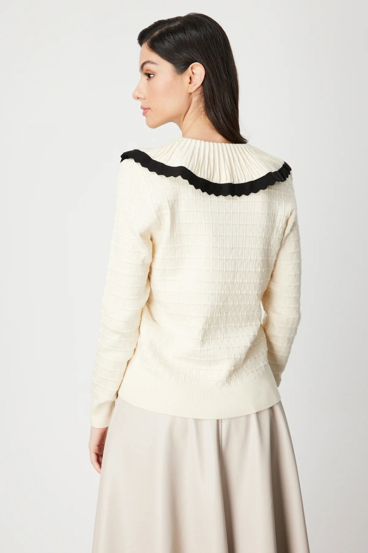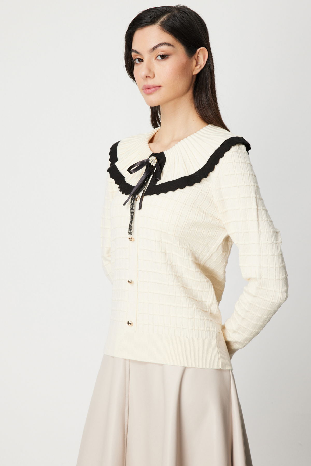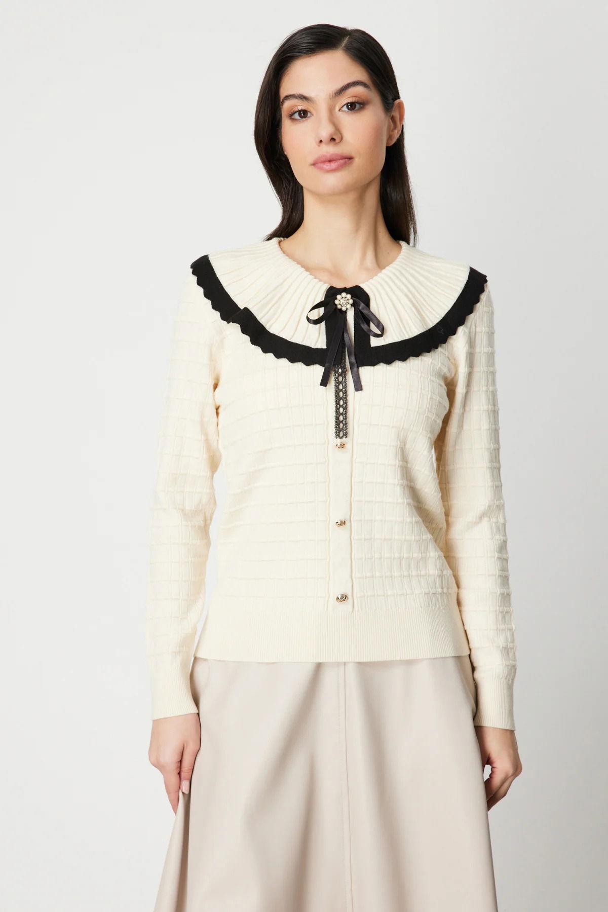 On Kadın Yakası Aksesuarlı Düğmeli Triko Kazak 66351 Krem-Siyah