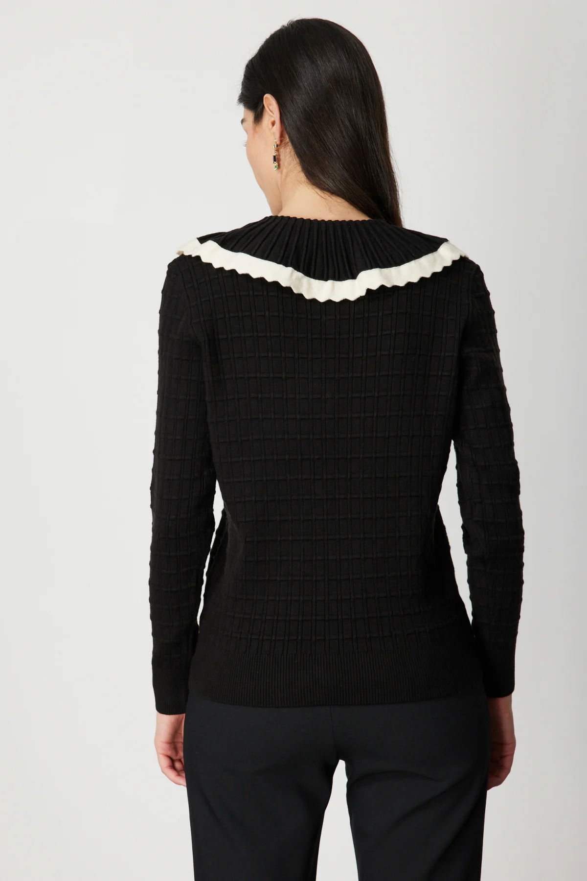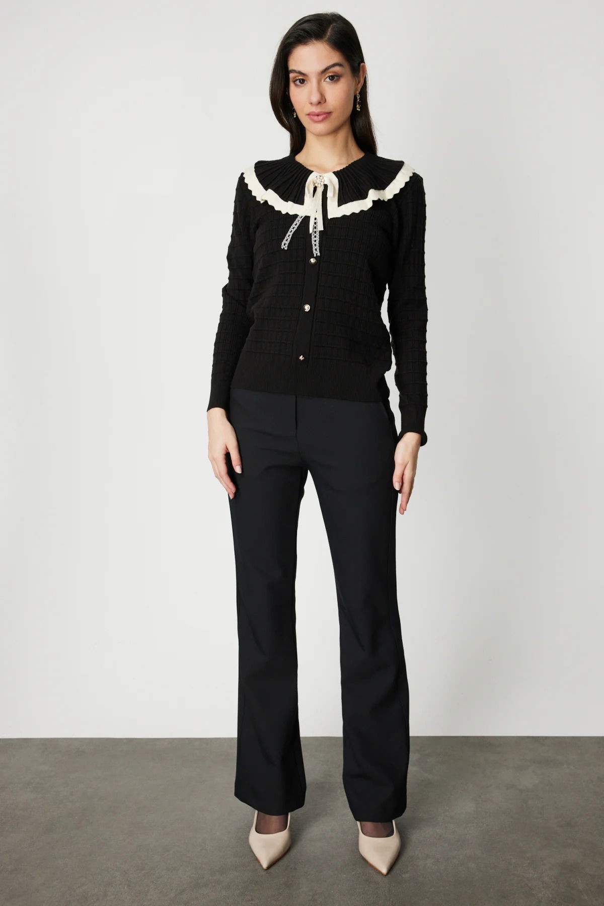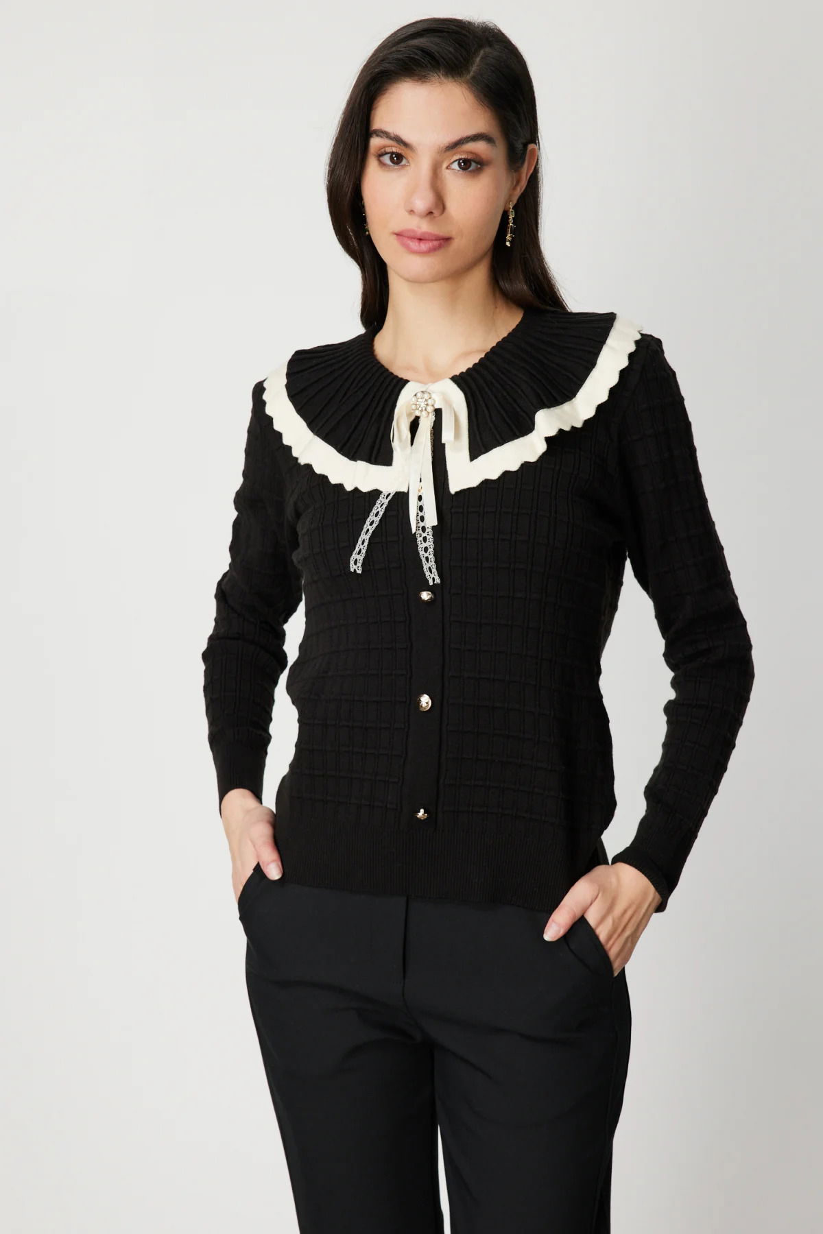 On Kadın Yakası Aksesuarlı Düğmeli Triko Kazak 66351 Siyah-Krem