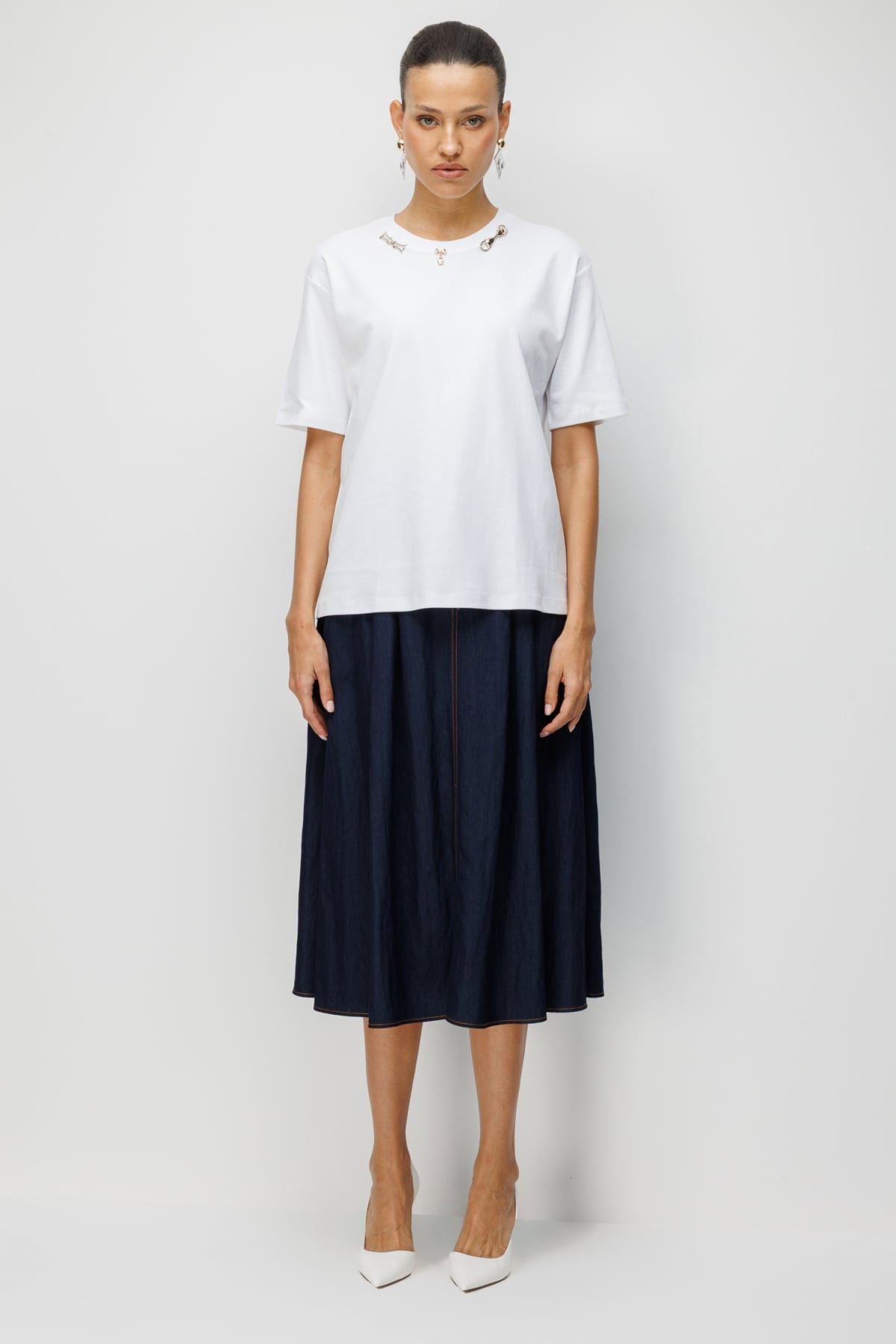 On Kadın Yakası Aksesuarlı Sıfır Yaka Pamuklu T-Shirt 71454 Beyaz