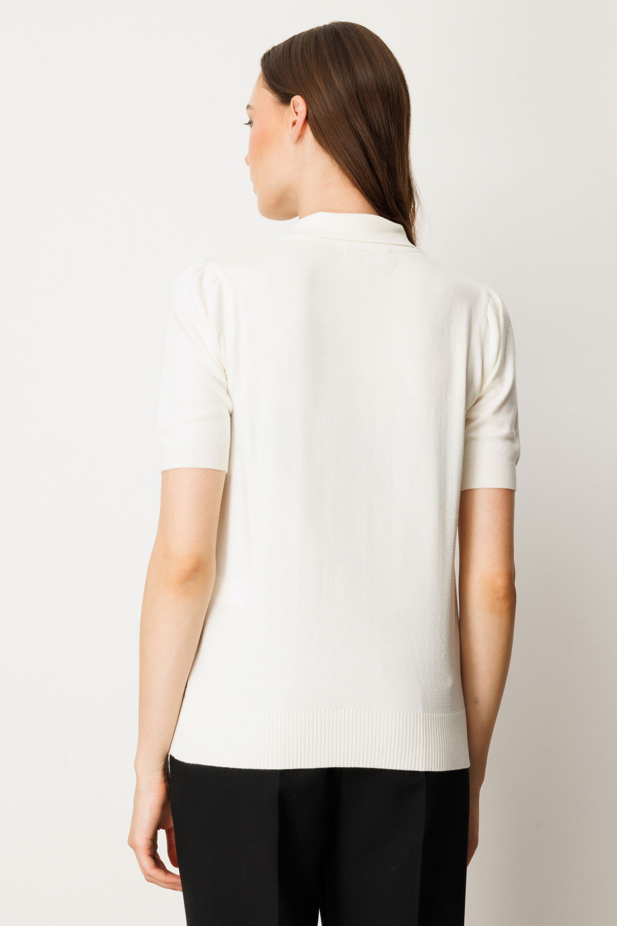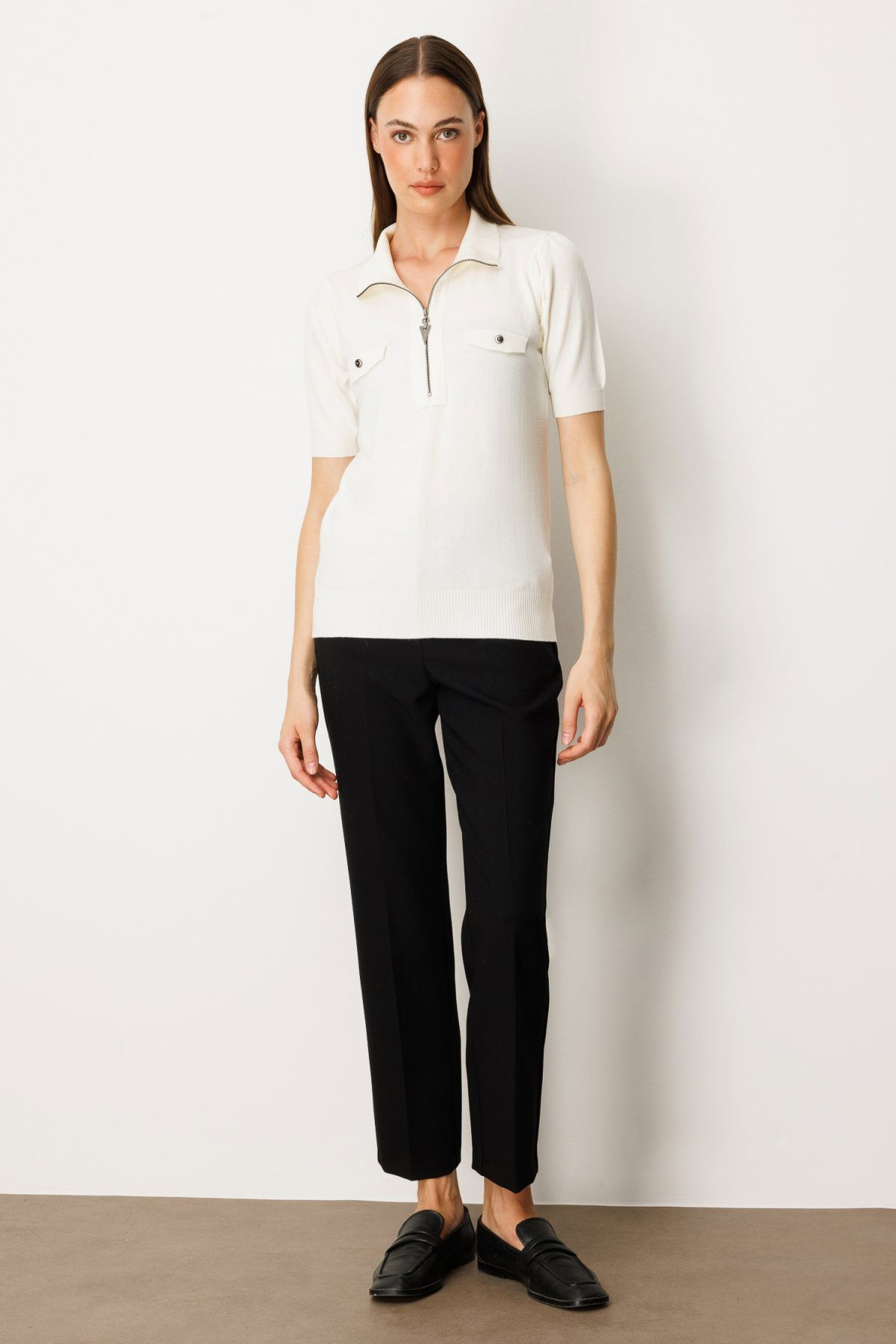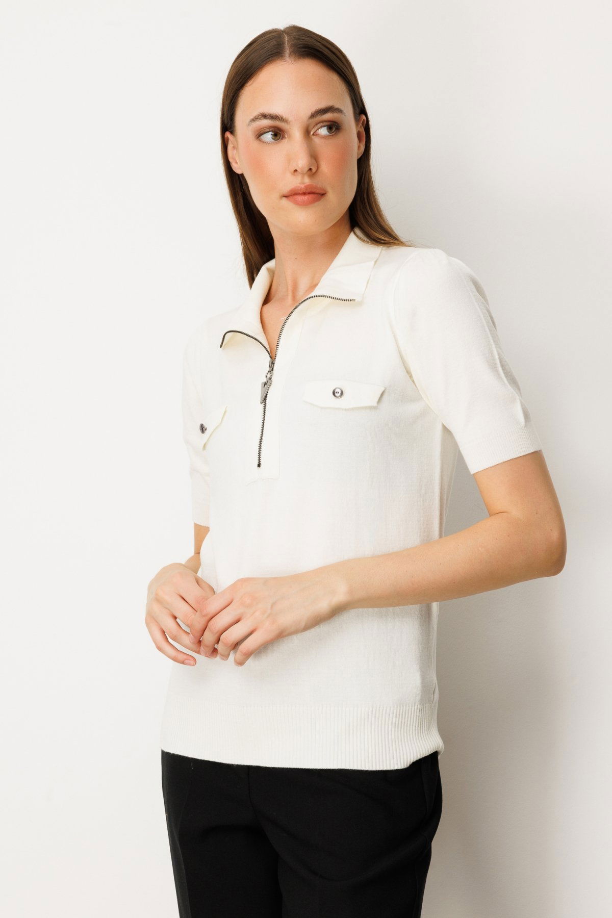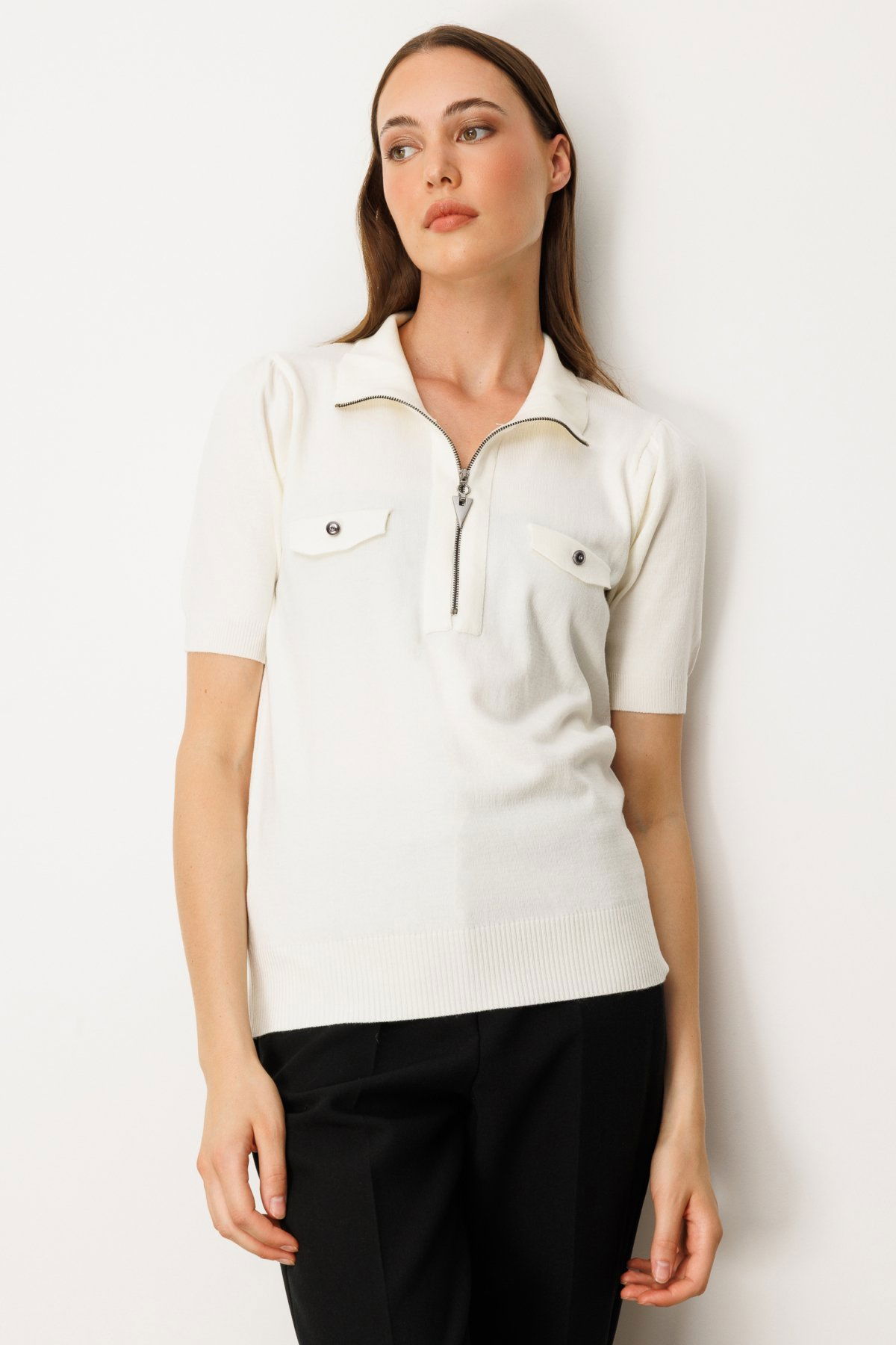 On Kadın Yakası Fermuarlı Kısa Kol Triko Kazak 65330 Ekru