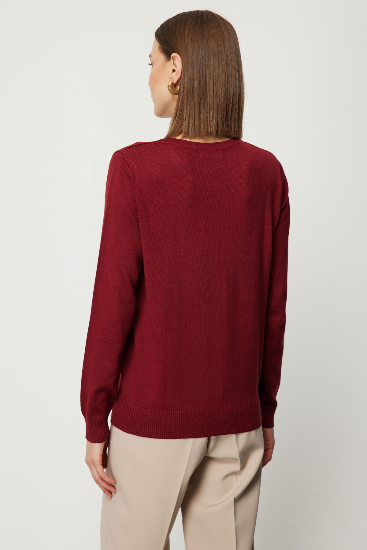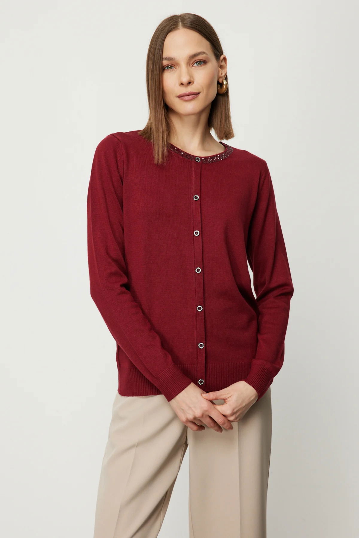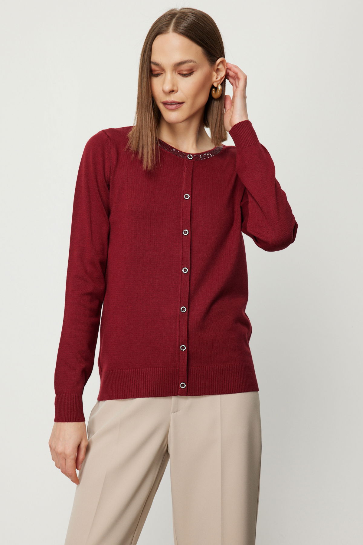 On Kadın Yakası Taşlı Düğmeli Triko Kazak 65393 Bordo