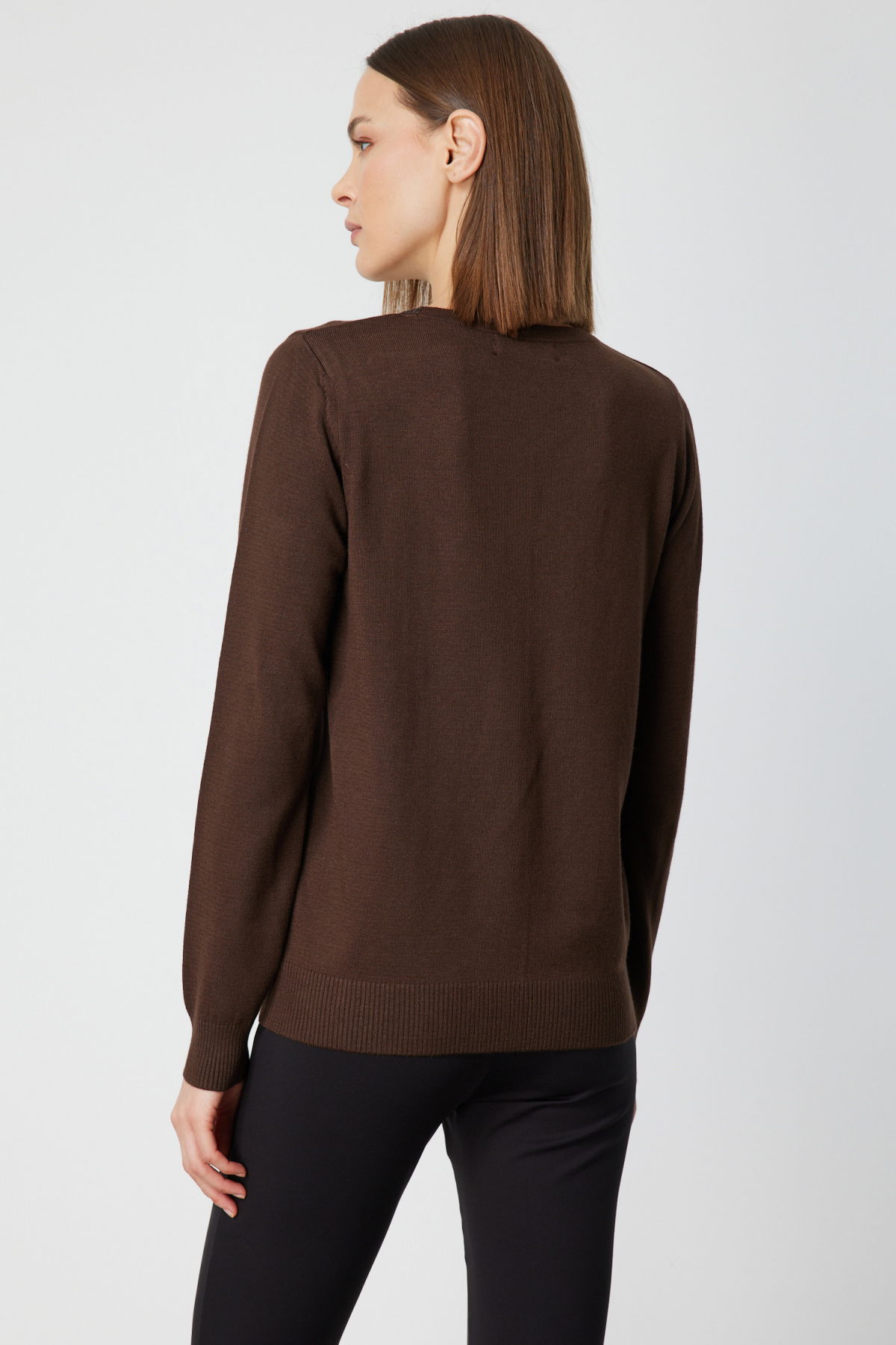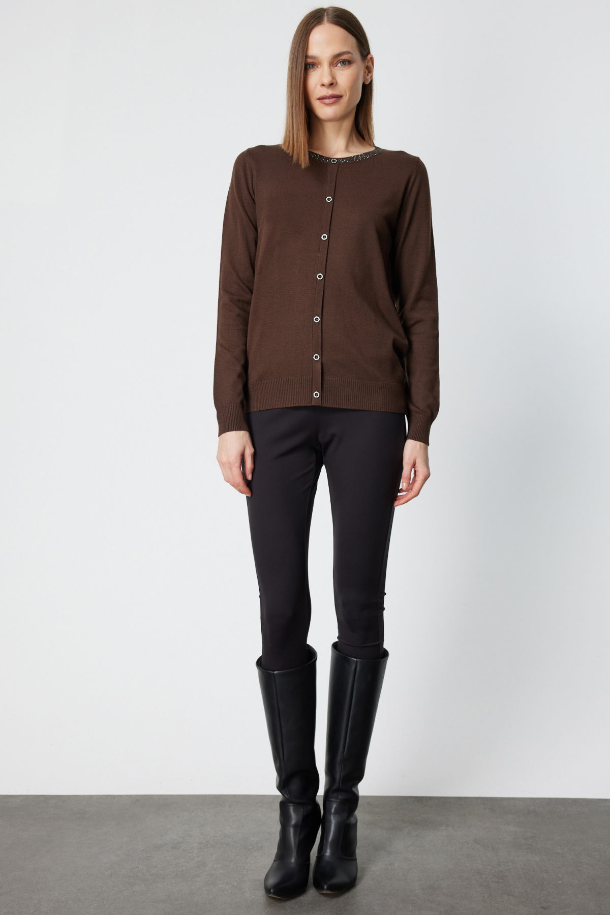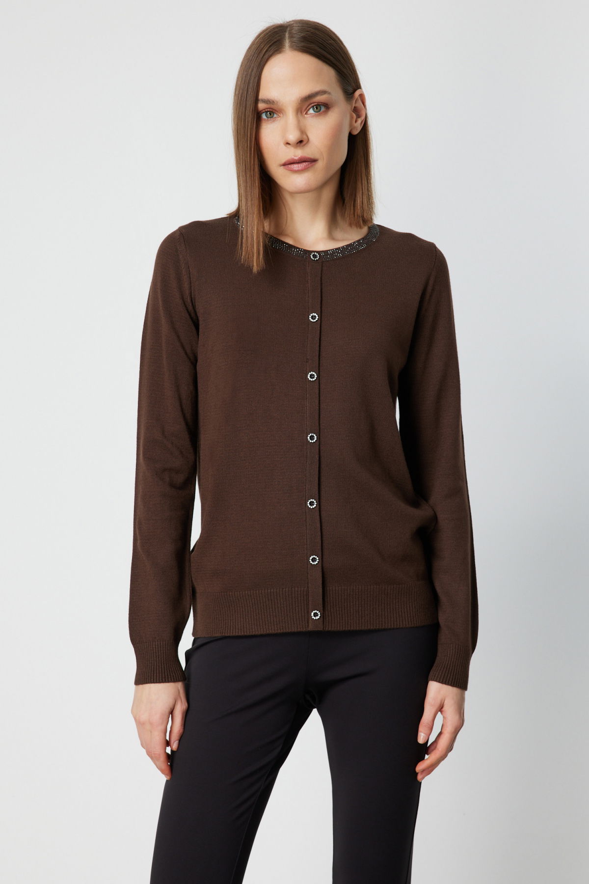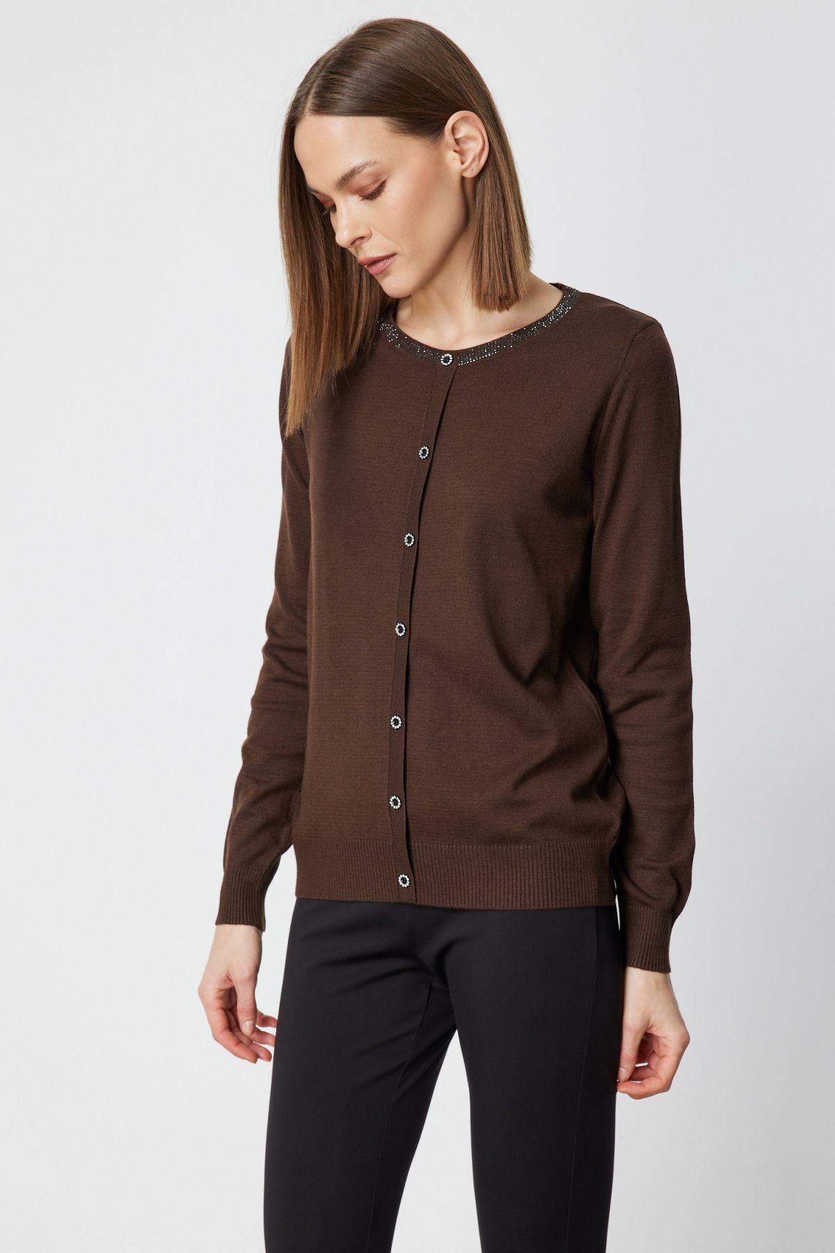 On Kadın Yakası Taşlı Düğmeli Triko Kazak 65393 Kahverengi