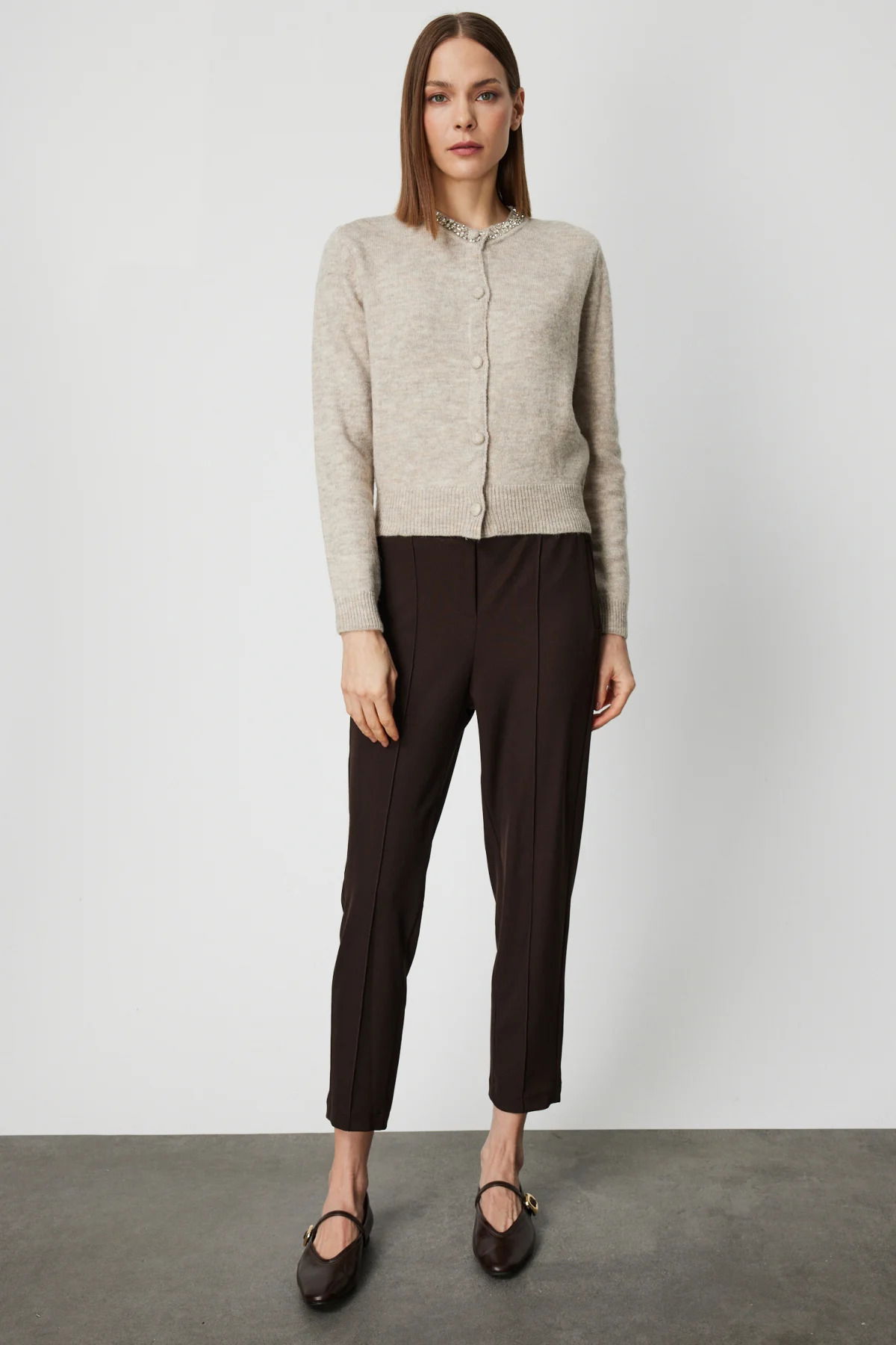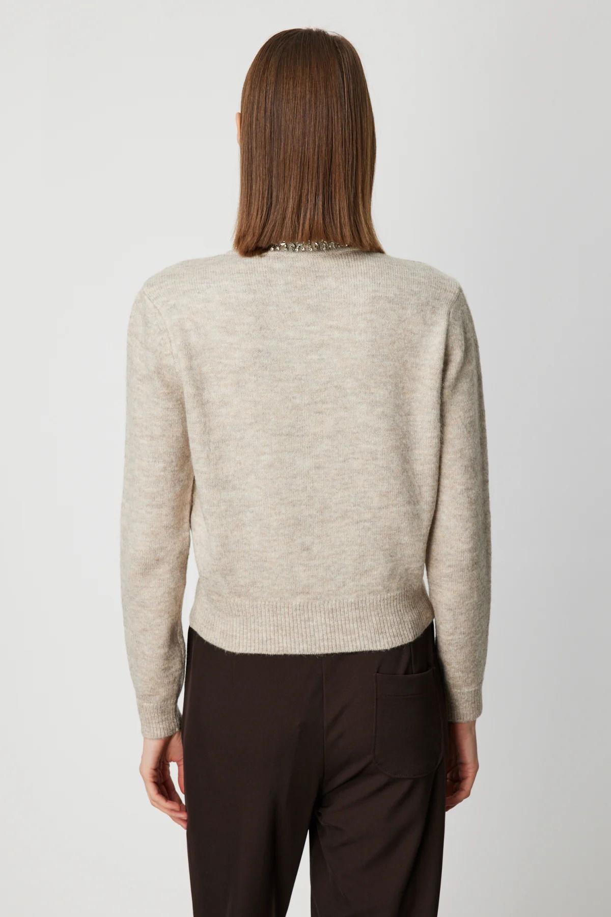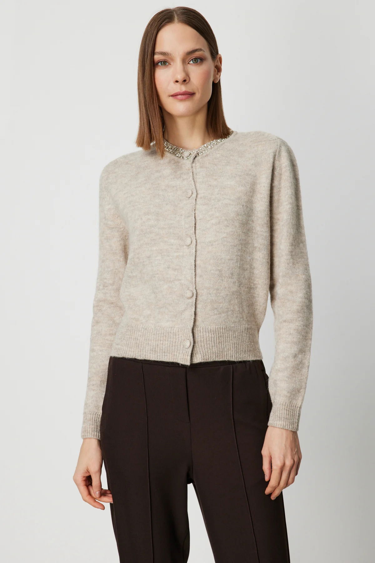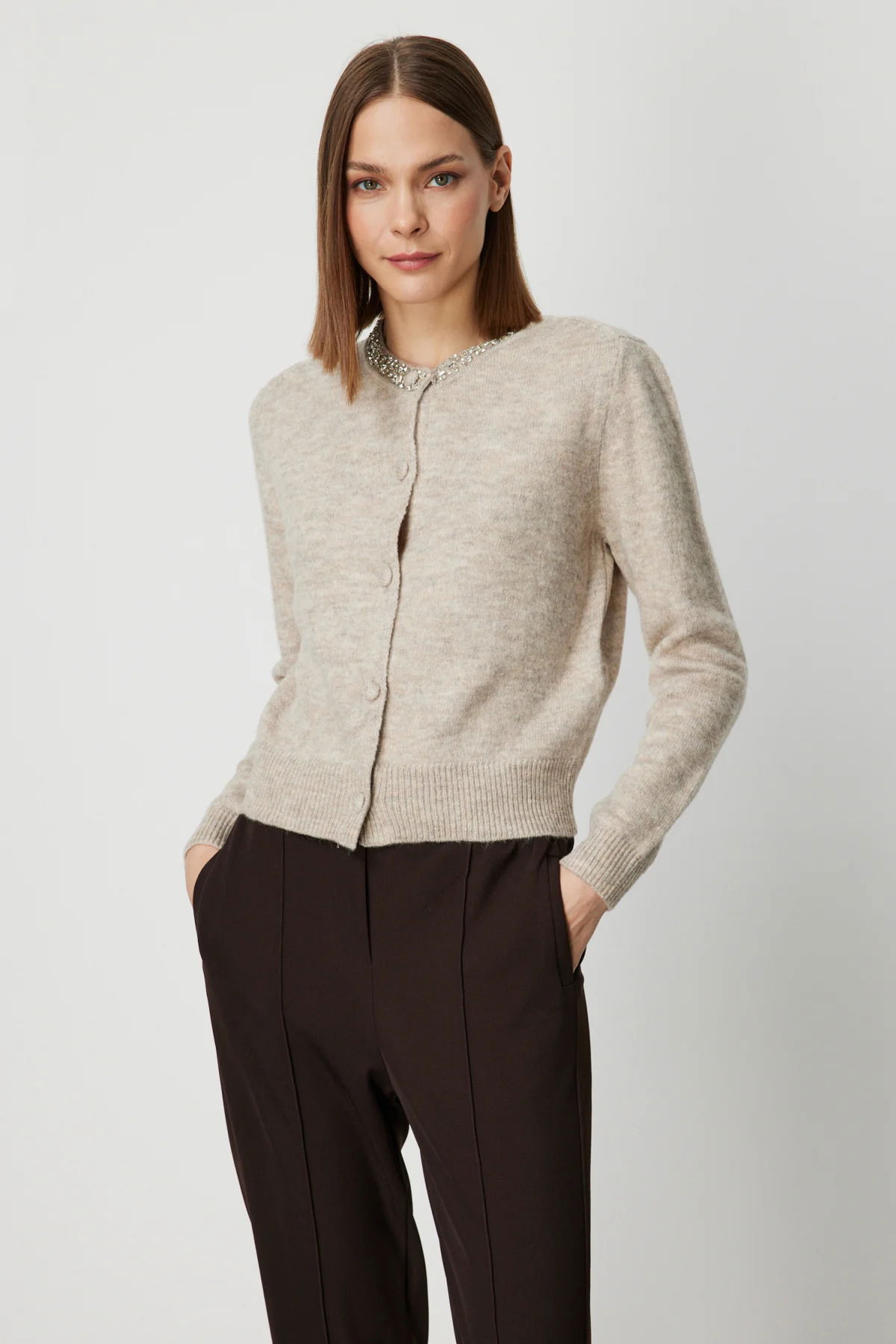 On Kadın Yakası Taşlı Triko Hırka 63927 Bej
