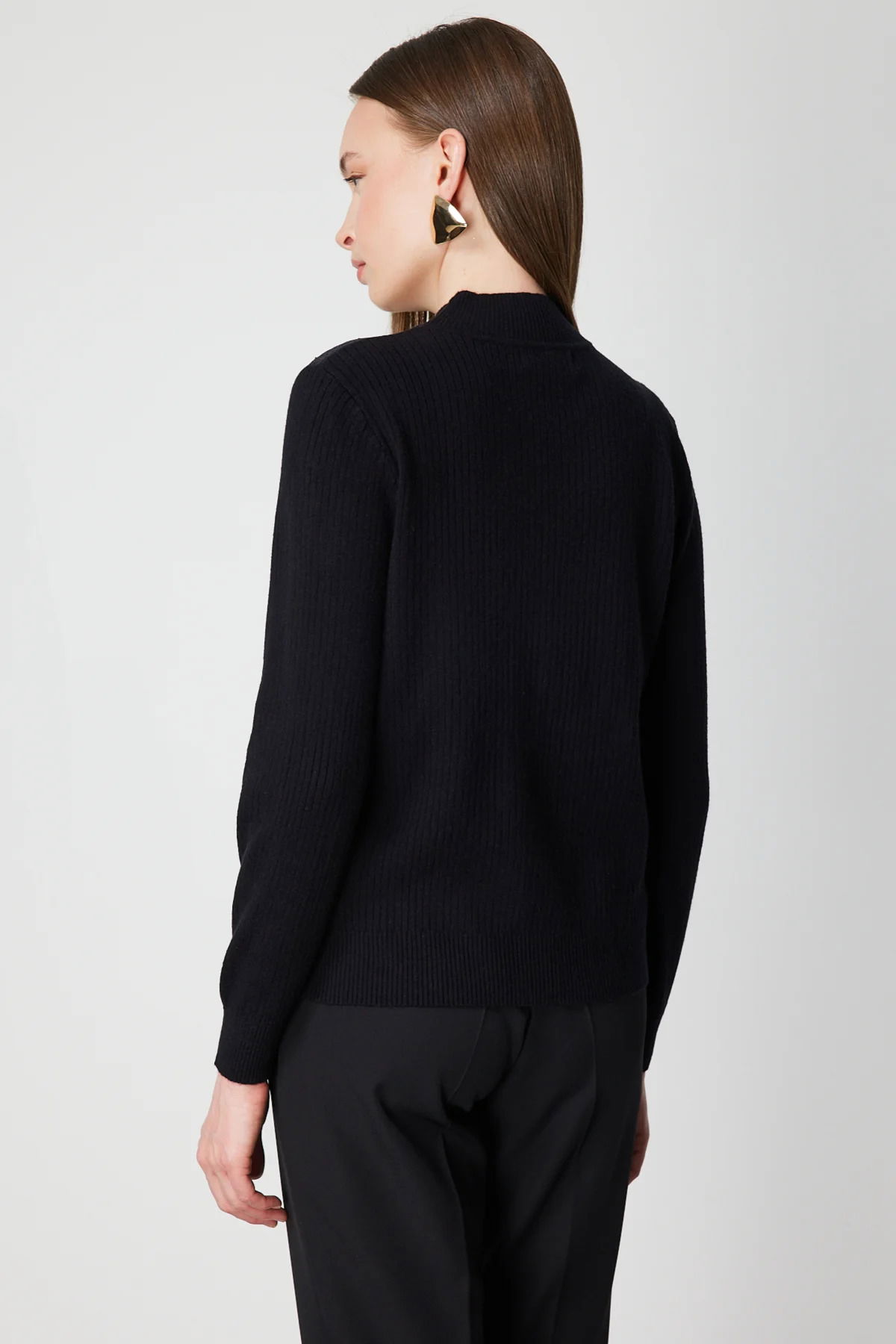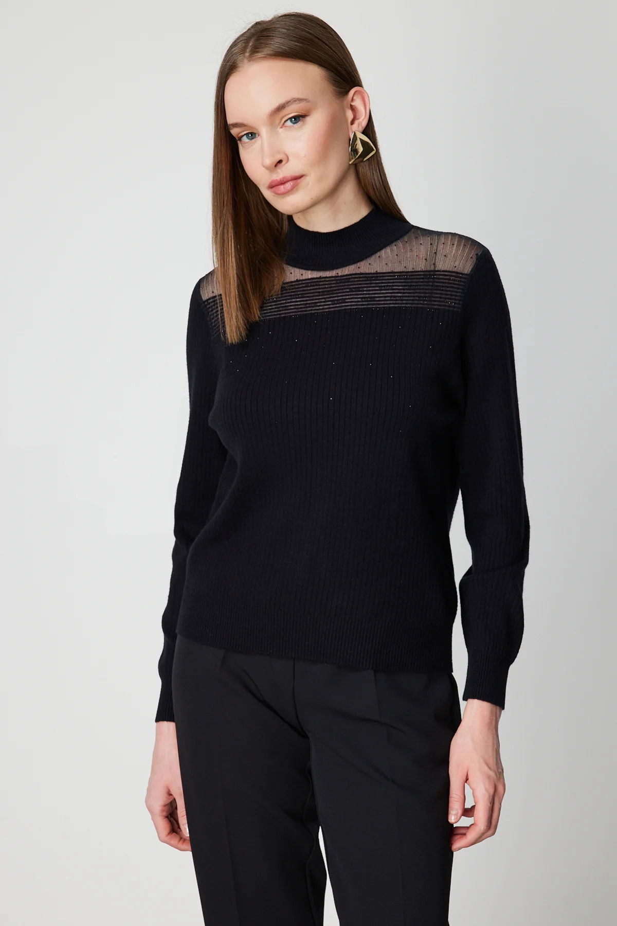 On Kadın Yakası Tül Detaylı Taşlı Triko Kazak 60343 Siyah