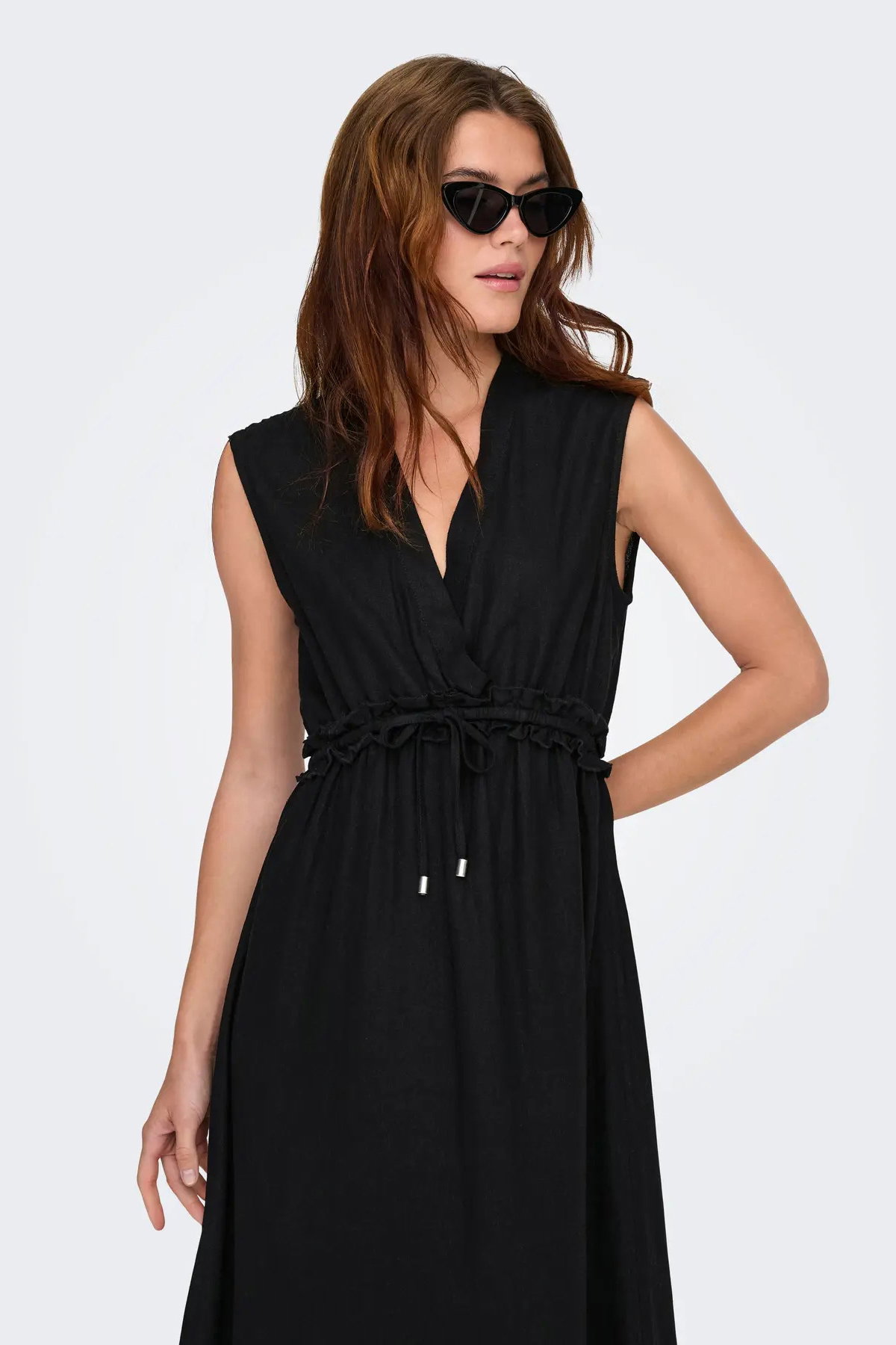 Only Kadın Onlgoa Kruvaze Yaka Beli Lastikli Keten Maxi Elbise 15363694 Siyah