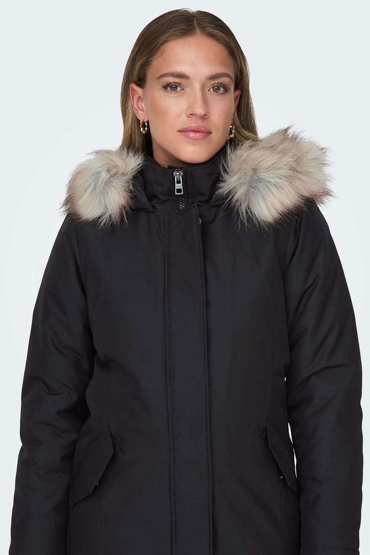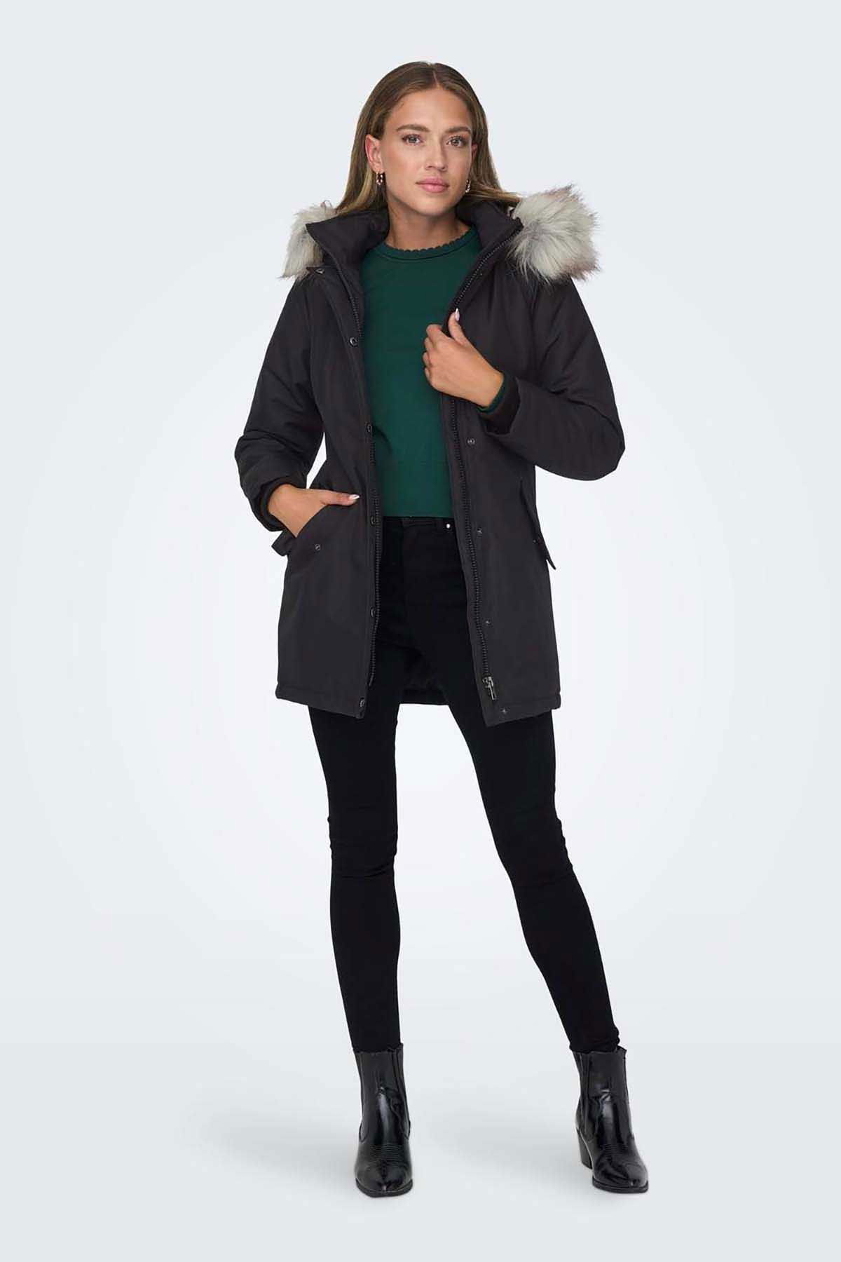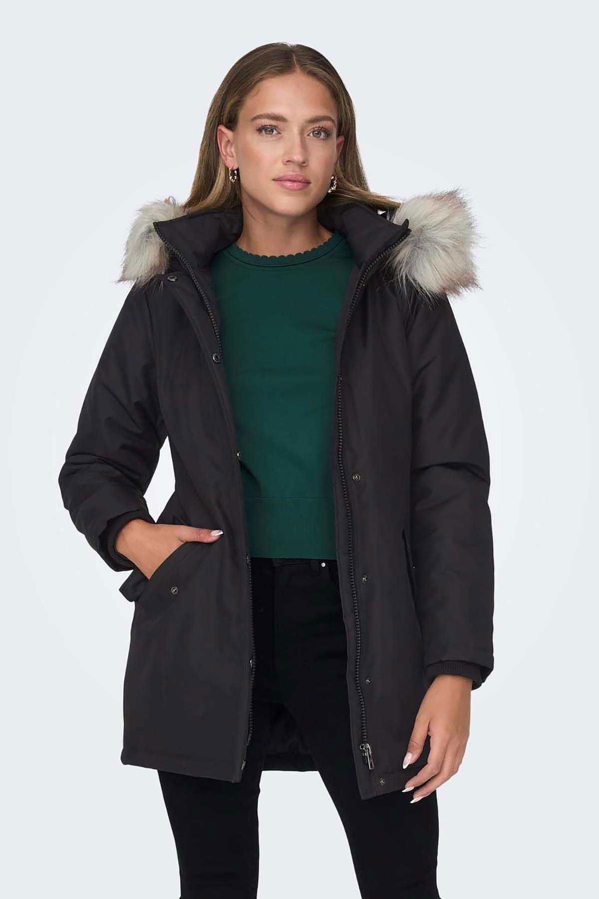 Detay: Suni çıkarılabilir kürk, yan cepli, midi boy mont;